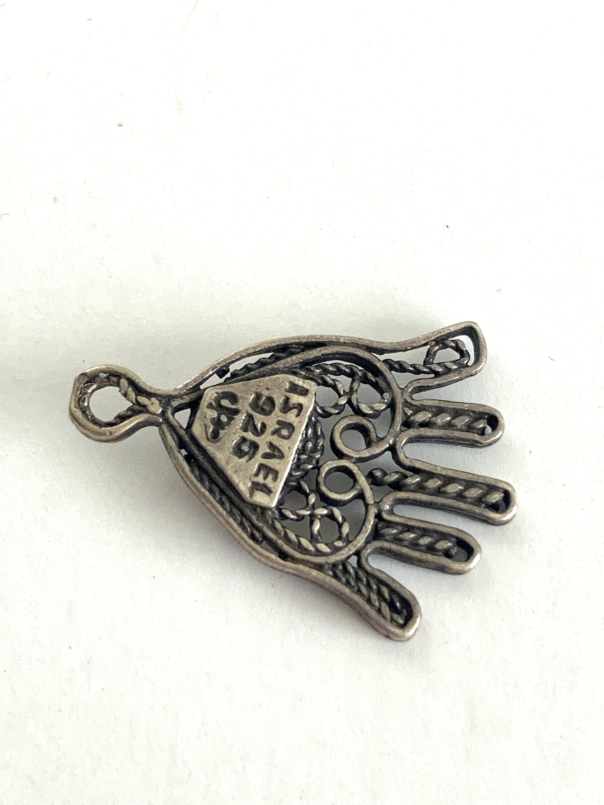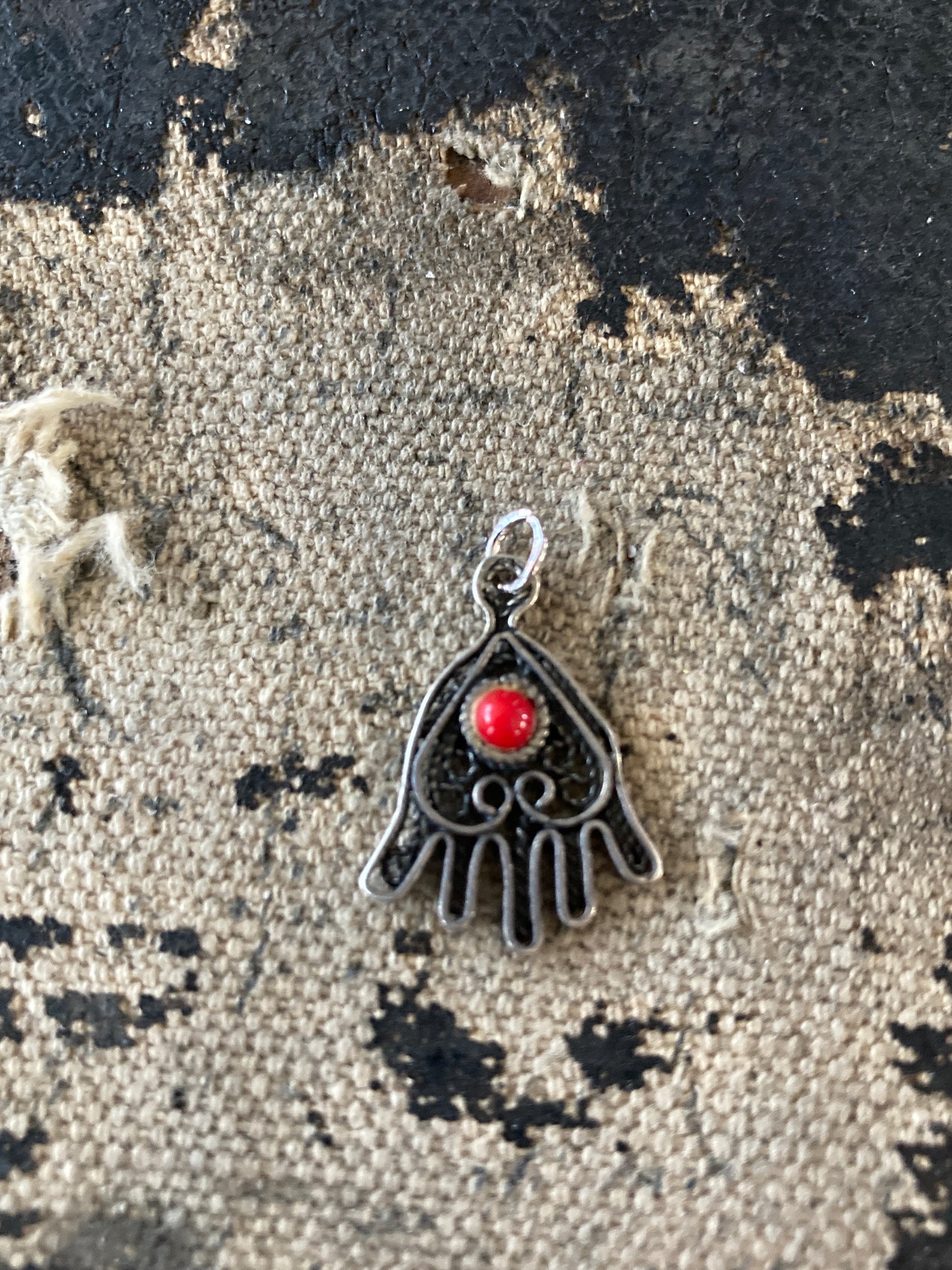 A dainty charm that would fit nicely on a charm bracelet or worn as a pendant. Created in sterling silver filigree depicting a hand with open fingers and featuring a heart centered by a single red coral tiny cabochon. Originally purchased in Israel in the 1970s. This piece has a beautiful patina. It hangs from a silver jump ring.