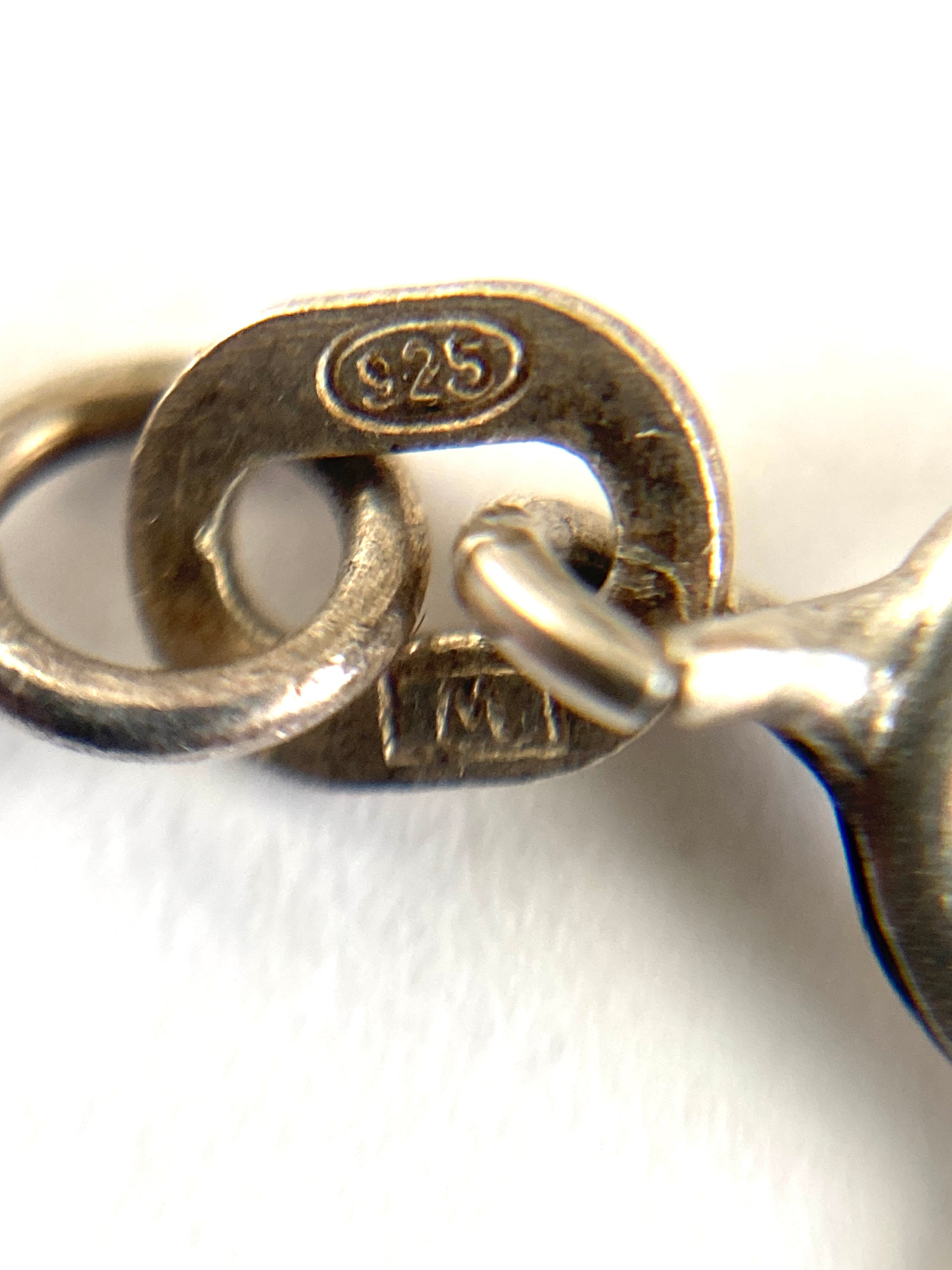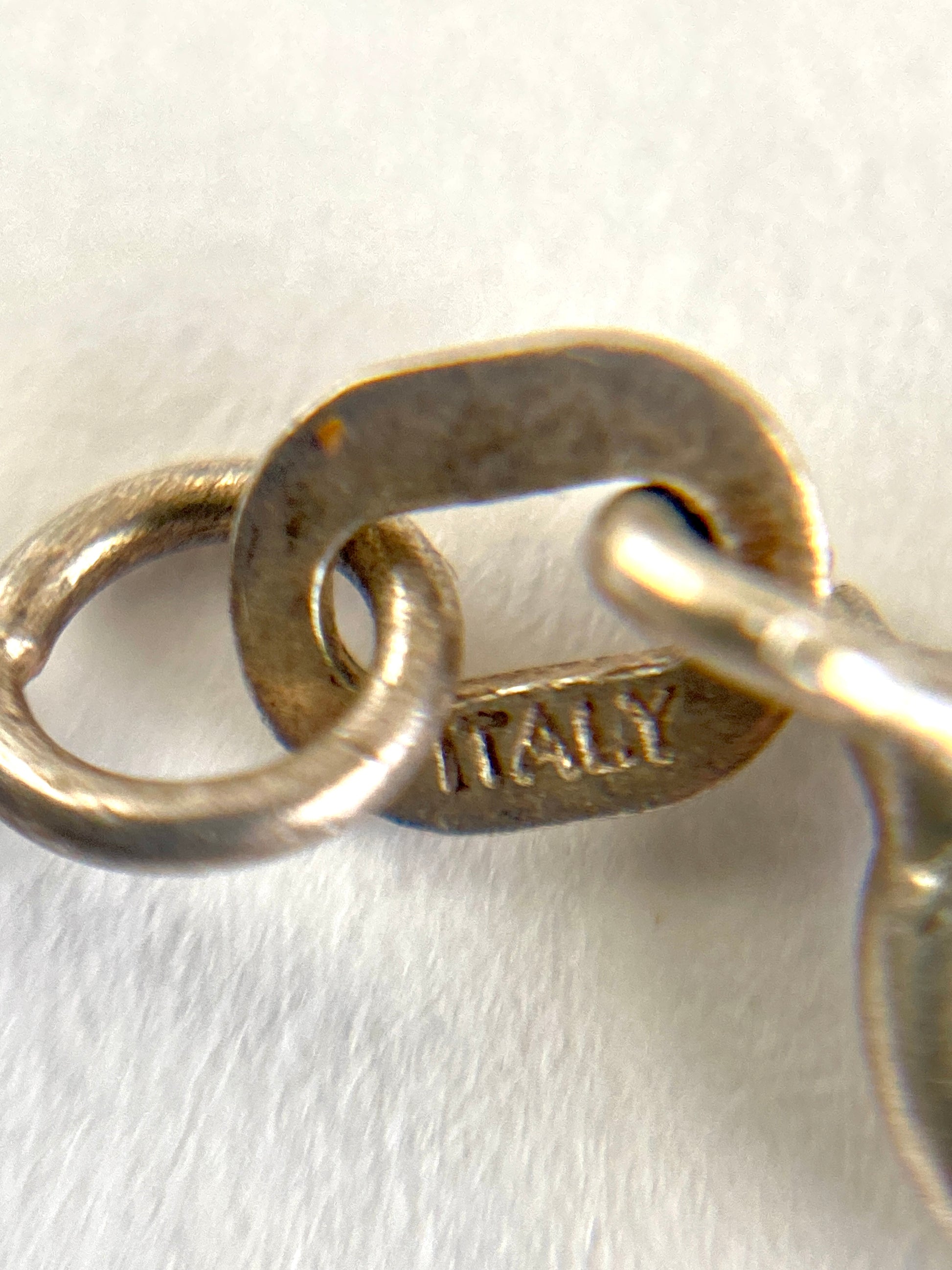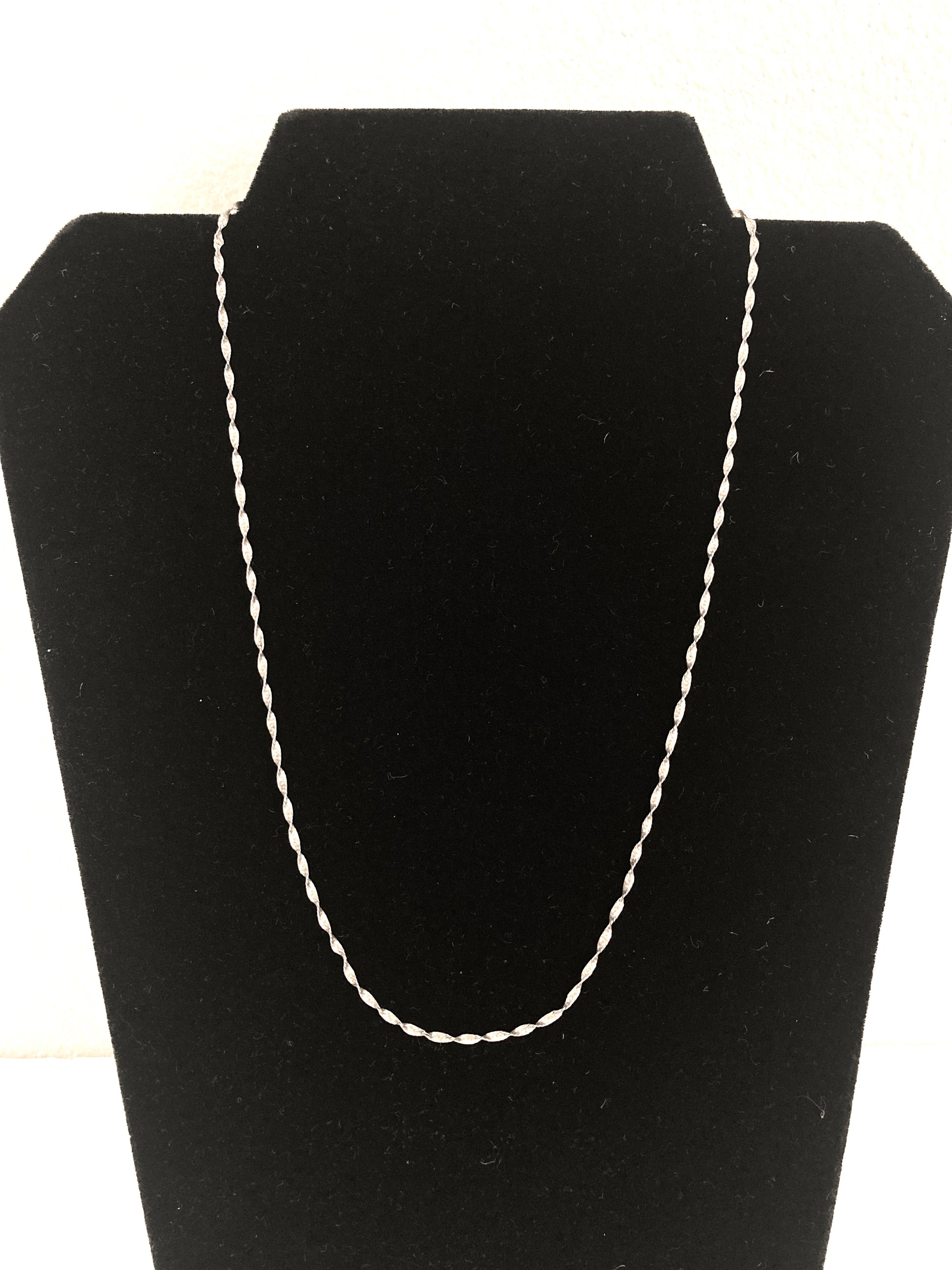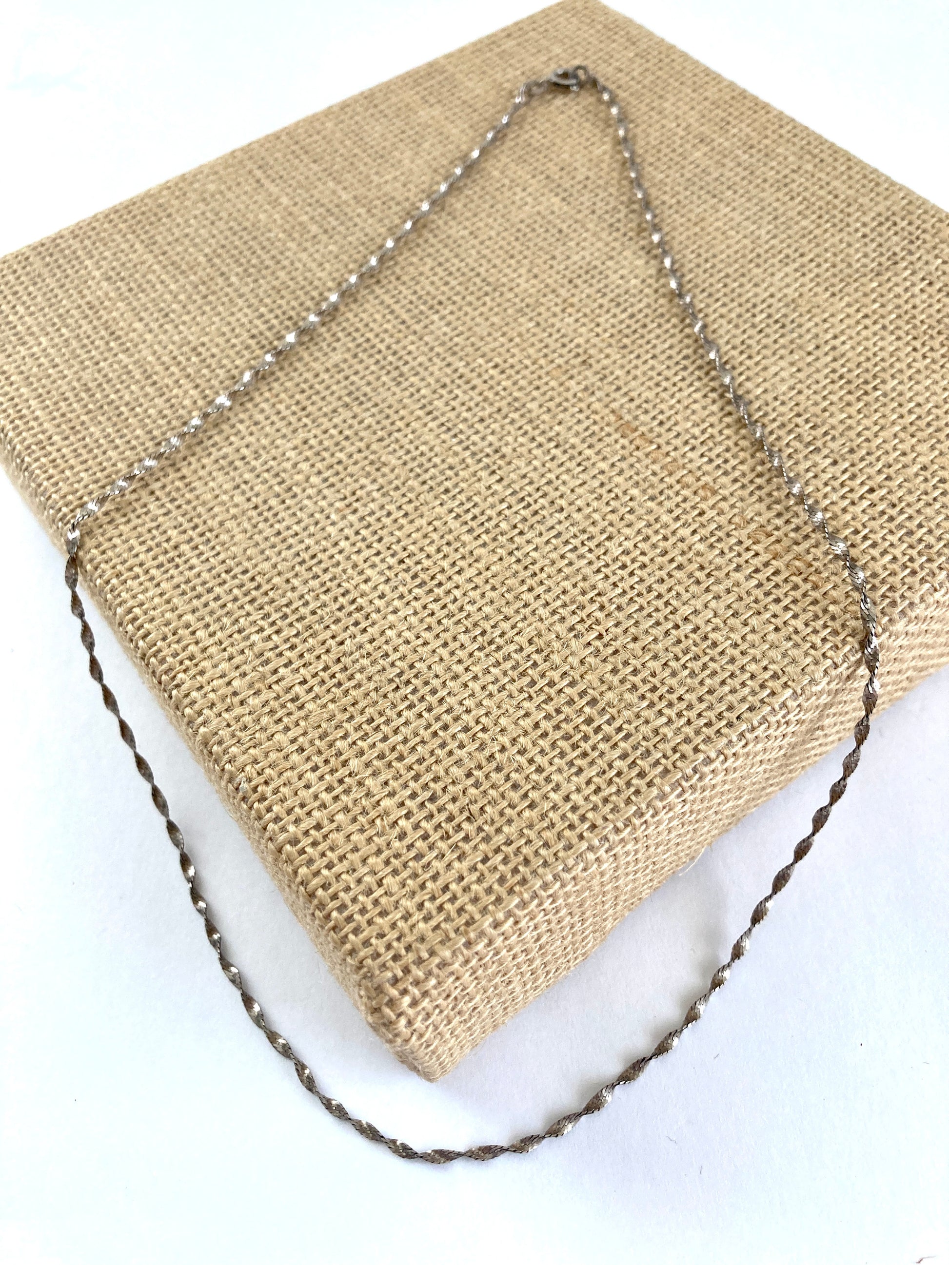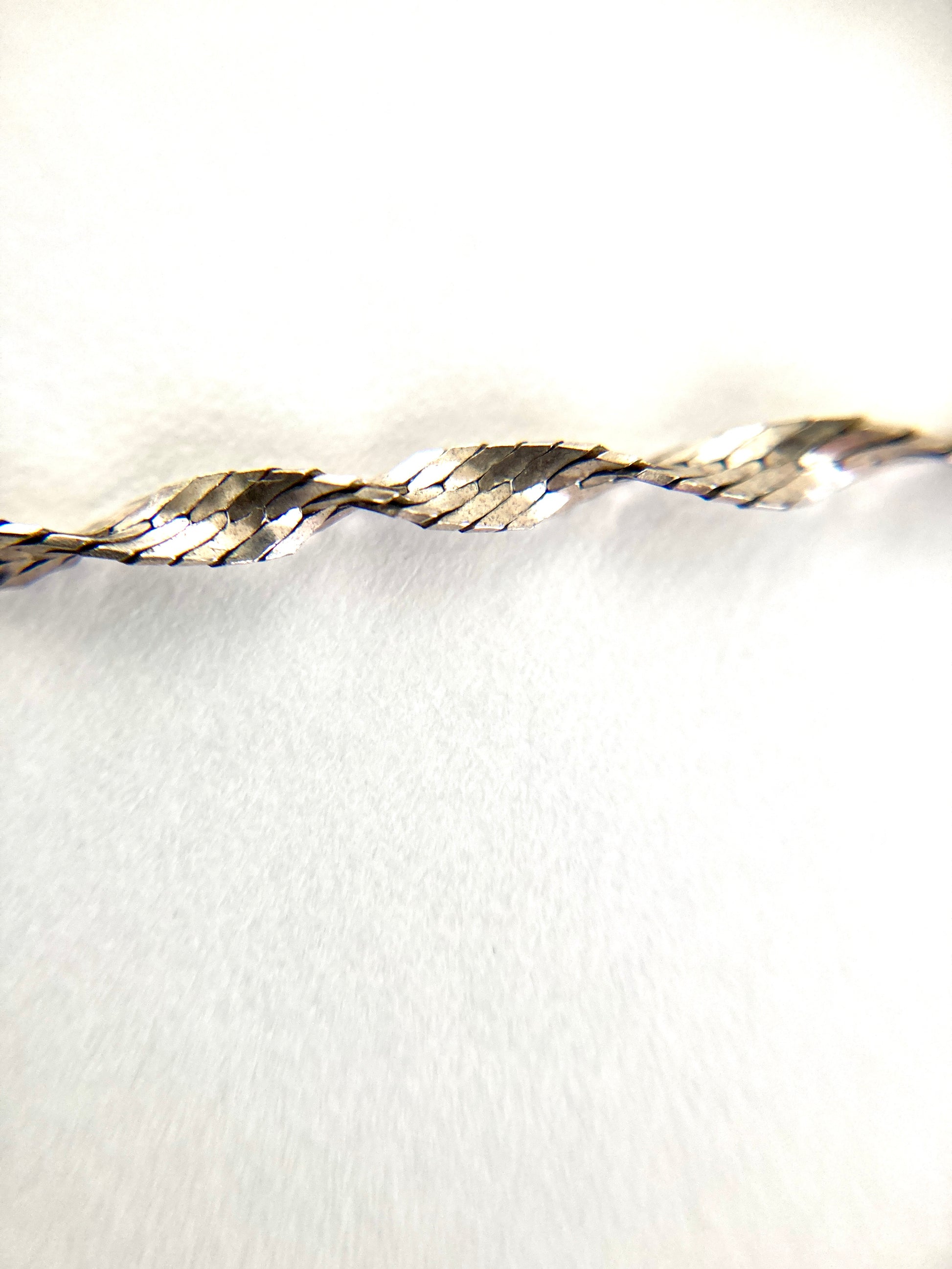 Delicate with an aged patina, this slim twisted herringbone chain is just right for adding a pendant or worn as part of a layered look. At 20 inches long it sits just at the hollow of the neck. Thin and dainty it's a lovely necklace. Marked Italy on one side of the clasp and 925 M on the other. It features a round spring ring clasp.