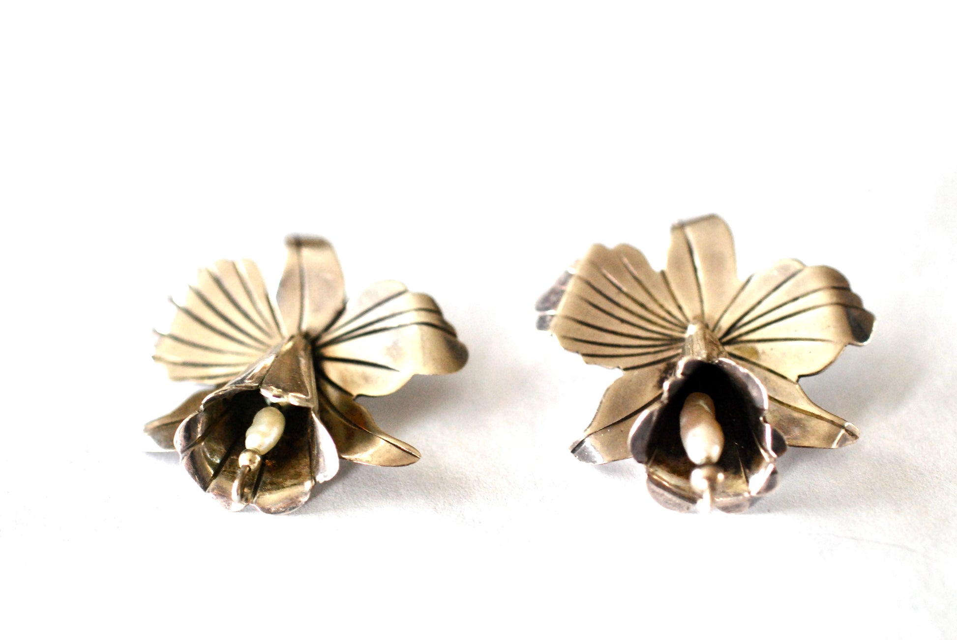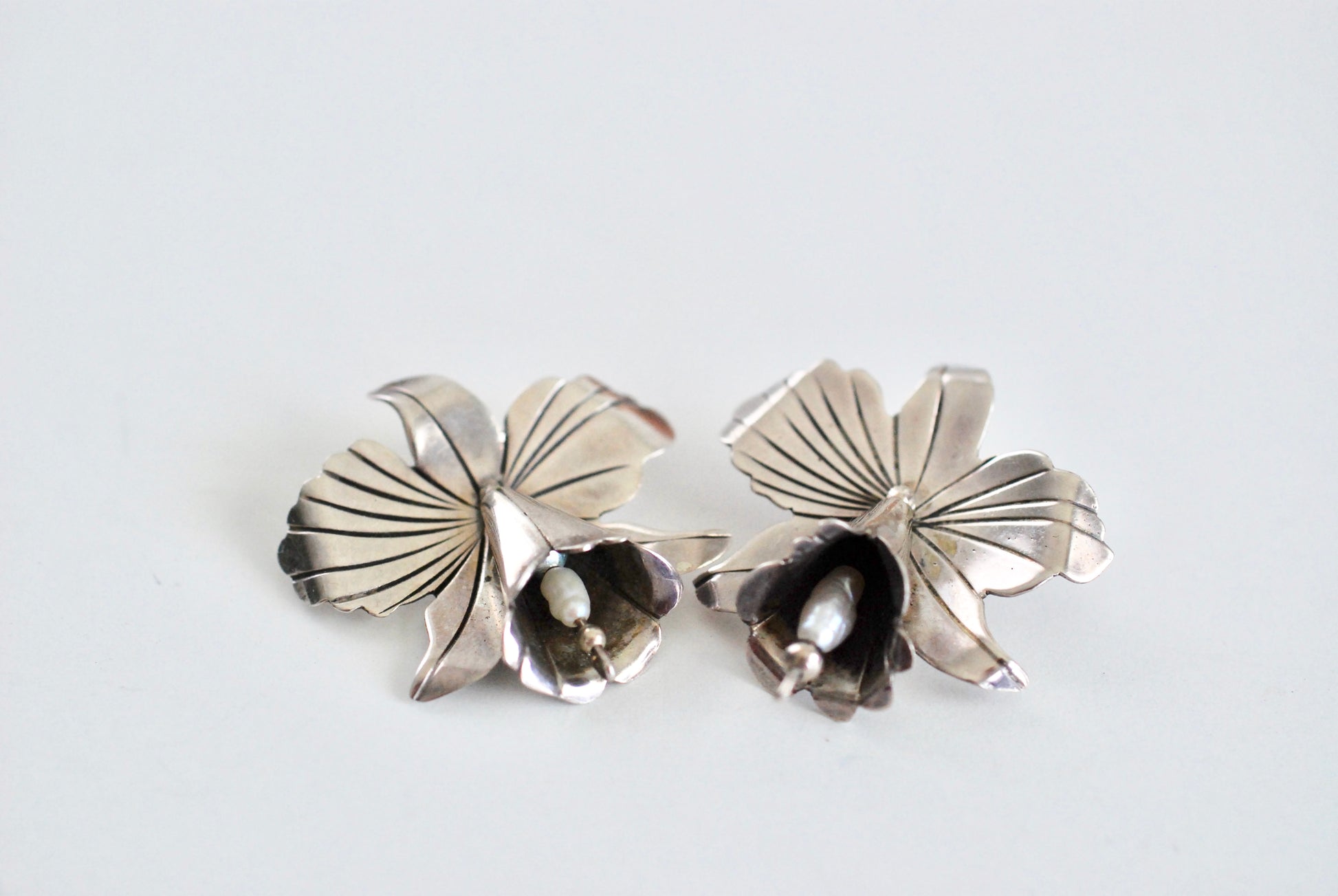 An absolutely gorgeous pair of sterling silver hand made orchids finished off with slim baroque pearl stamens. Each one is just slightly different due to the handmade nature of the beautiful artwork. These are pierced stud type earrings. Unmarked by the maker but tested as sterling silver. These would make a fantastic gift.