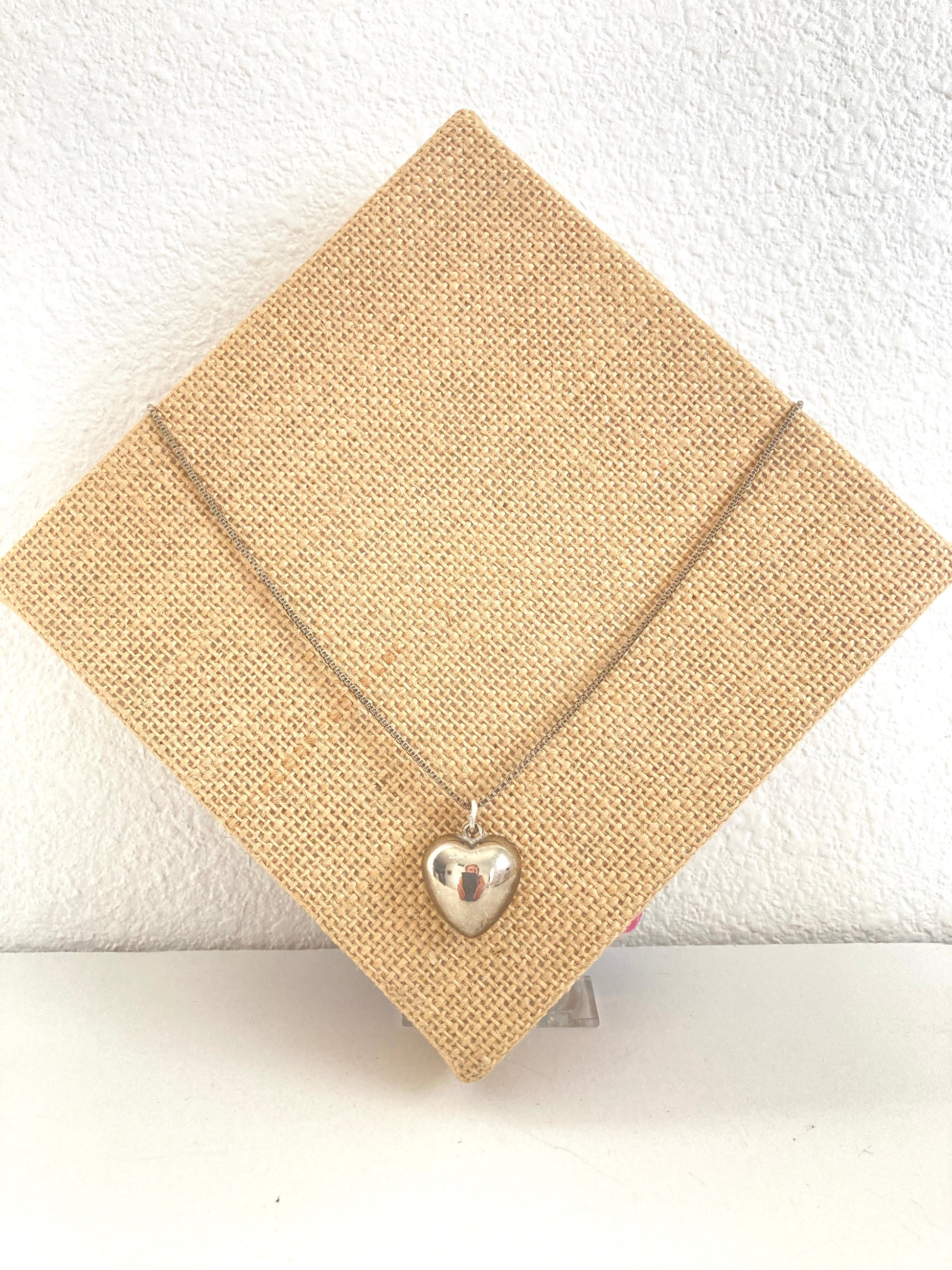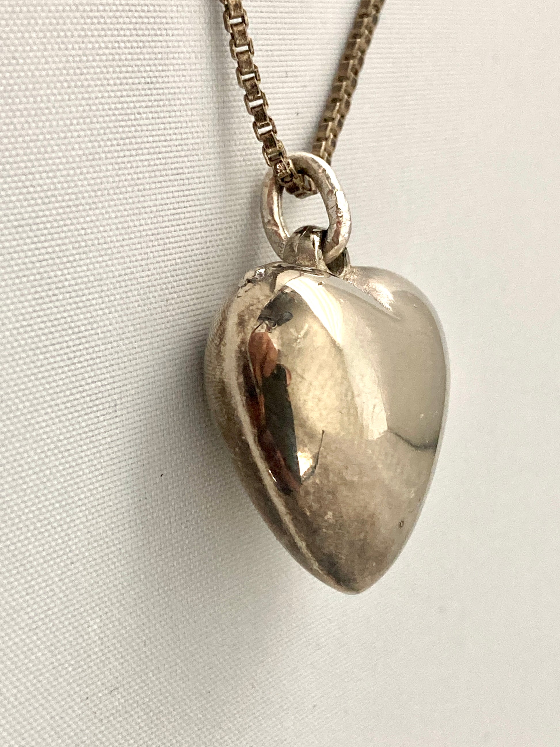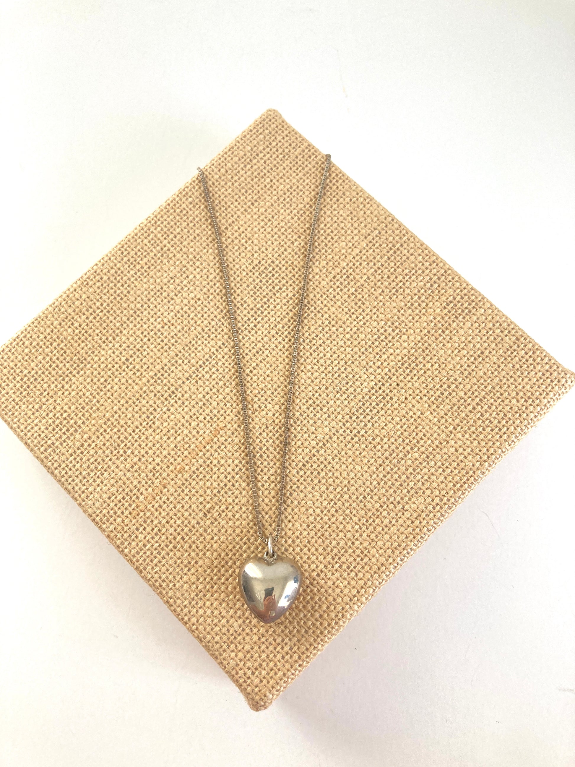 Tell her how much you love her with this sterling silver puffy heart necklace. It hangs from a 22" sterling box chain. The heart is hollow silver and light as a feather. The box chain is sturdy enough to wear every day so she will always be reminded of you. A lovely gift for a friend or loved one.