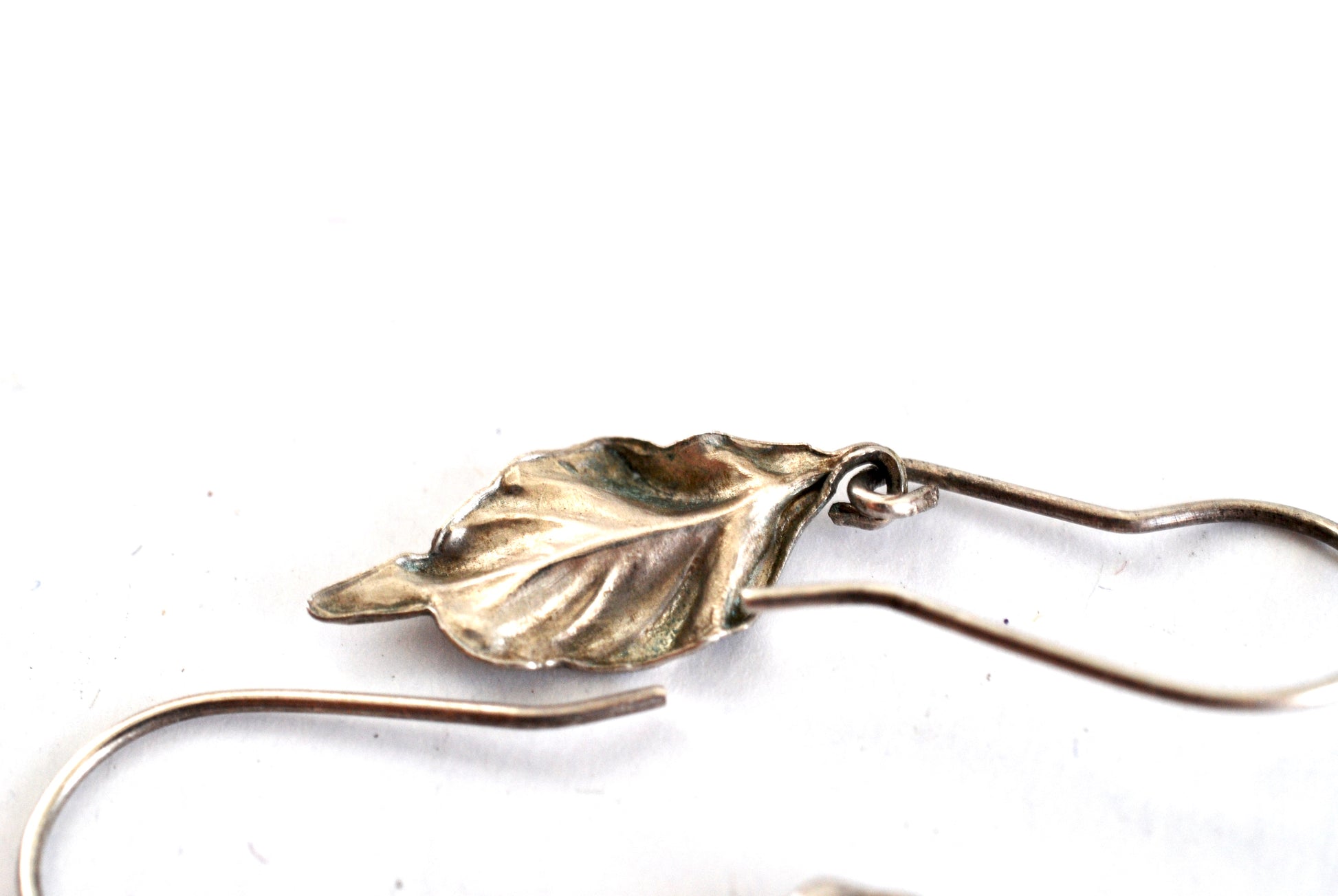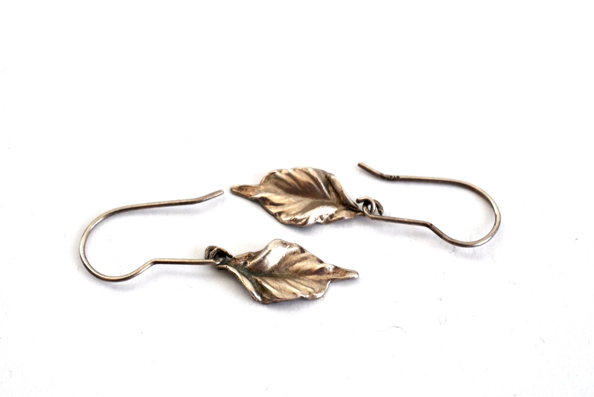 Absolutely wonderful tiny sculptured leaves. These beautiful little earrings are made of sterling silver and dangle from sterling silver ear wires. Perfect for a young girl or someone wanting a small expression of style. The detail in these earrings is exceptional. This is a pair of classic earrings that will never go out of style.