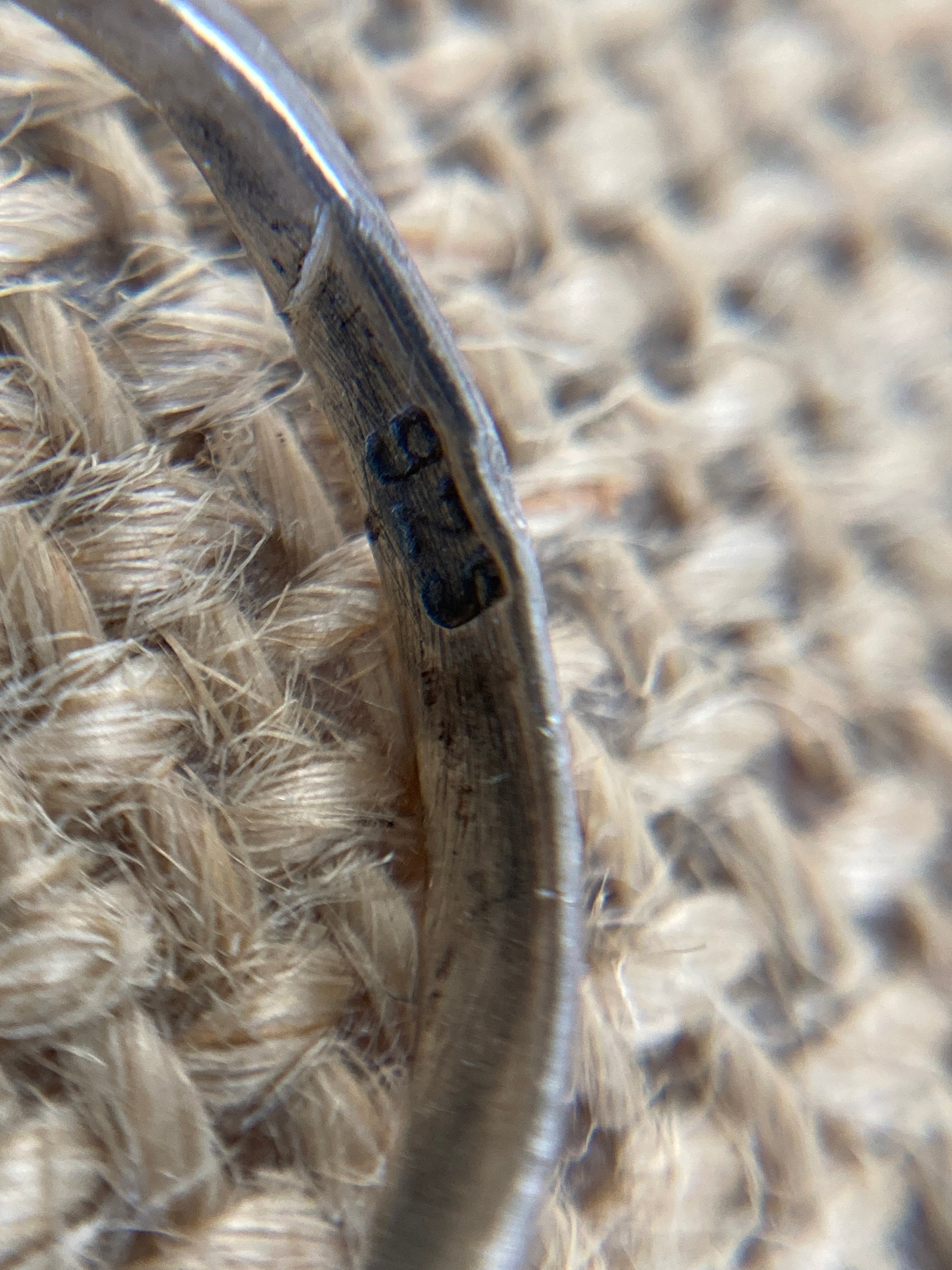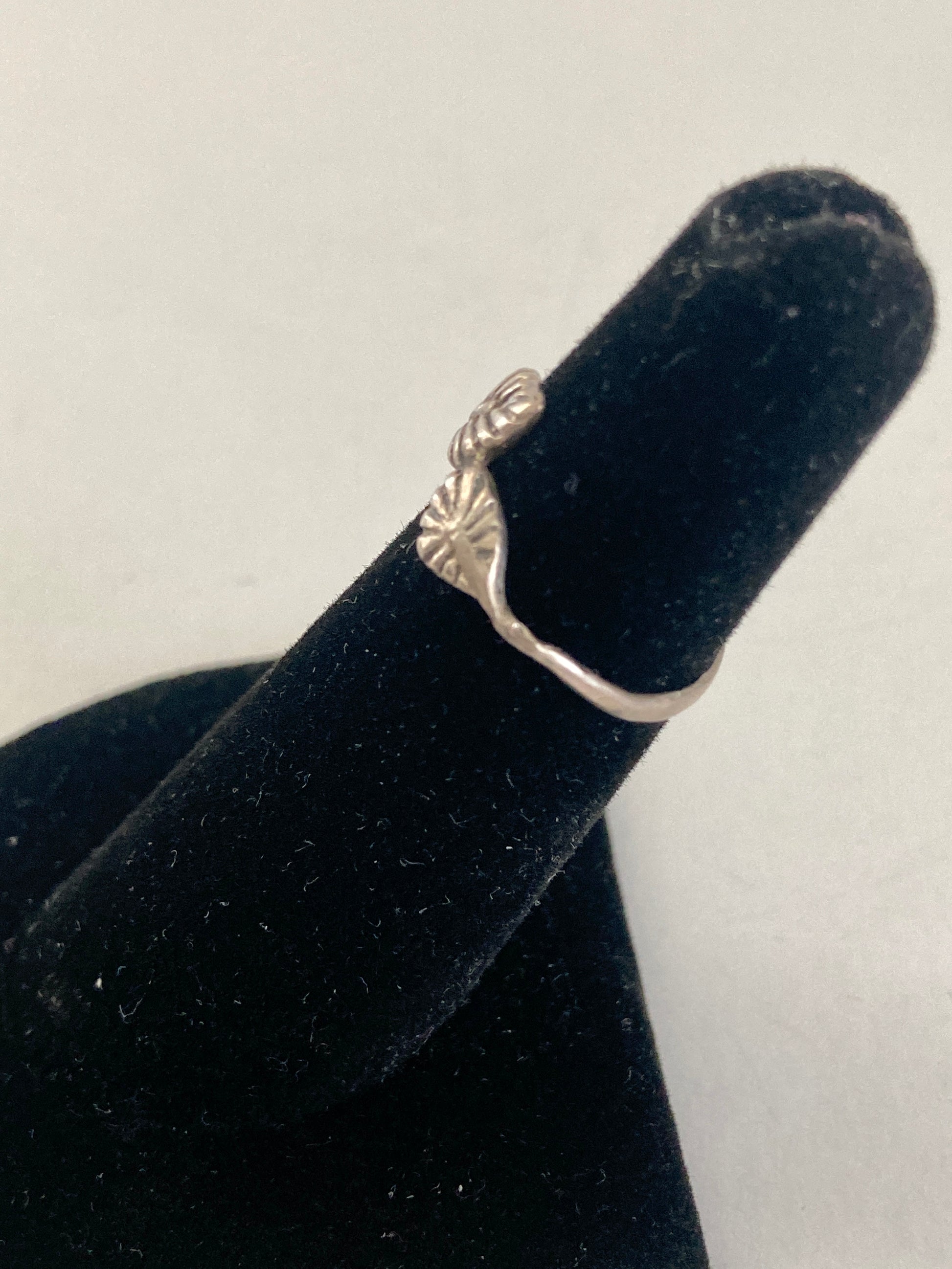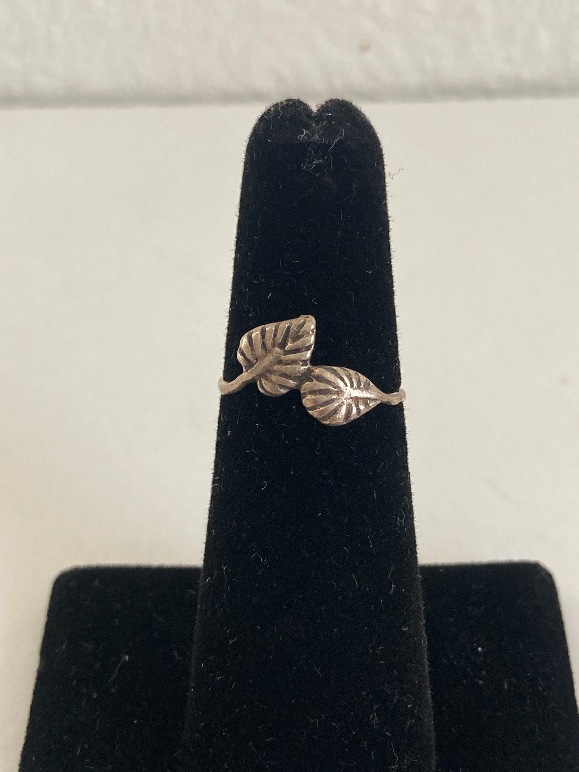 Two tiny leaves meet in the center of this delicate handmade silver ring. Stamped 925 on the inside of the band, the ring mimics a bypass style but is connected where the leaves meet. It's a U.S. size 5 1/2. Clearly handmade very possibly by a student as the workmanship is a bit amateur. A fun ring as a pinkie ring, for stacking or including in a grouping.