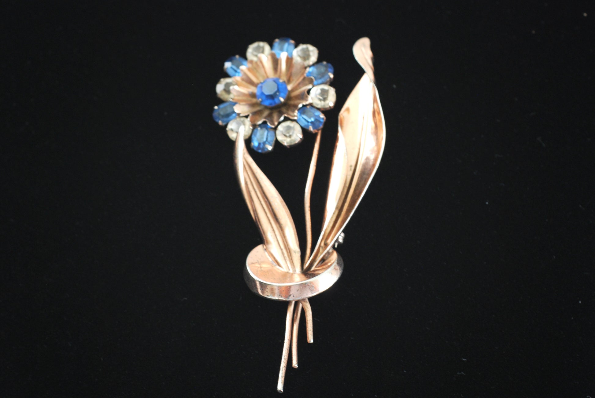 Beautiful 1940s vermeil sterling floral brooch. A single large flower in clear and medium blue rhinestones set on two large leaves with stems set upon a half-circle. This beautiful brooch is marked sterling on the back of the flower stem. Featuring alternating blue and clear stones with a center blue stone. This stunning brooch does show some signs of wear due to use and age. Still very lovely and very wearable.