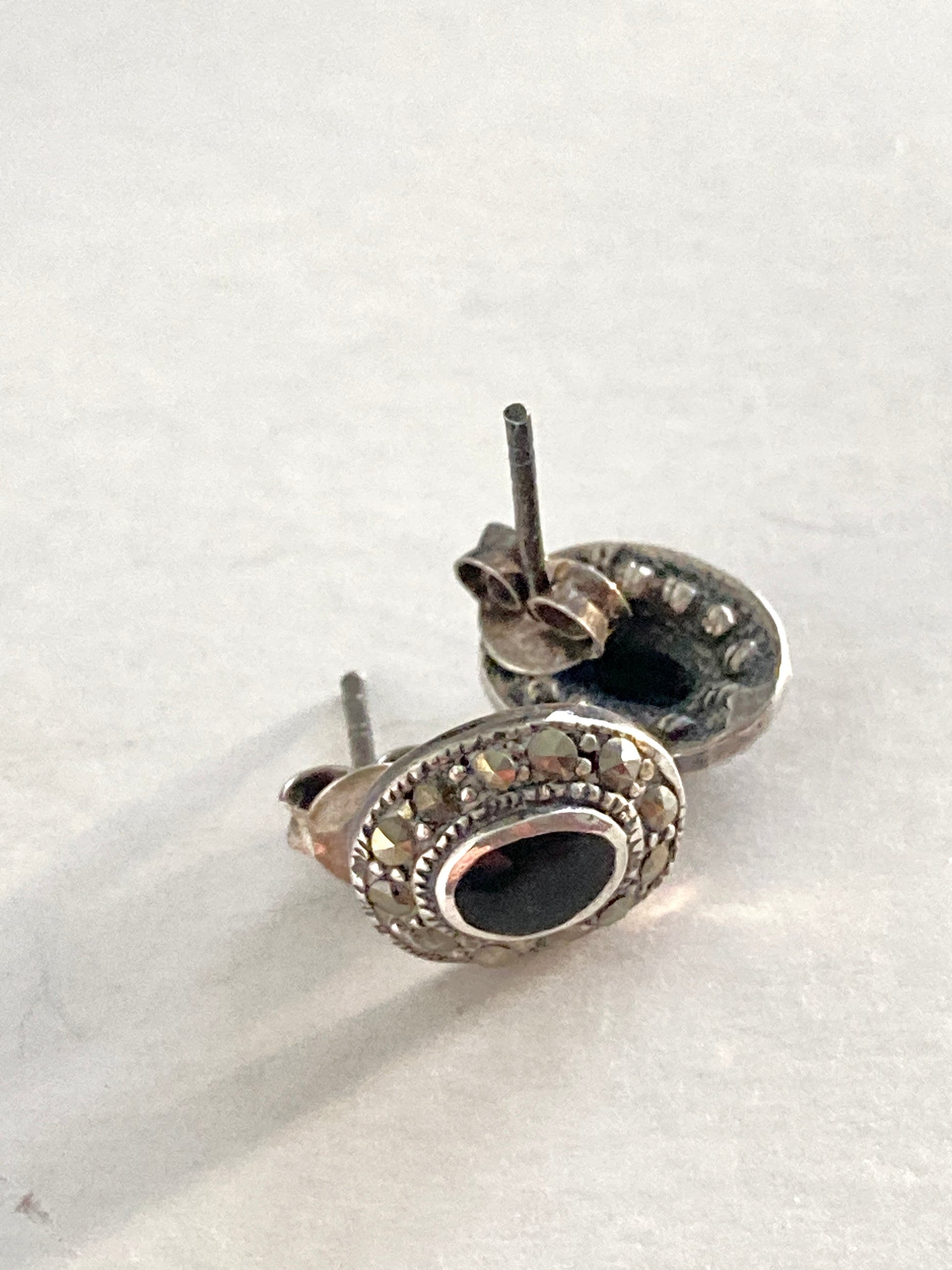 These tiny earrings still pack a punch. Set with oval onyx center stones surrounded by tiny marcasites all set in sterling silver with post style backs. Small enough to wear every day, yet with enough sparkle to be fun and stylish. Marked 925 on the earring backs.
