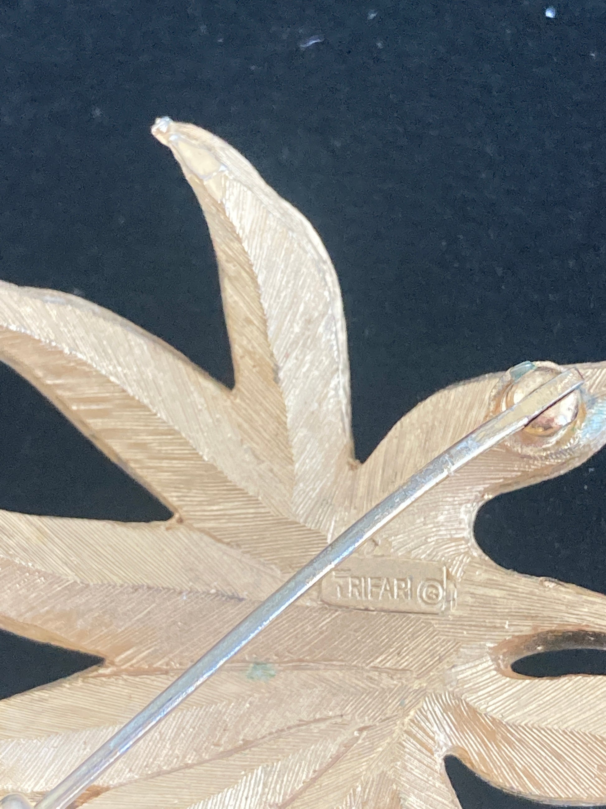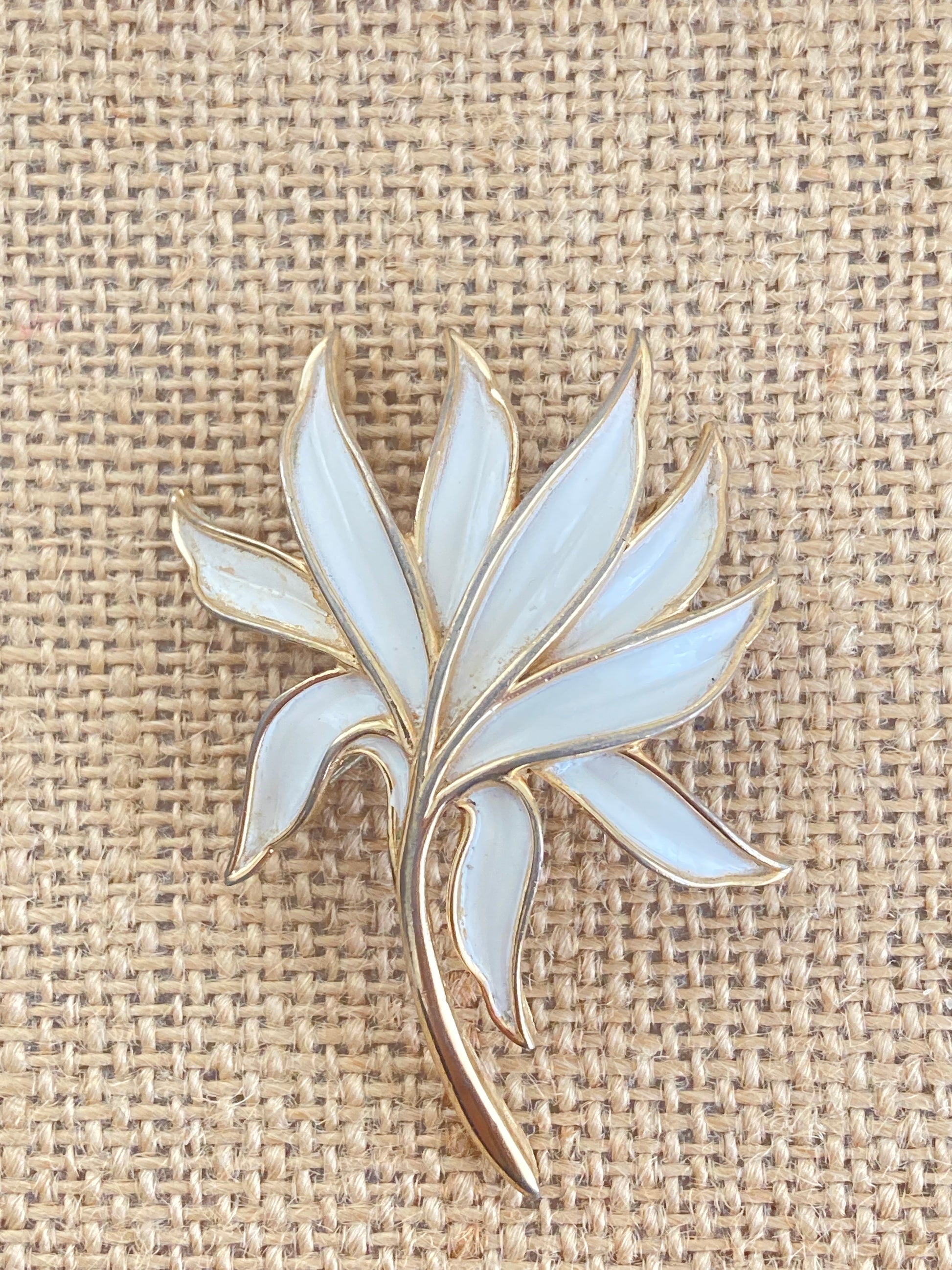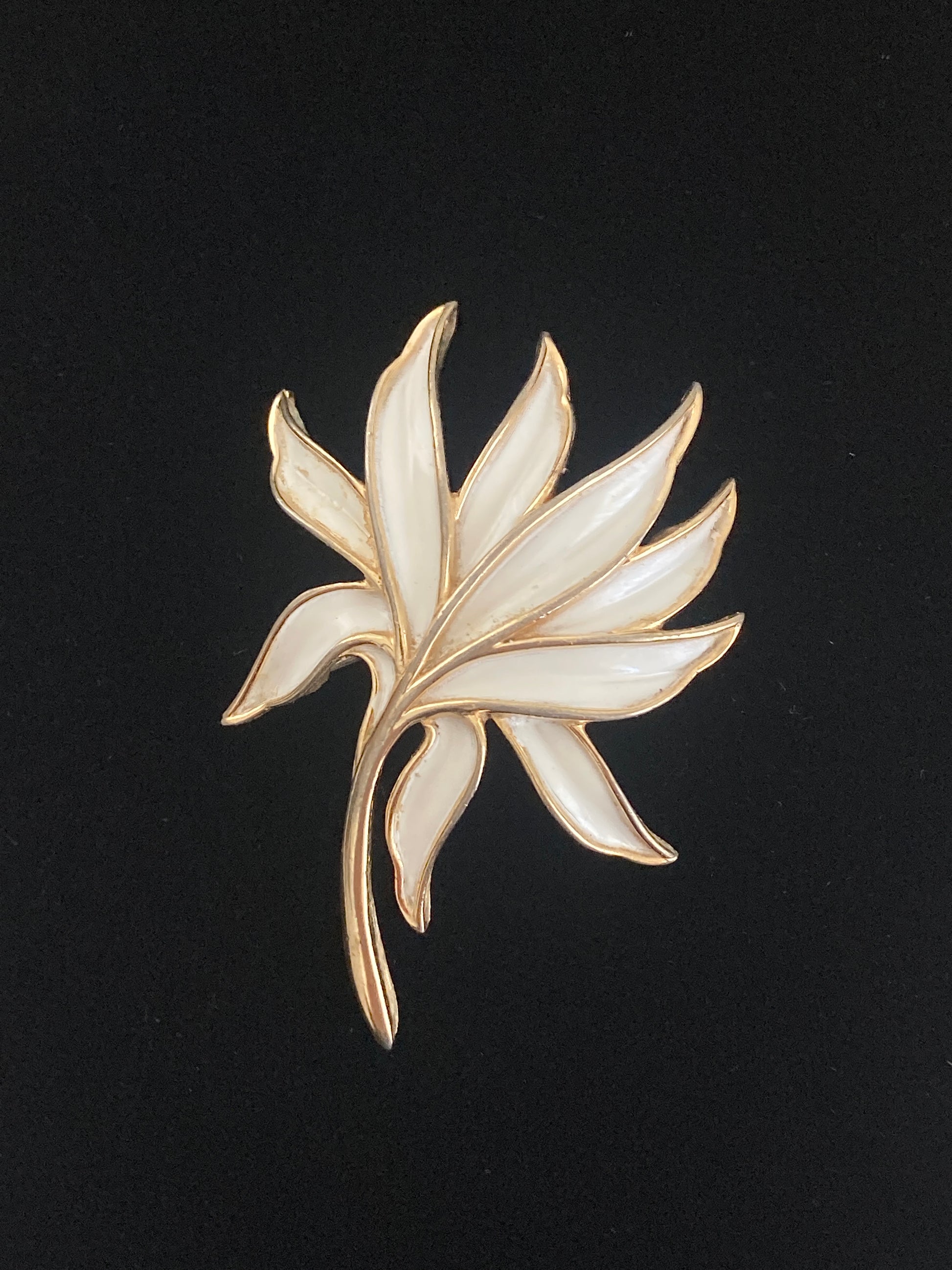 This beautifully made vintage Trifari brooch is done in white enamel over gold-tone metal. There is a bit of color loss on one leaf. Please see pictures for detail. The back of the brooch features a beautifully textured matte finish with the Trifari stamp. As always, this Trifari brooch is a classic piece of vintage costume jewelry.