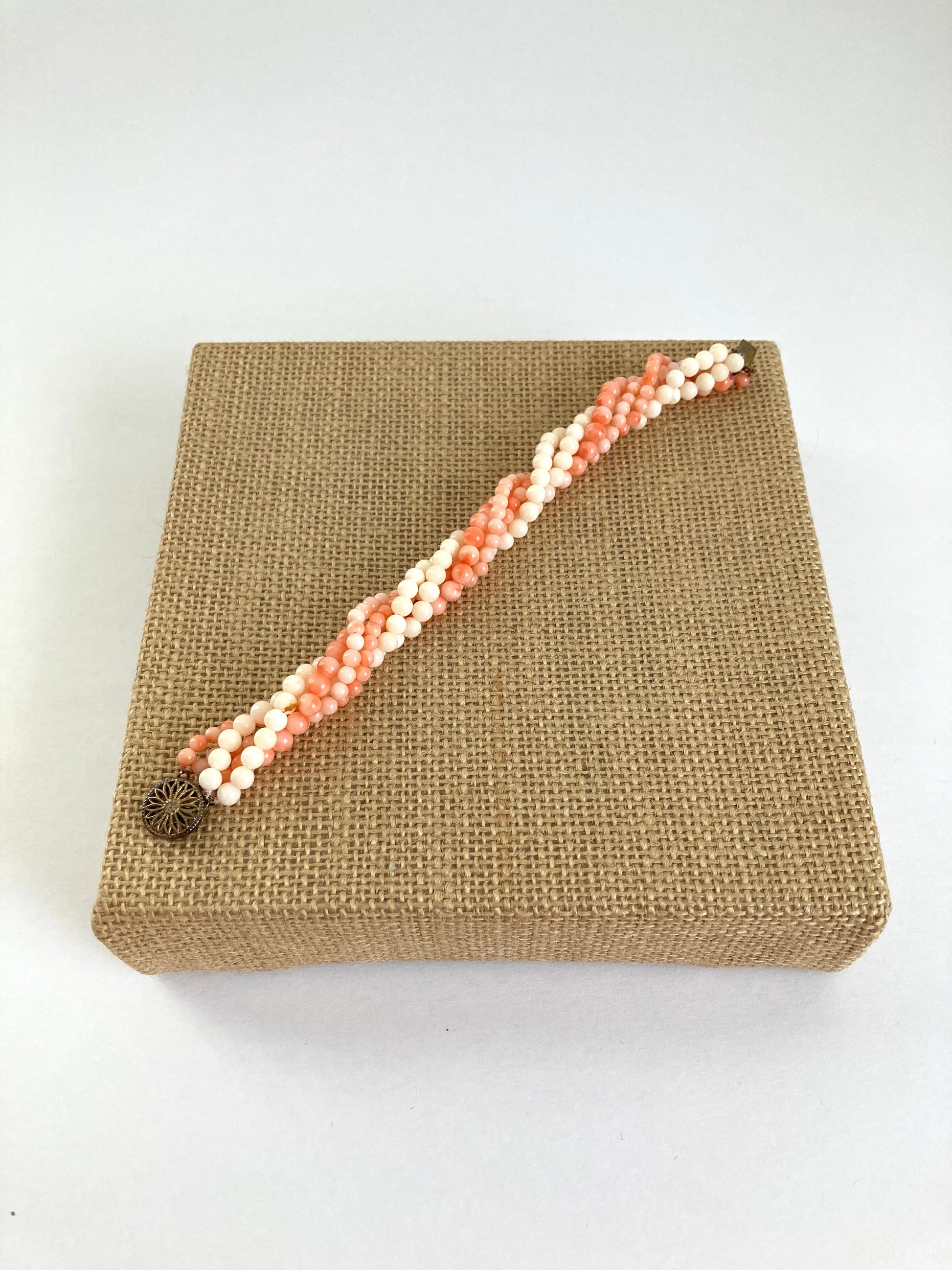 A beautiful five-strand beaded torsade style bracelet with a sterling silver floral clasp. This bracelet features two strands of white coral and three strands of pink angel skin coral beads. Two strands have smaller size beads, while three strands have slightly larger beads. This is a gorgeous bracelet in excellent condition.