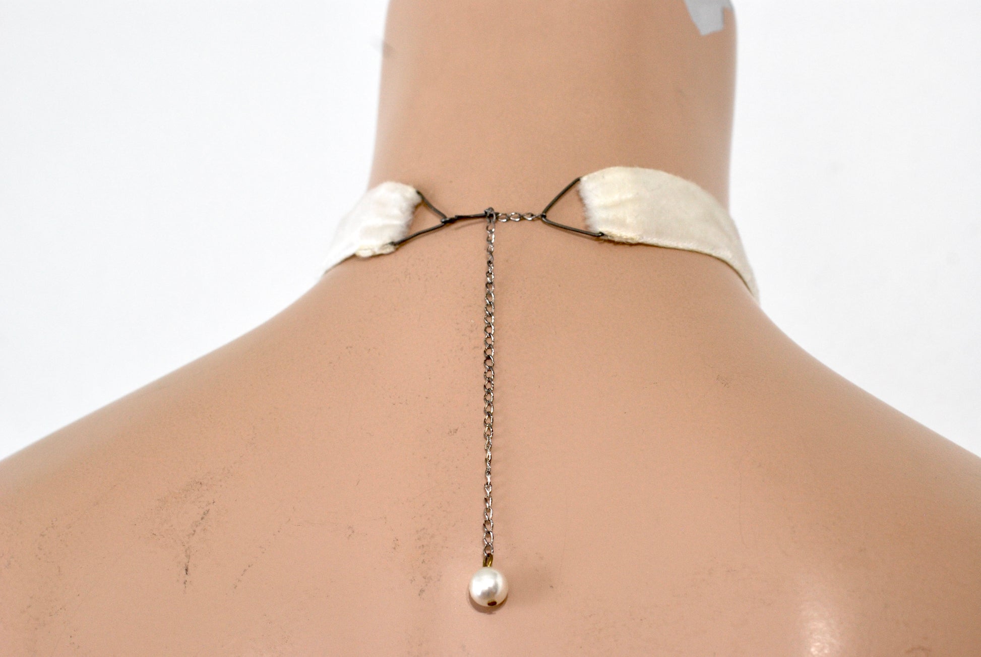 This simple statement piece must have fabulous stories to tell. Found at an estate with many items from the 1800's this lovely victorian era choker or collar necklace is made from antique white velvet. It features a simple oval cabachon of snowflake obsidian on a metal slide. The ends of the velvet are securely stitched down to triangluar shaped metal jump rings and the necklace ends with a thin adjustable chain ending in a single pearl.