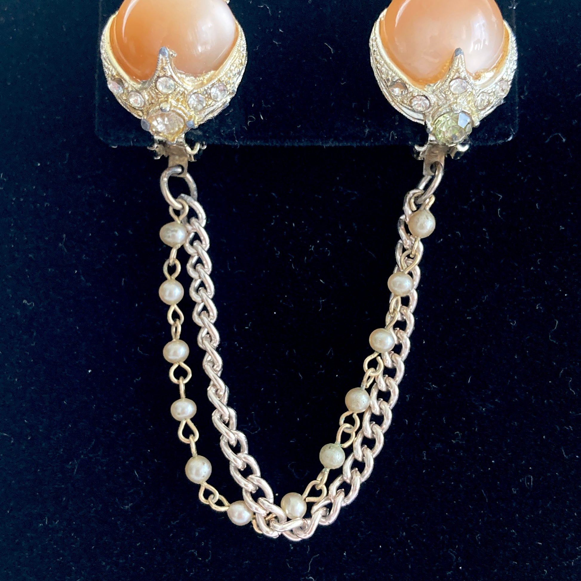 Yummy peach Moonglow lucite cabochons clasped in gold tone textured metal and embellished with rhinestones. The clasps look like clip on earrings, only they have serrated teeth to hold onto your sweater. There are two strands of chain one a simple curb chain and the other in faux pearls. There are no markings on this piece. It shows very minor signs of wear but since it's over 65, it's in great shape for its age.