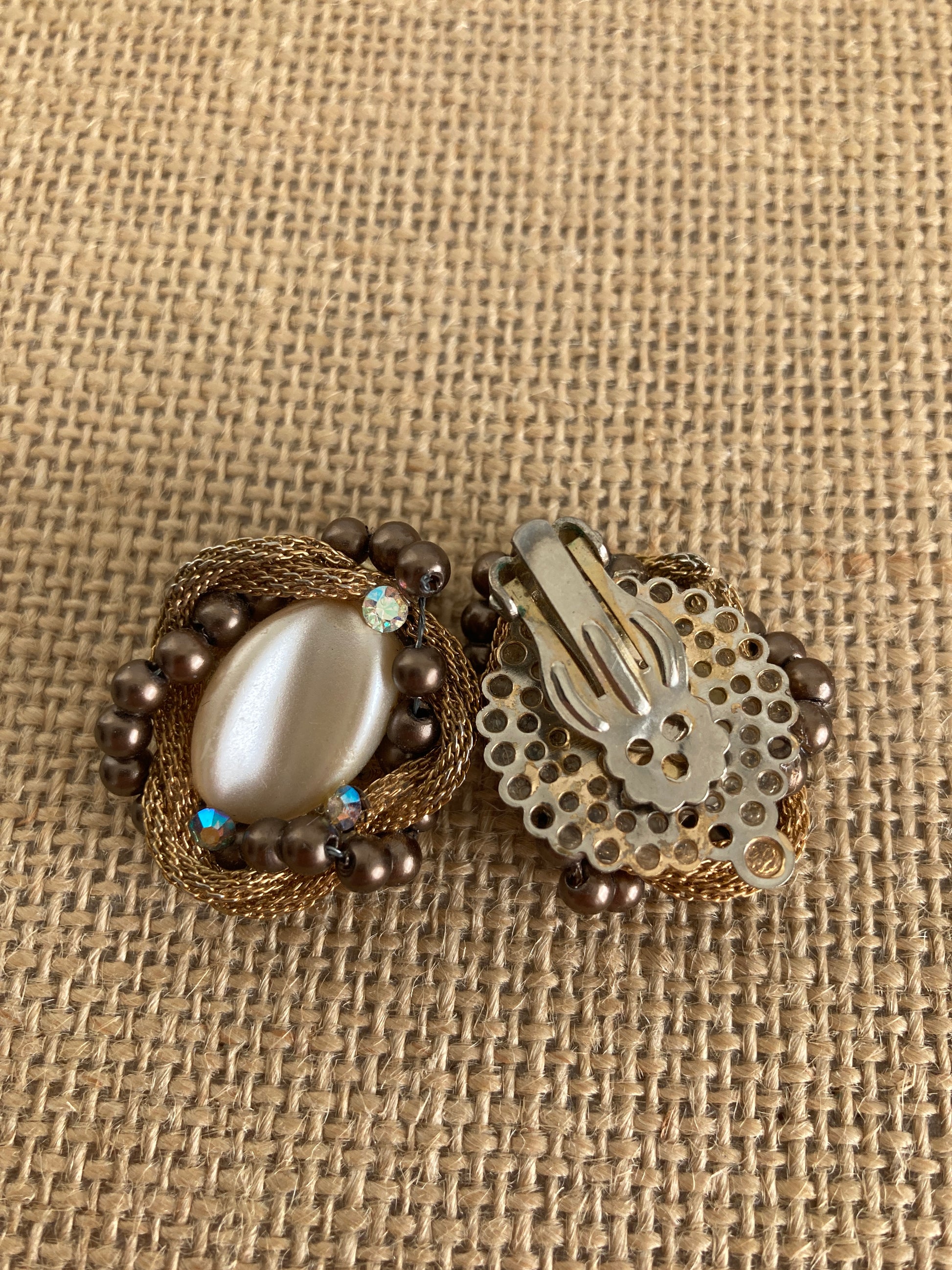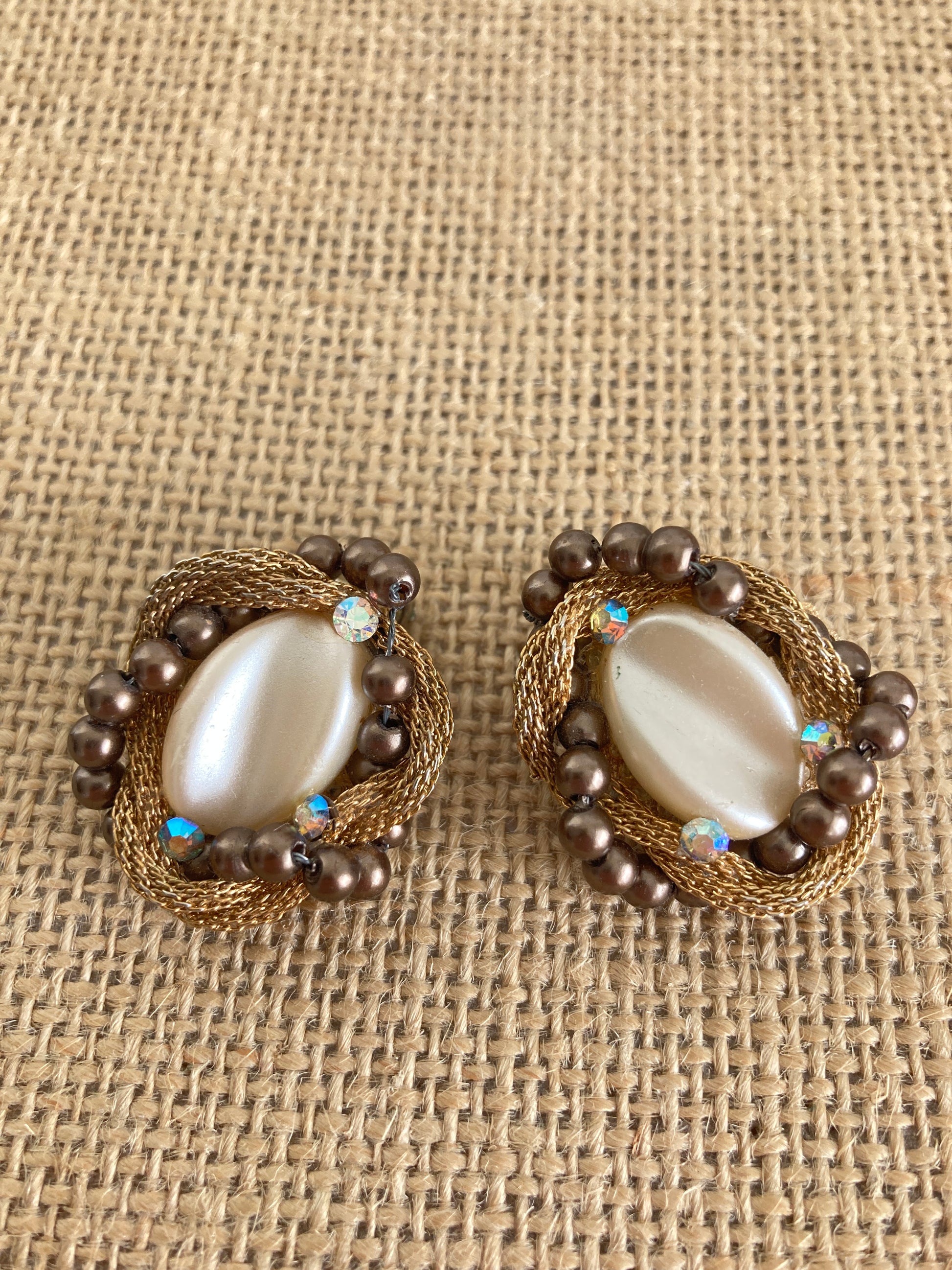 Party ready, these festive earrings feature creamy beige molded thermoset oval centers surrounded by gold mesh chain entwined with brown faux pearls and dotted with three AB rhinestones each. Just waiting for a party, these clip-on style earrings show no signs of wear and are just right to accessorize a vintage outfit.