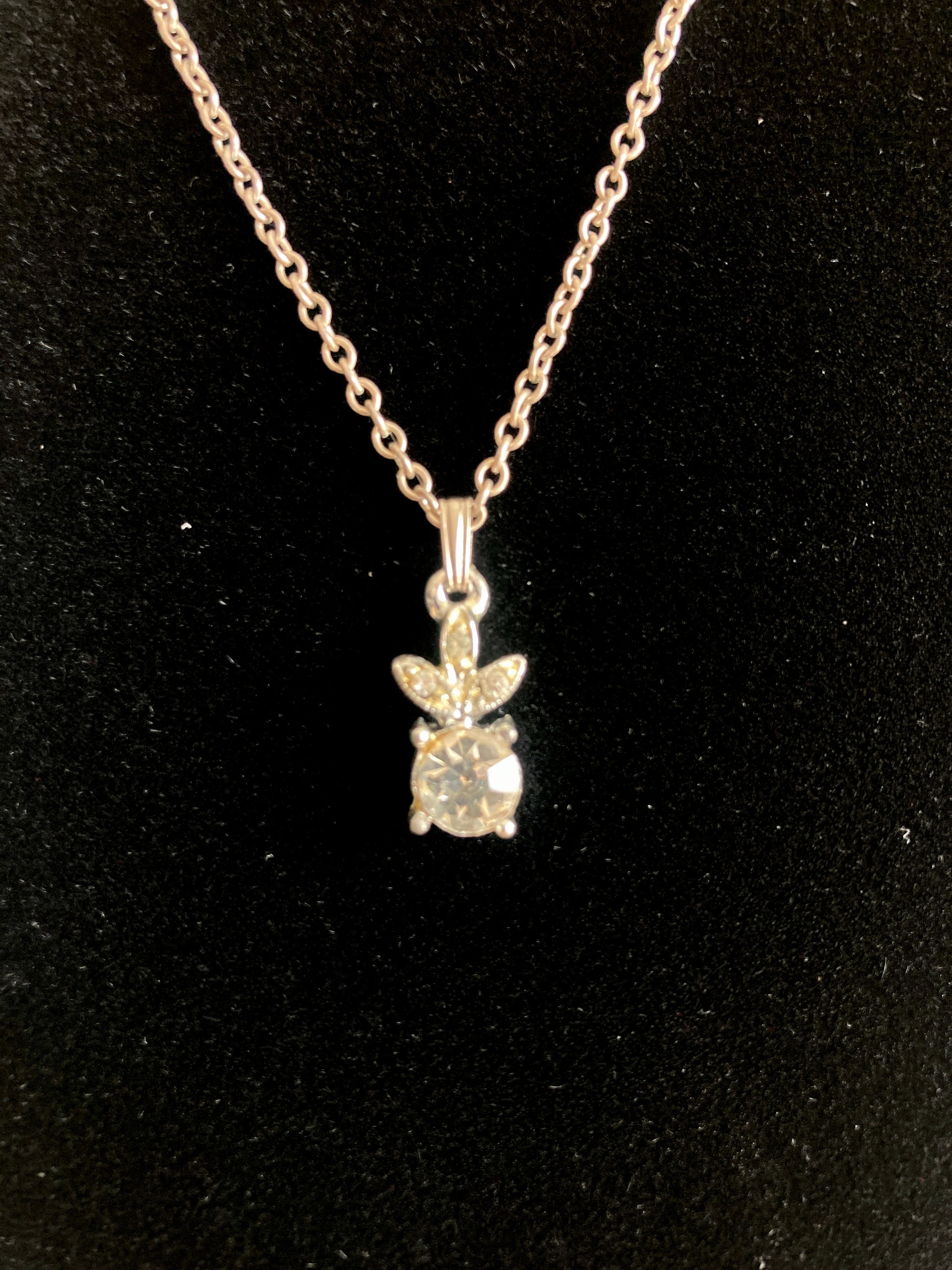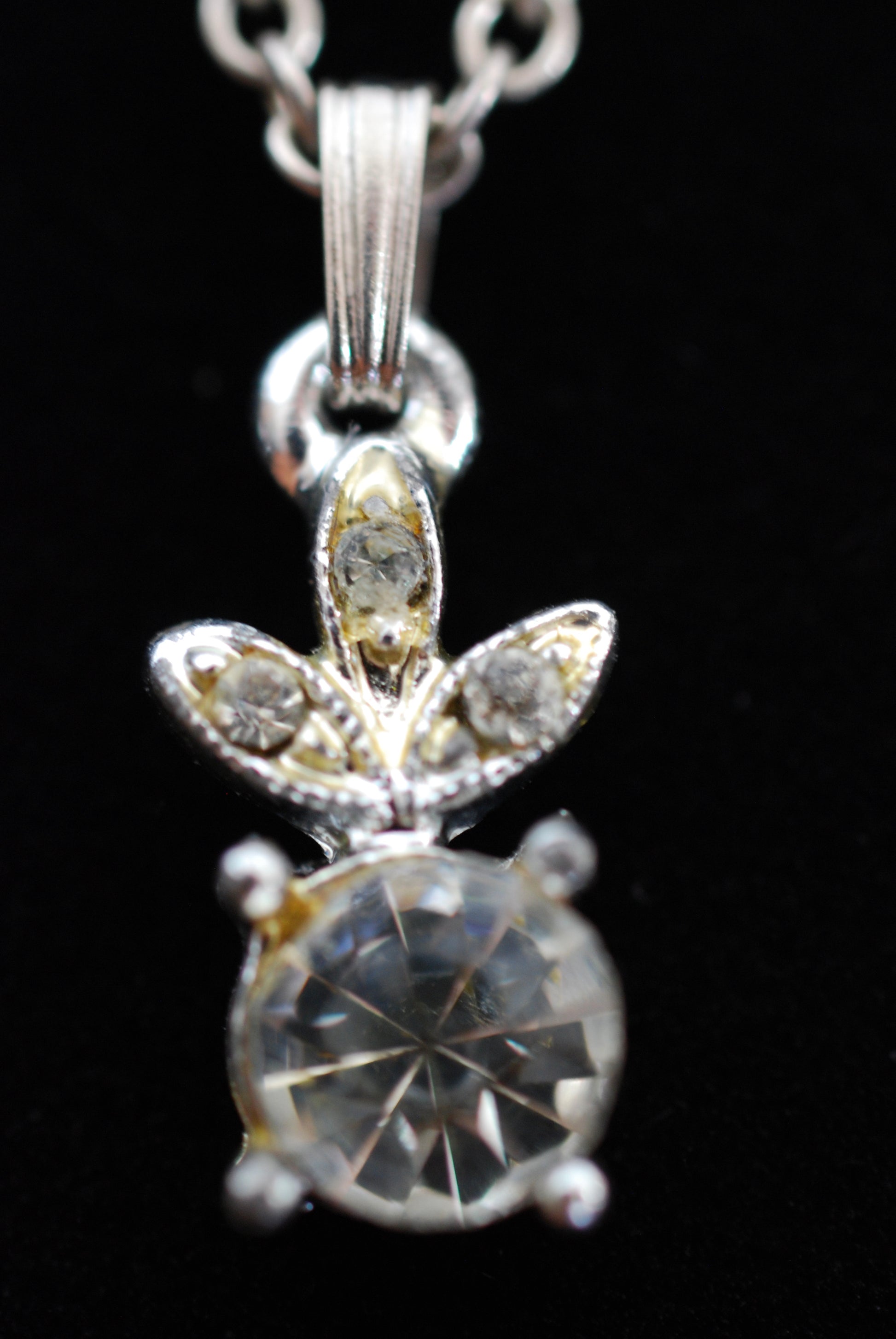 Sweet tiny rhinestone pendant necklace in silver-tone metal features a single large faceted clear stone with three tiny leaves above each holding a single tiny matching stone. Hangs from a silver-tone chain. This dainty necklace would make a wonderful gift for a young lady. So pretty and delicate.