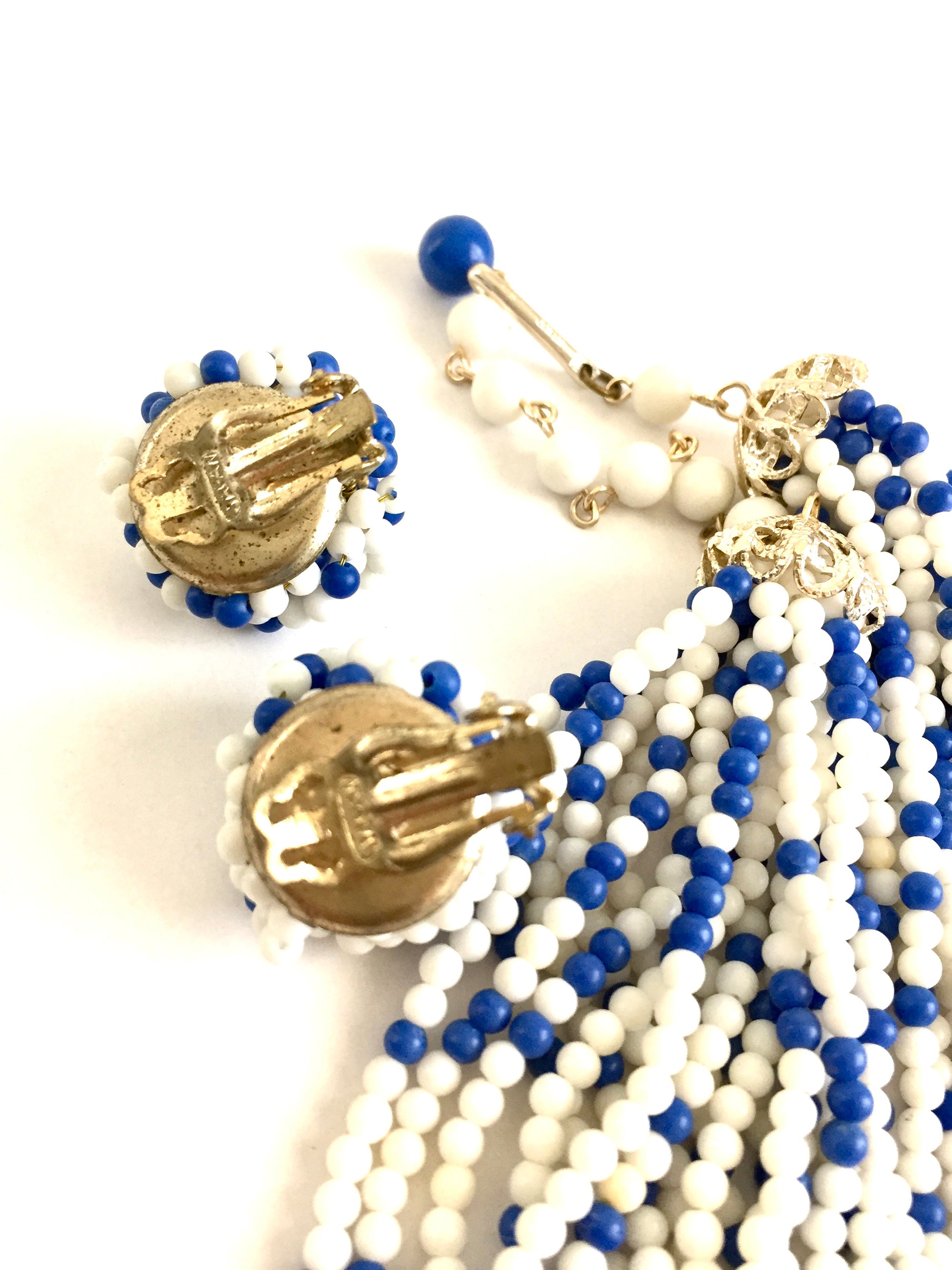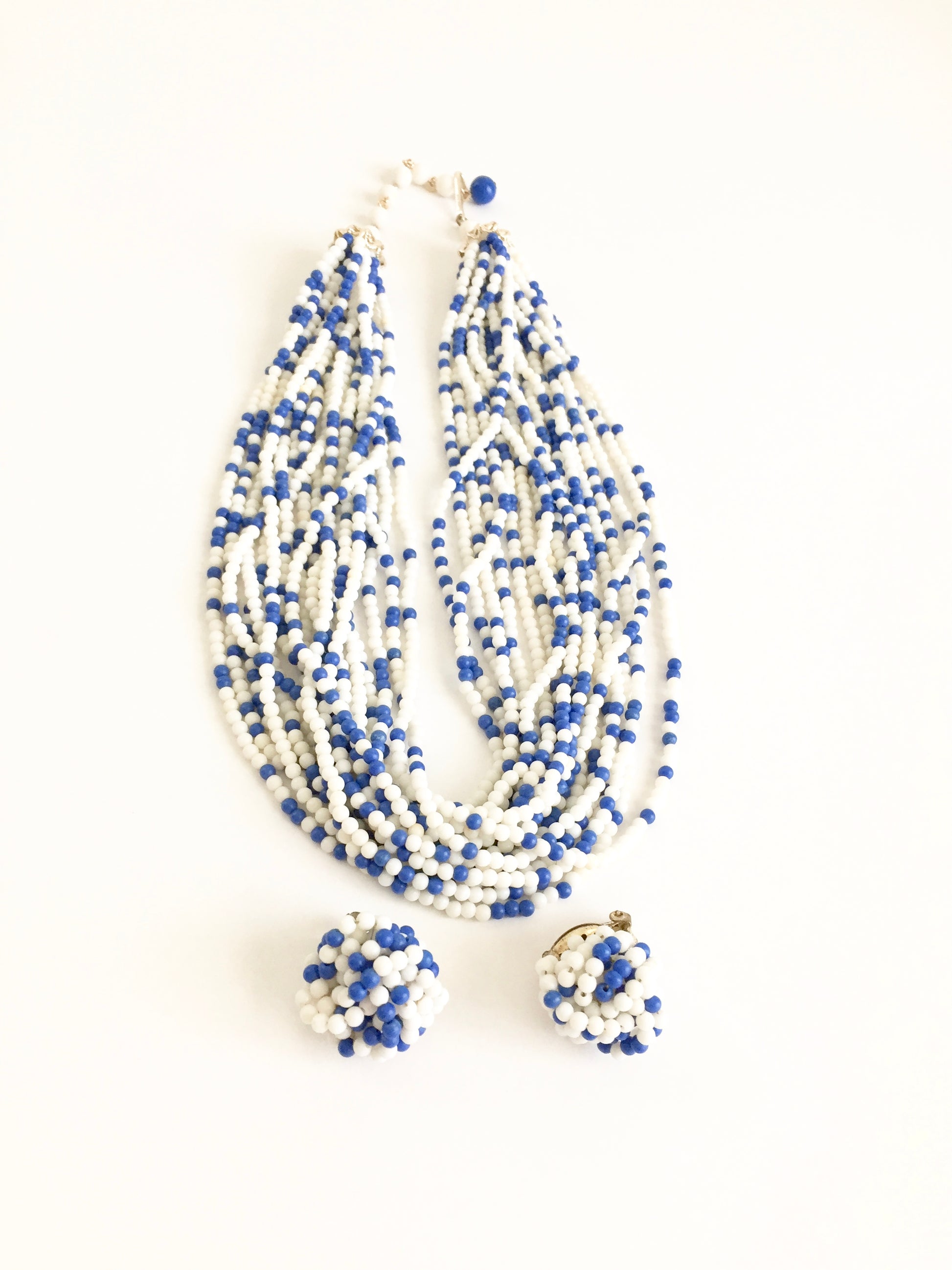 Vintage 1960s Blue and White Beaded Multi Strand Necklace with Matching Earrings