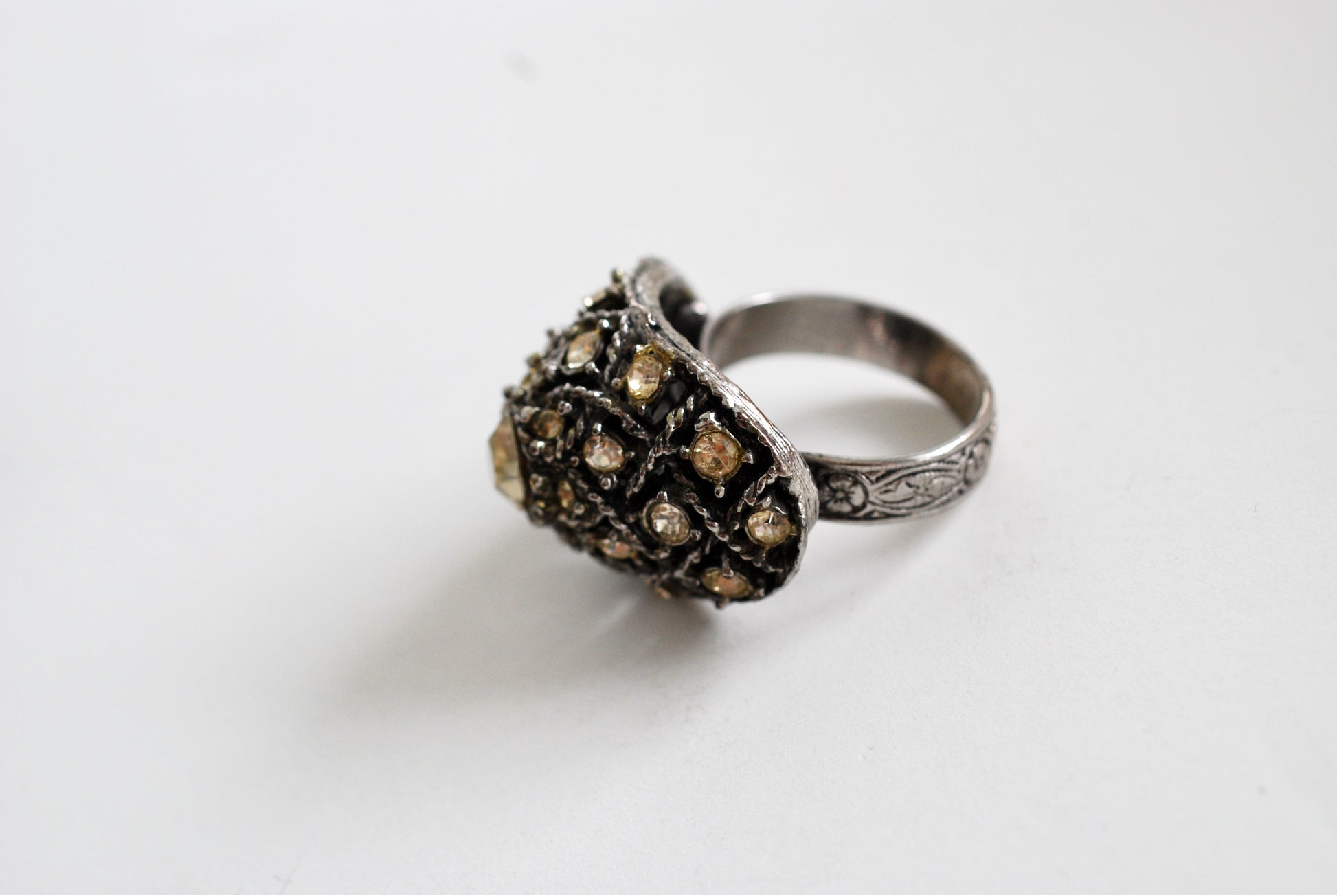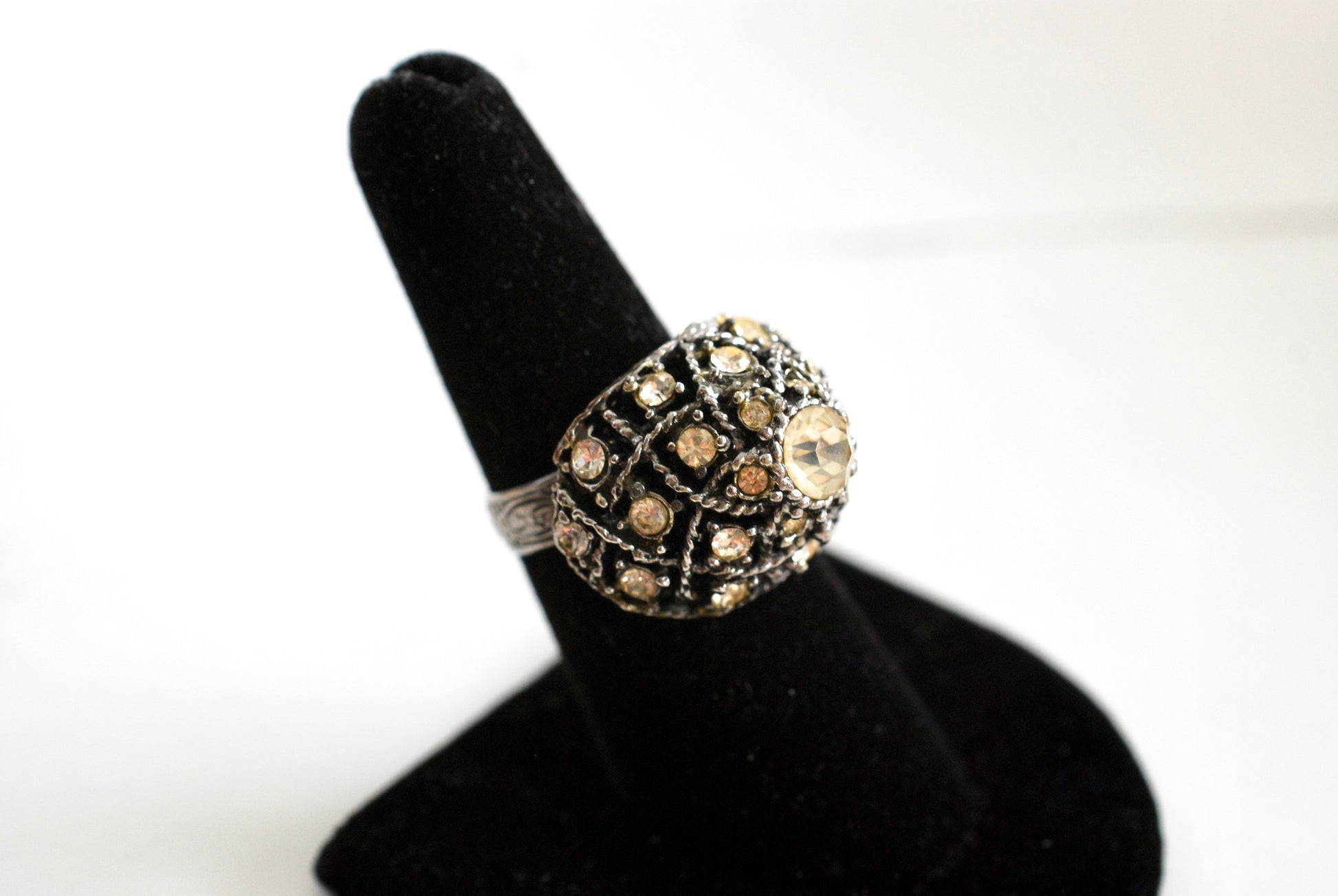 Vintage 1960's Large Domed Cocktail Ring Silver tone with Rhinestones Adjustable