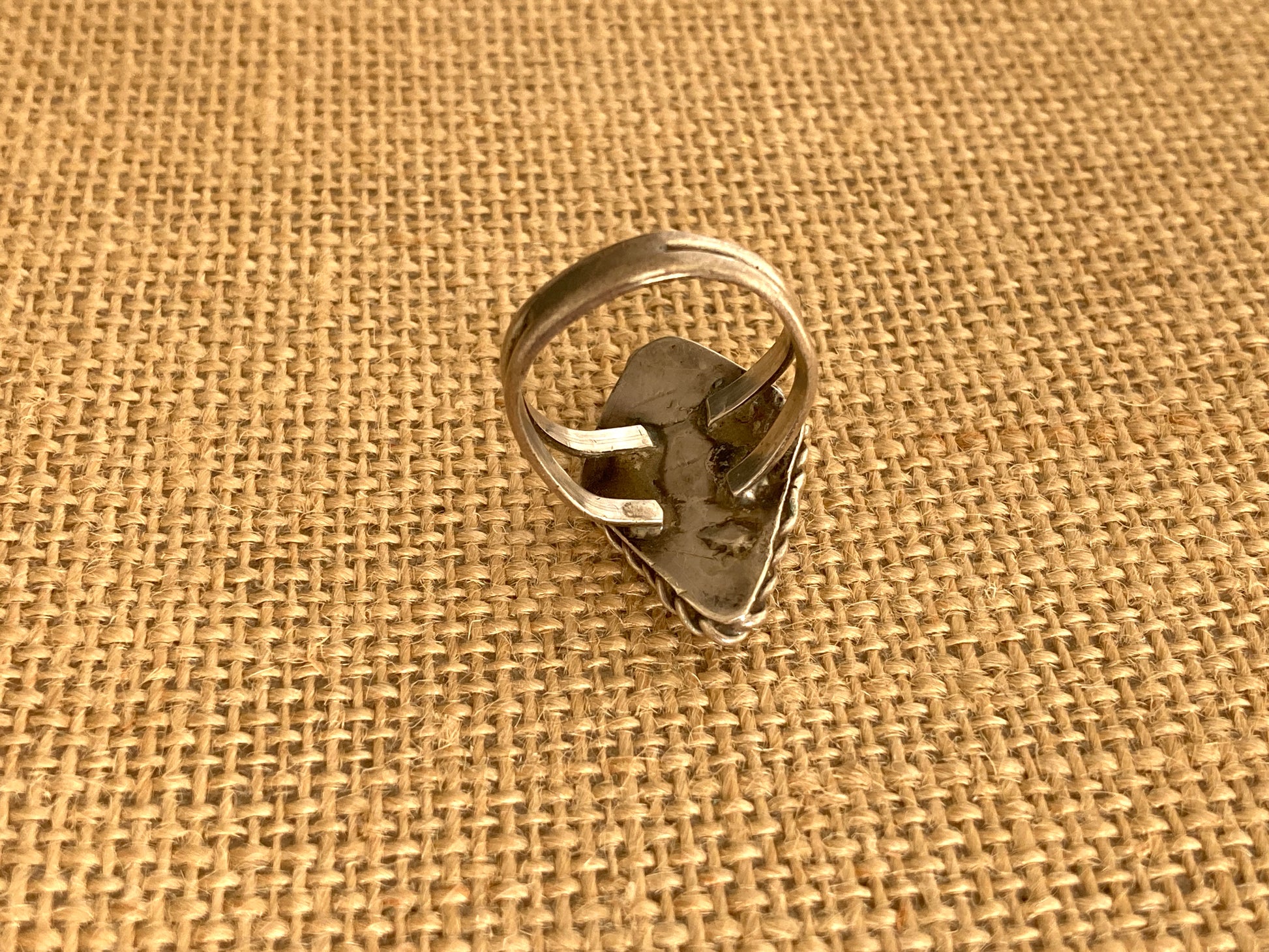 A large diamond shaped chunk of turquoise is the centerpiece of this vintage 1970s ring. Unmarked and amateur artisan made in alpaca silver. The single stone started out as a medium blue and has aged over time into a deep green. There is a twisted rope style bezel surrounding the stone with split shoulders connecting at the back of the ring. The stone itself has a couple of chips as this ring was well loved and worn for many years. It fits approximately a US size 9 1/2 but can easily be sized.