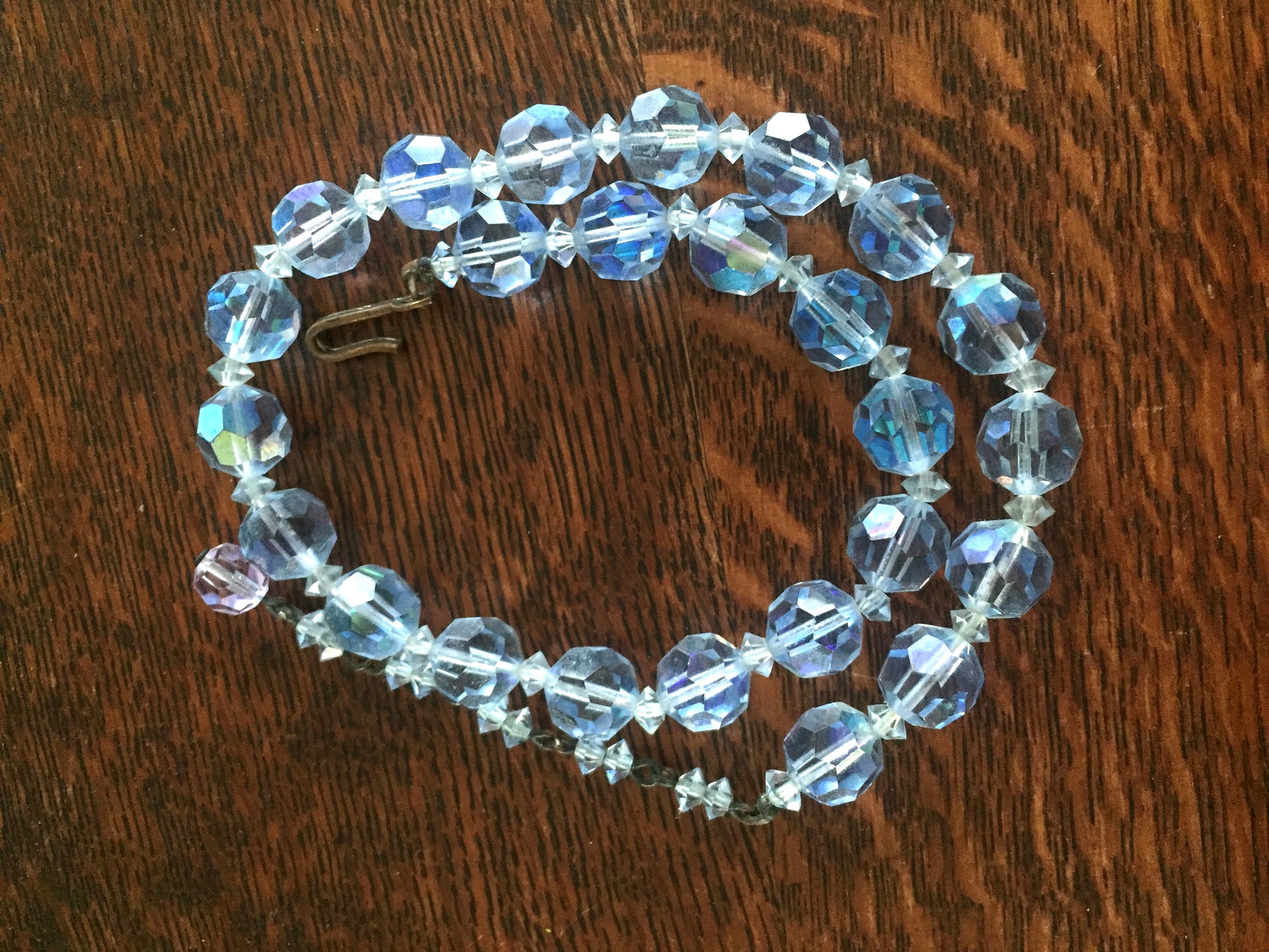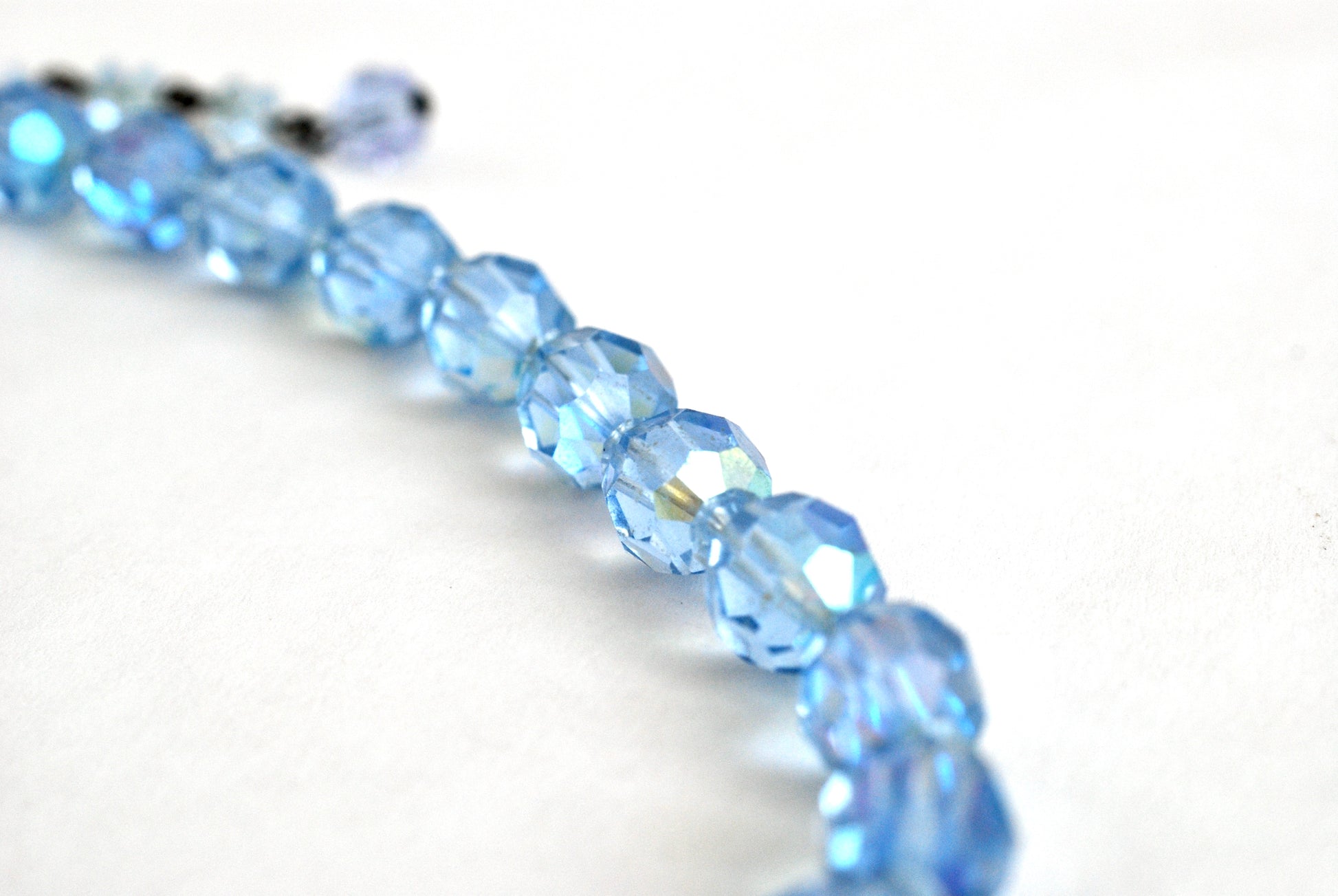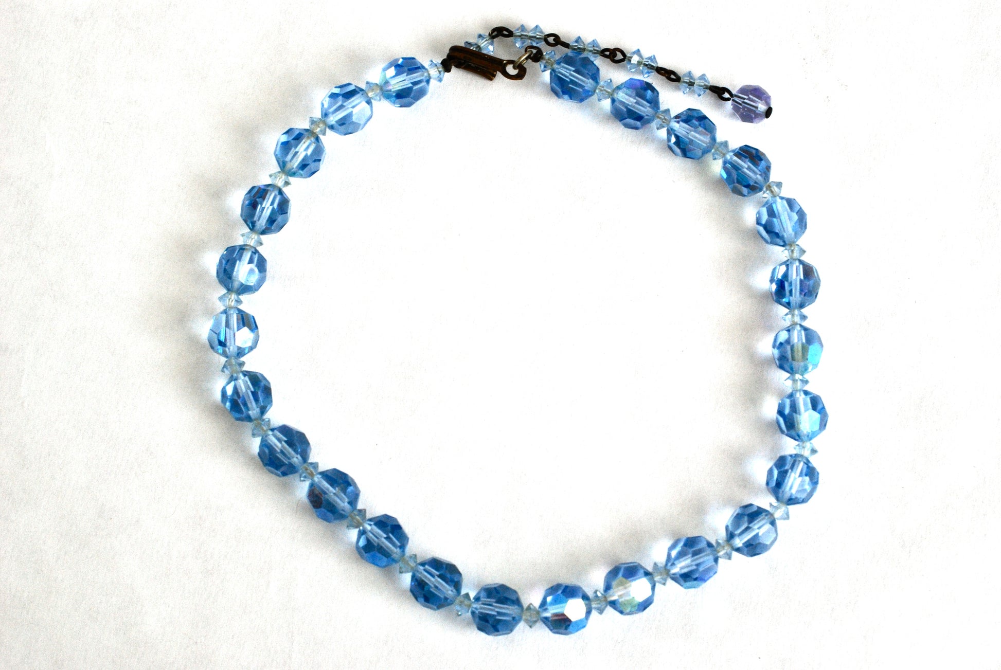 Gorgeous vintage late 50's to early 60's light blue aurora borealis crystal choker length necklace. This beautiful necklace is made of alternating faceted round crystals and tiny bi-cone crystals in a delicate light blue shade with iridescent coating. The necklace features an adjustable hook closure with a crystal and link chain ending in one lavender faceted bead.