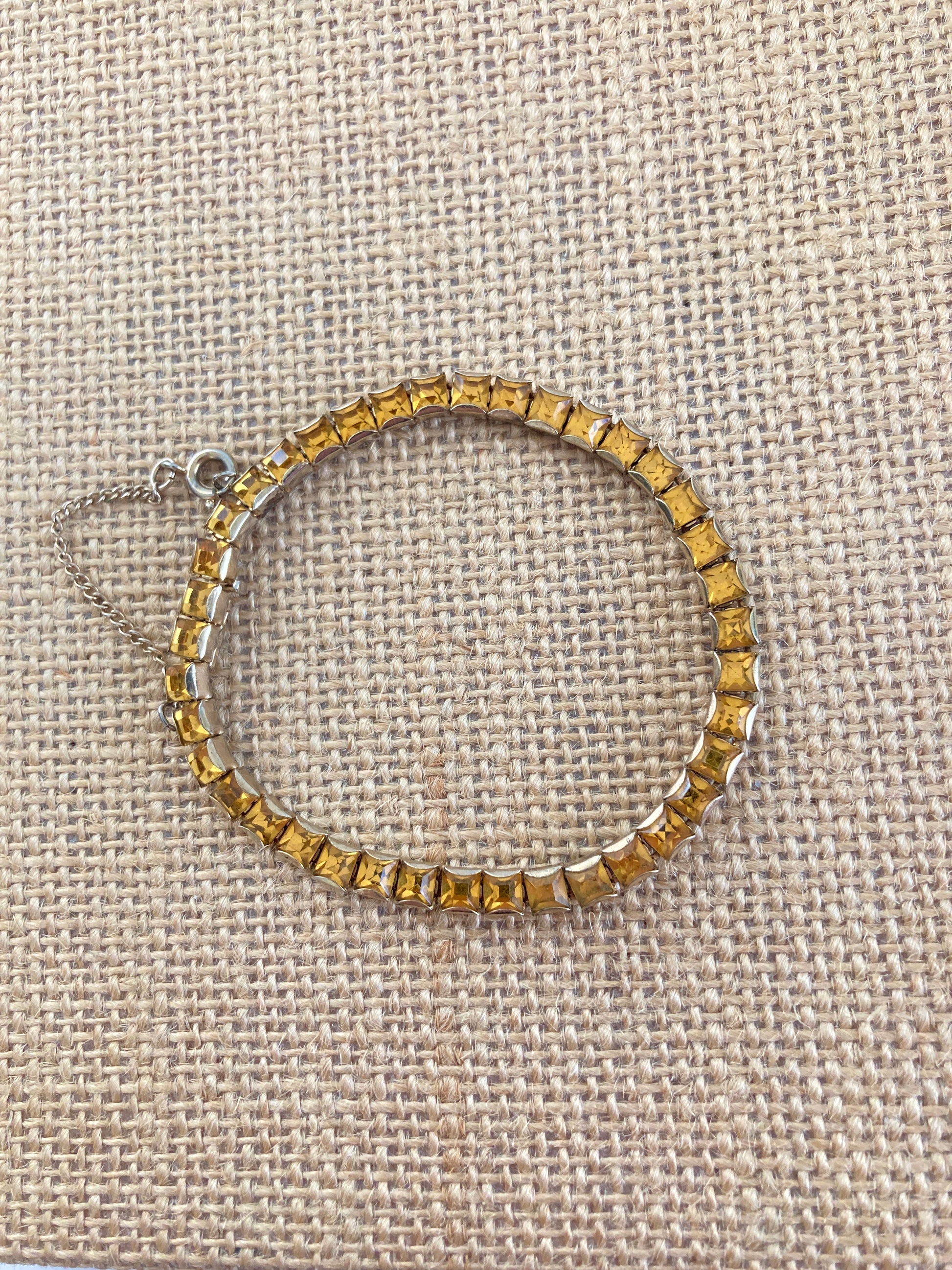 A rare color and style in vintage tennis bracelets, this gorgeous piece features amber-colored glass princess-cut square stones on a gold-tone metal base and has an attached safety chain. The stones are all bright and clear showing no signs of damage. An absolutely beautiful bracelet in excellent condition. There are no markings on this piece.