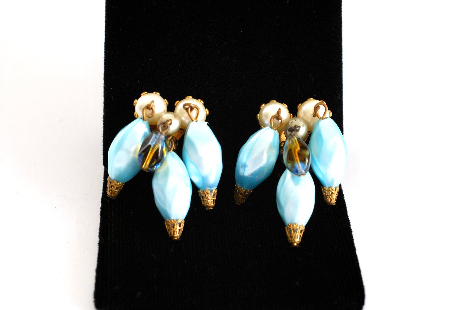 These fun and unusual vintage 1950s baby blue and pearl earrings are stunning. They feature three large shiny blue football shaped beads with brass filigree end caps dangling from faux pearls with a center root beer and blue iridescent bead. The backs are clip on style. There are no markings. These are lightweight and well made with the earring base riveted to the backs.