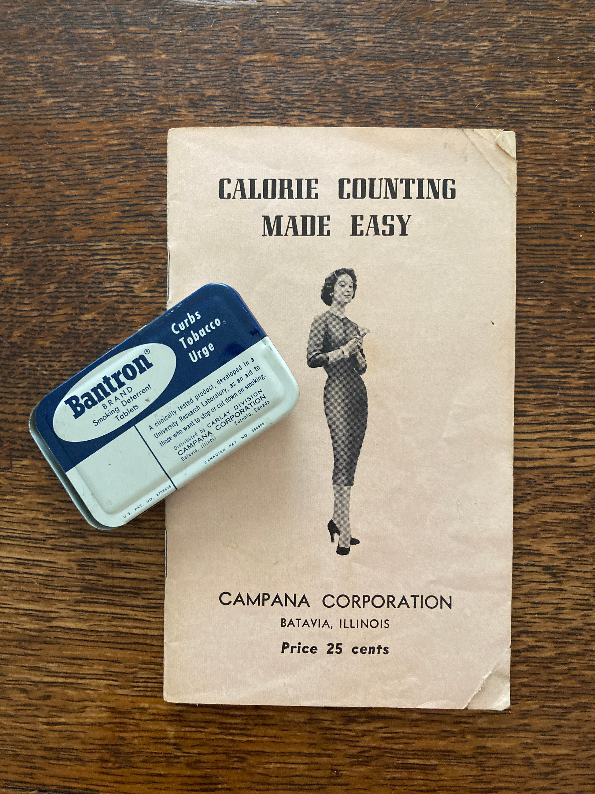 A vintage 1960's tin marked Benton brand smoking deterrent tablets. Curbs tobacco use. This fun little tin features a sliding lid and is in excellent condition both inside and out. Perfect for keeping your meds handy or add this to a collection of vintage tins. It comes with a booklet called "Calorie Counting Made Easy" by Campana Corporation, the same company that also made Ayd's Reducing Plan candy.