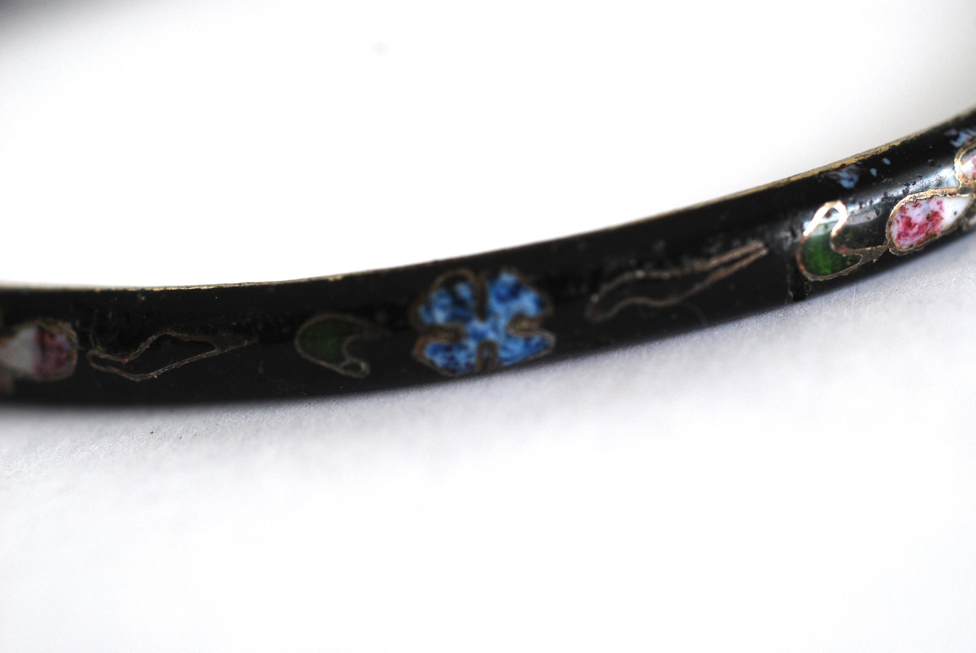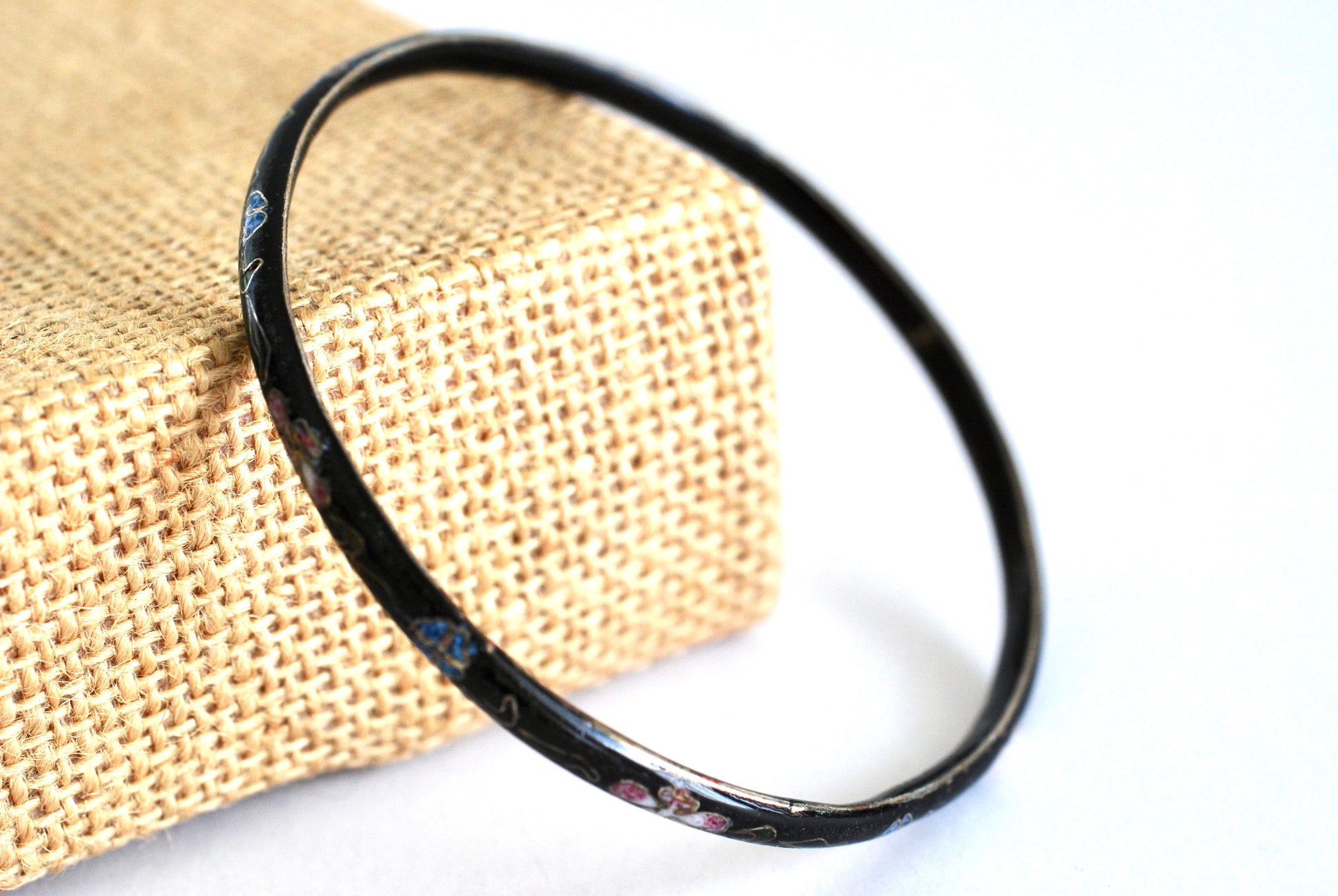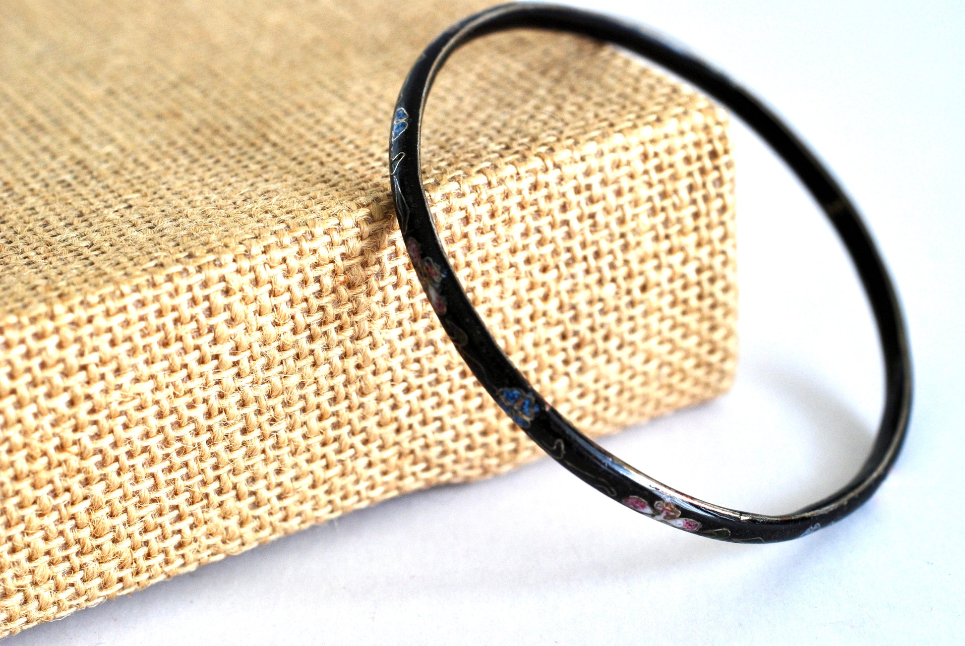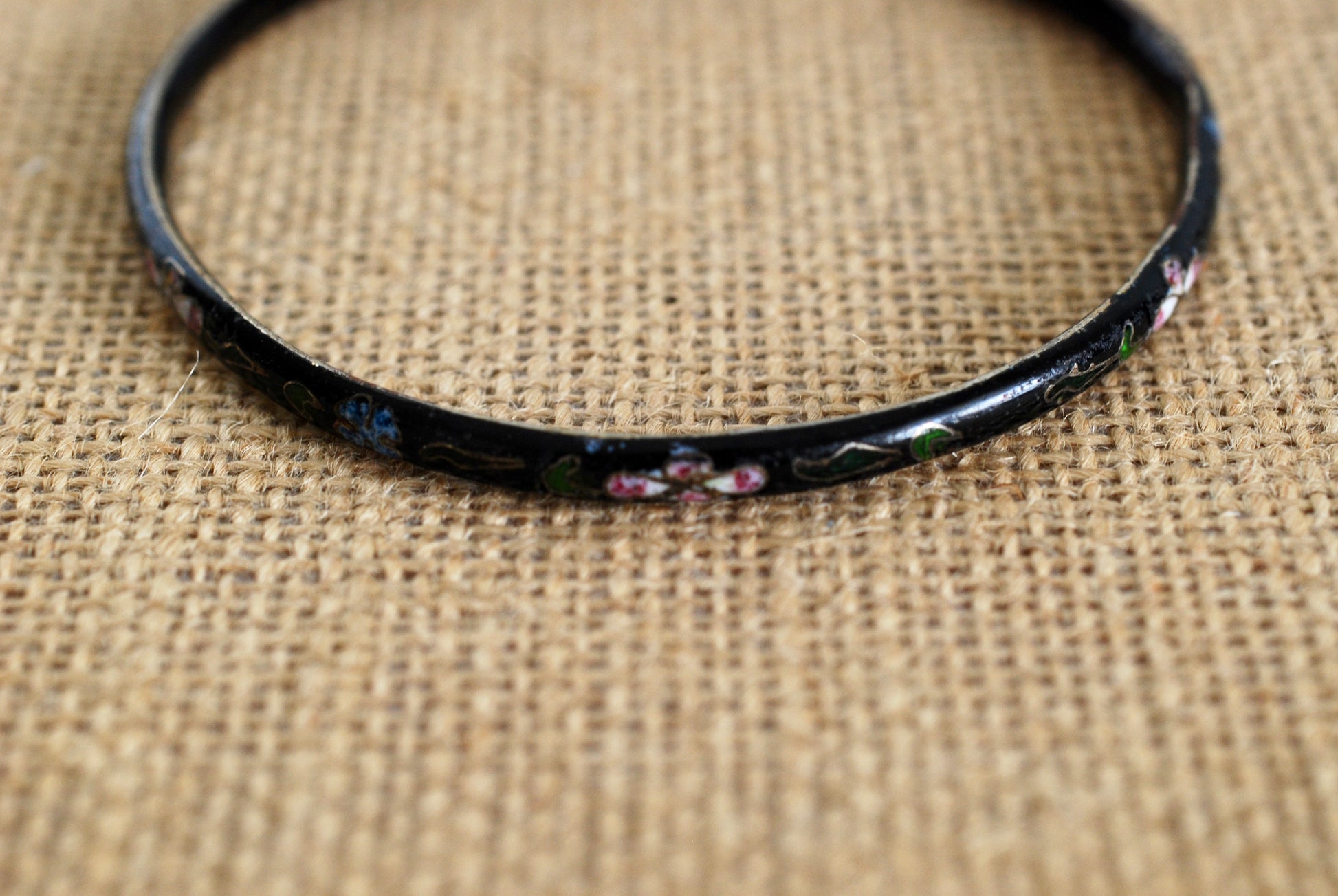 This is such a beautiful bangle. It's well worn and shows signs of age which only make it more intriguing to me. Oh, the stories this bracelet could tell. Very thin black enamel covers the insside and outside of this bangle interspersed with brass details and swirled pink and blue tiny flowers. She was clearly handmade as you can feel the imperfections in the shape and finish. The edges have been worn bare and show the original metal base. An absolutely gorgeous piece of jewelry with secret history I'm sure.