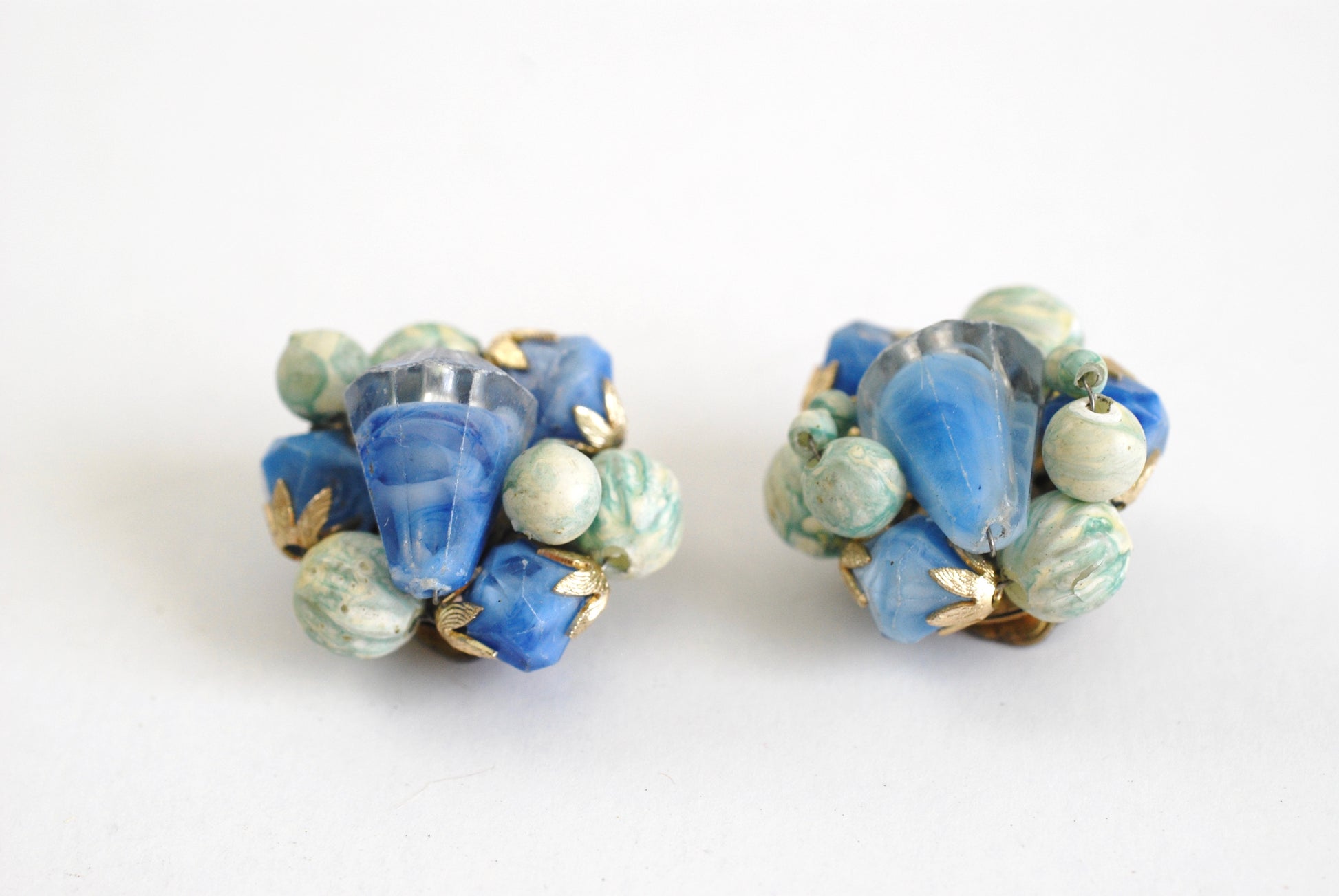 Here is a cute pair of vintage cluster earrings marked Hong Kong on the clips. They are set on a brass tone metal base and feature both round and faceted beads in different shades of light blue. The center bead is a hexagonal pyramid shape in swirled clear and light blue. Along the rim alternating beads are capped with floral shaped brass caps. The claps work very well although if you look very closely you can see signs of age. After all, these are around 60 years old and were well-loved.