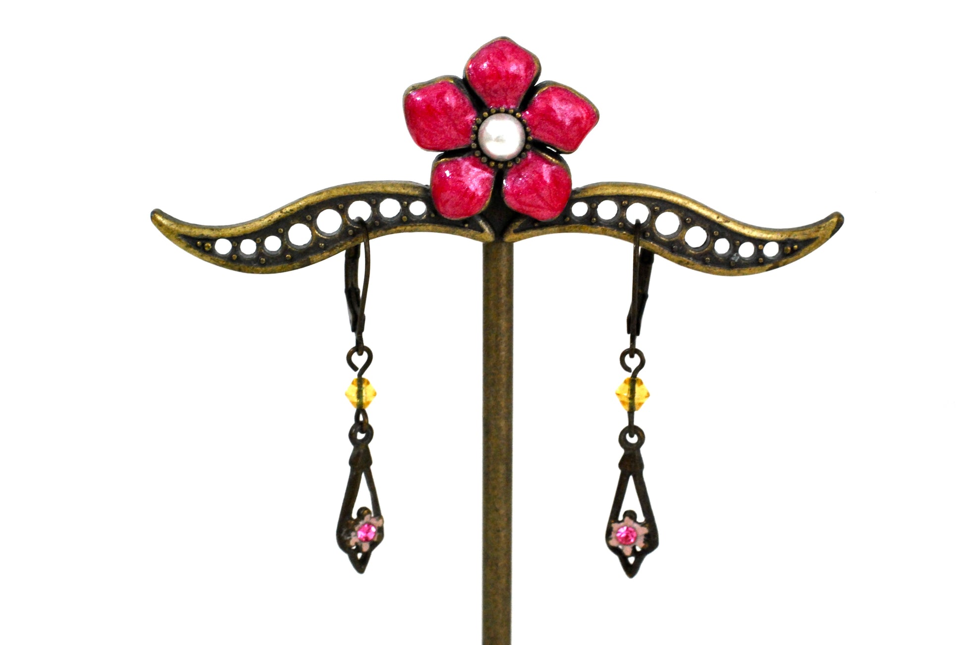 A very sweet pair of vintage bronze colored drop earrings in a style similar to 1928 Jewelry Co. These feature leverback ear wires with an elongated drop with a tiny pink enamel flower and centered with a single pink rhinestone. The drop hangs from single golden yellow bicone crystal bead.