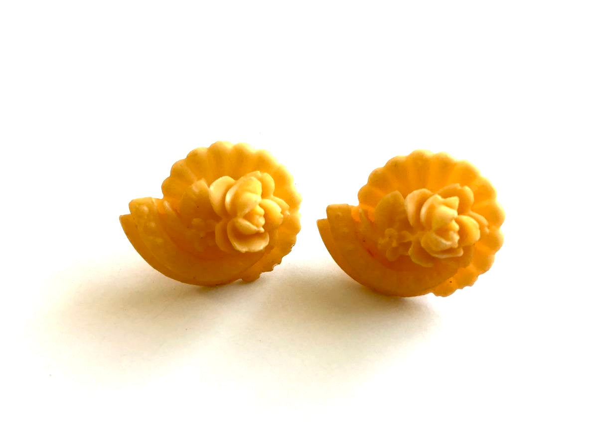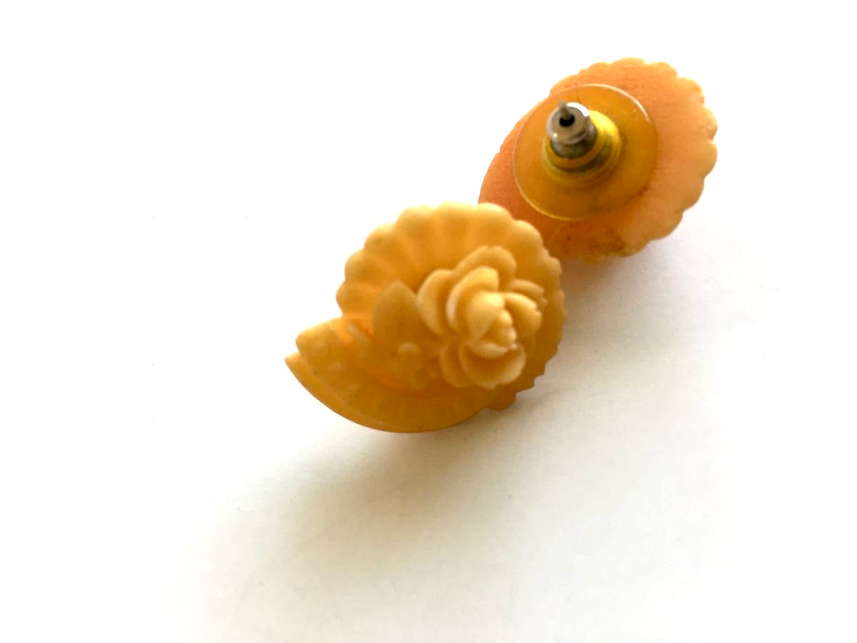 Pretty posies make up these fun vintage celluloid earrings. This lovely pair one earrings feature a center rose with leaves surrounded by a circular rosette and two curved ribbons below. The celluloid has a beautiful aged ivory shade. These are pierced post style earrings. They would make a wonderful gift.
