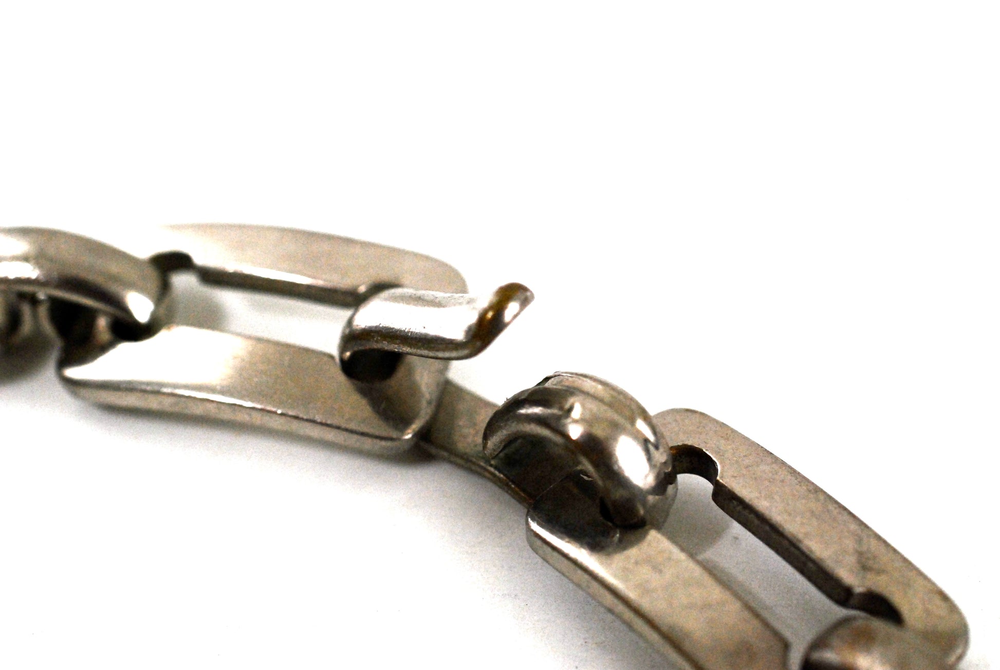 This big and bold choker length necklace sits close to the collarbone. It's made of solid heavy steel and has a simple hook clasp. A very old piece that fits perfectly with newer bold styles. Make a statement by adding a delicate chain with this piece for a goth or biker look. Industrial look chain from the 1940's.