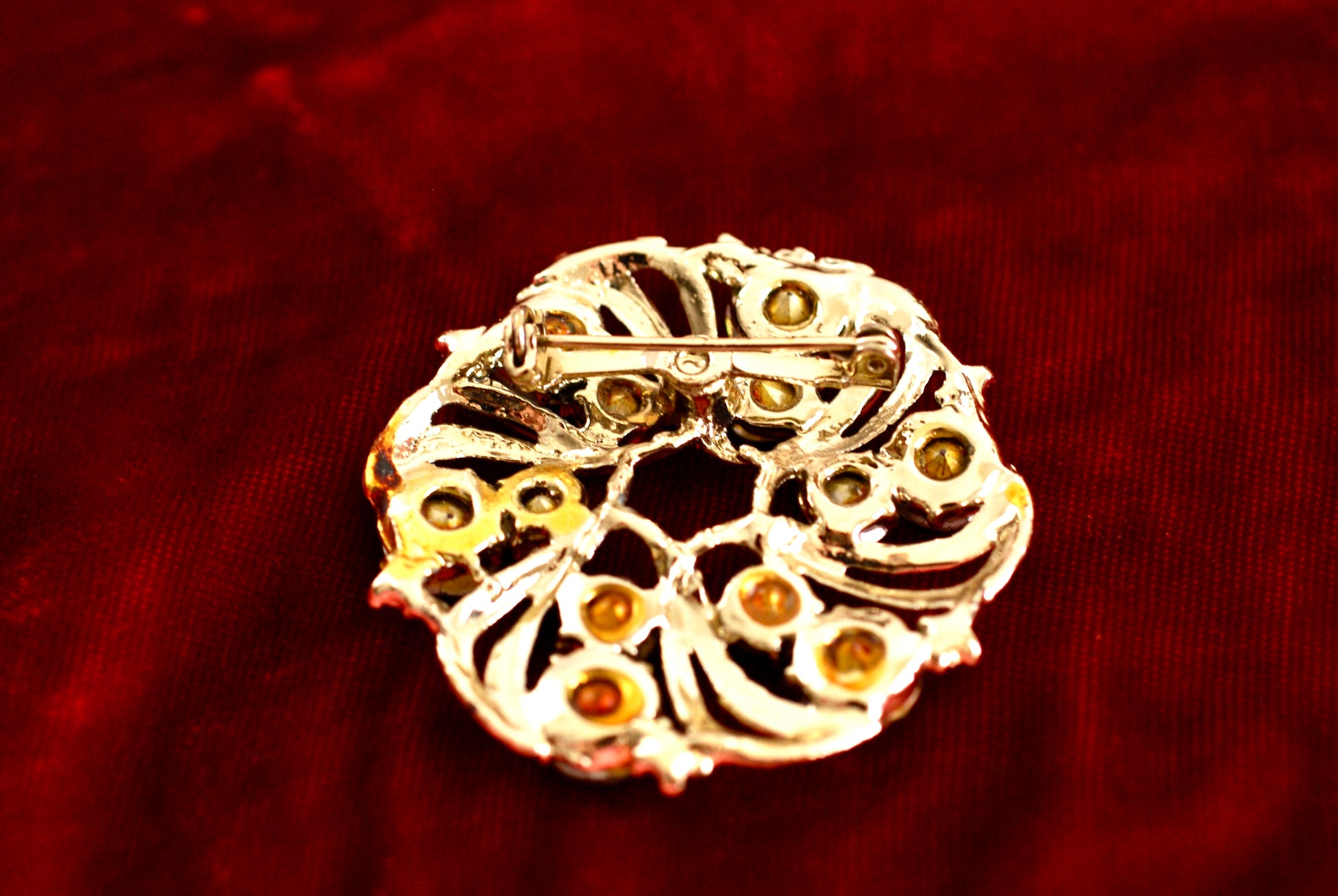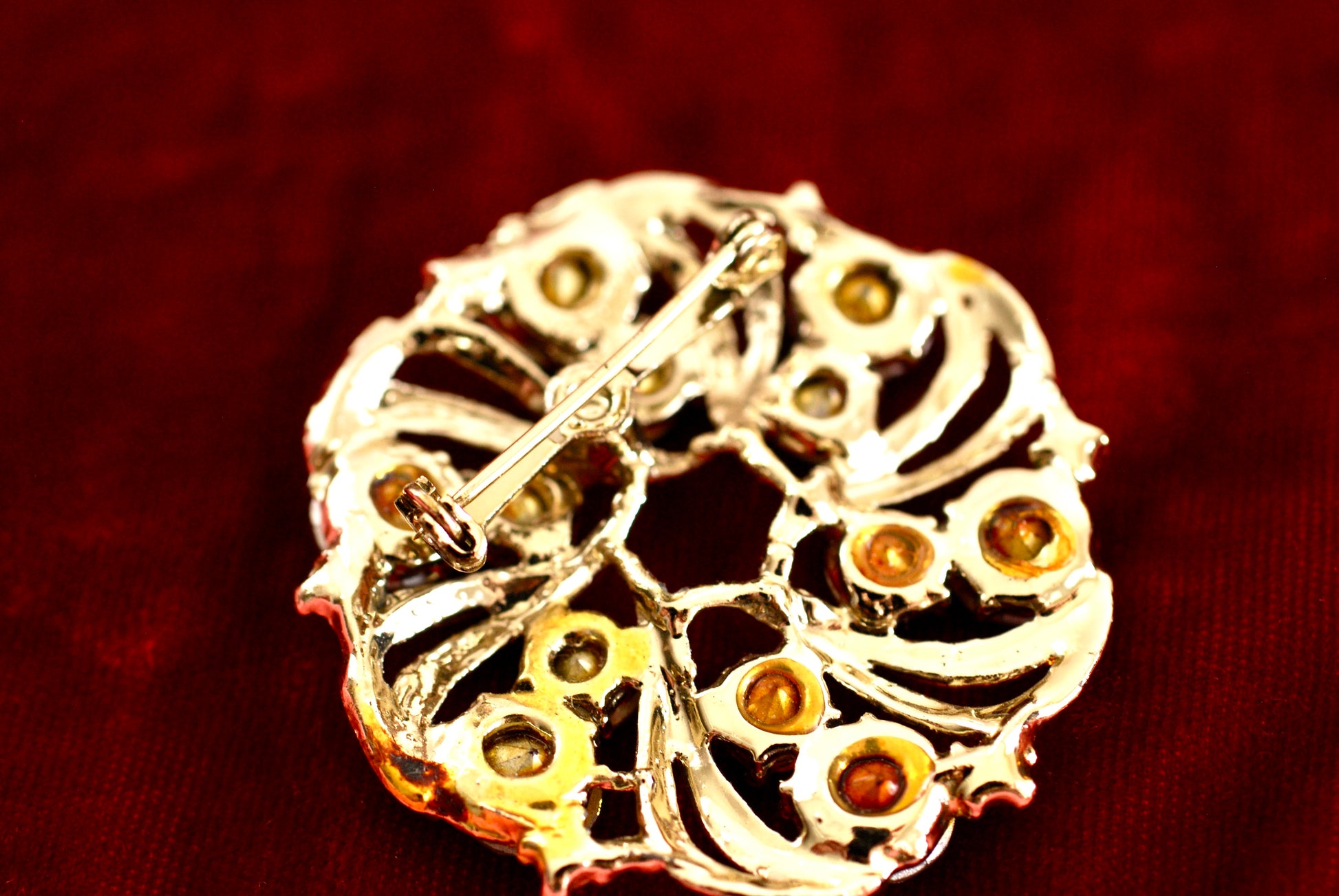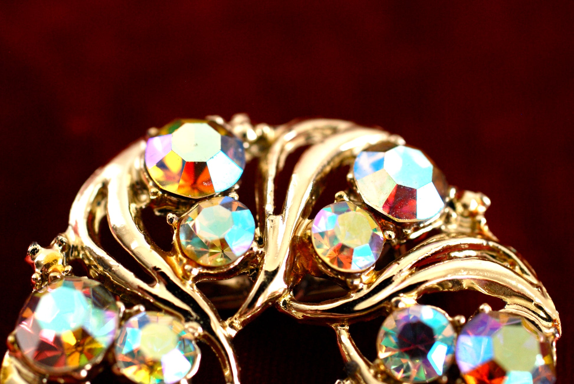 Beautiful gold tone circle brooch. Absolutely gorgeous large aurora borealis rhinestones. The colors are amazing! This is such a wonderful pin with bright shine and a fabulous array of colors. This would make a great gift.