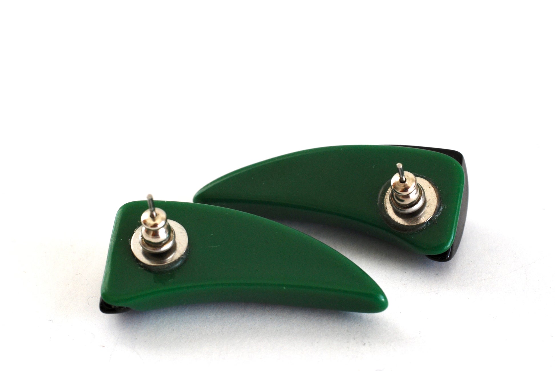 Vintage 1970s green and black plastic earrings in the shape of a horn. These are pierced post style earrings. The top is black in a triangle shape and overlays the horn shaped base in a medium green. Made of molded plastic, these are lightweight and feature silver tone metal posts.