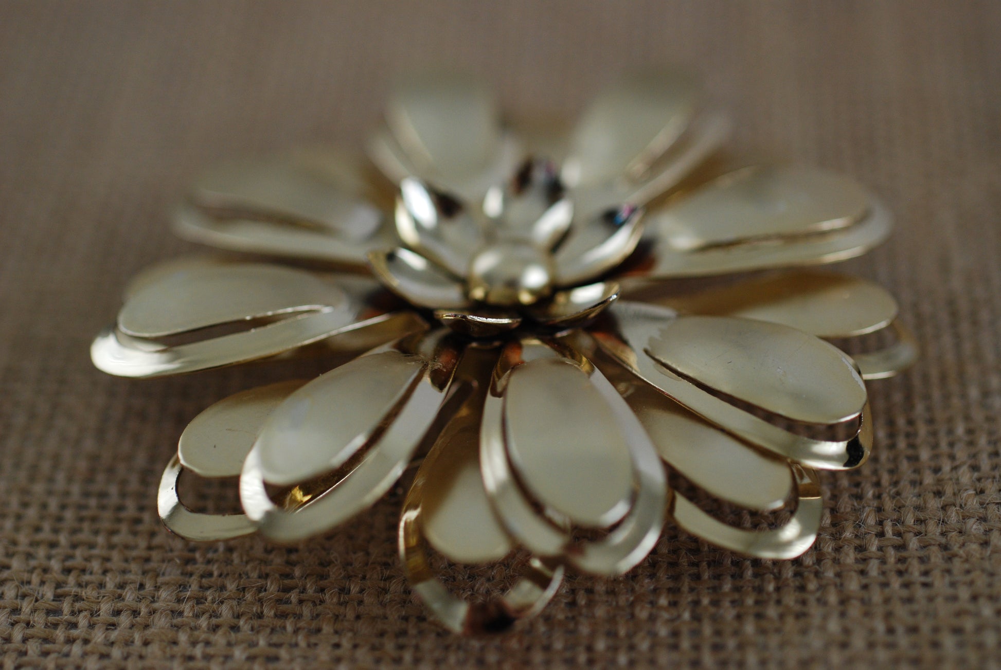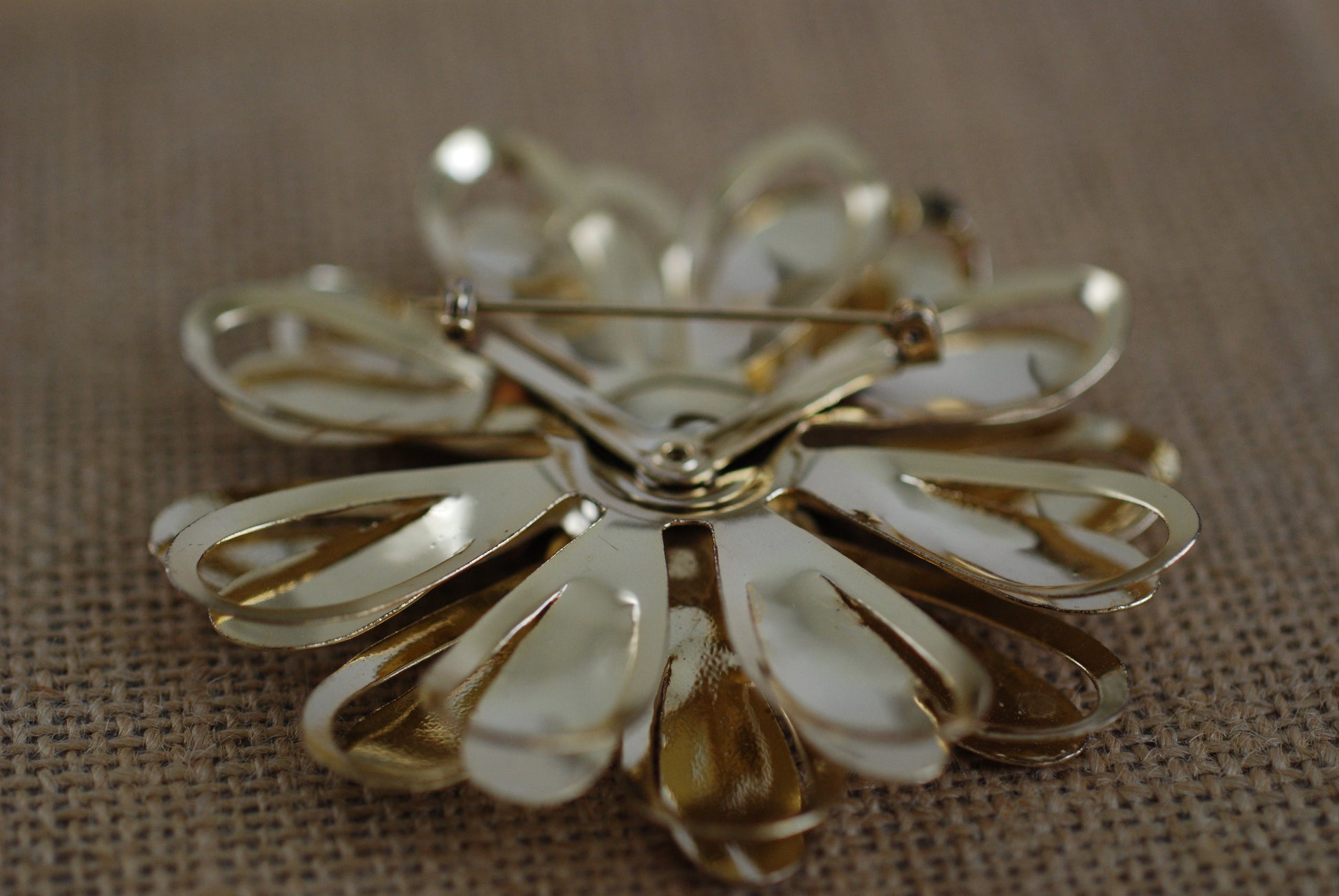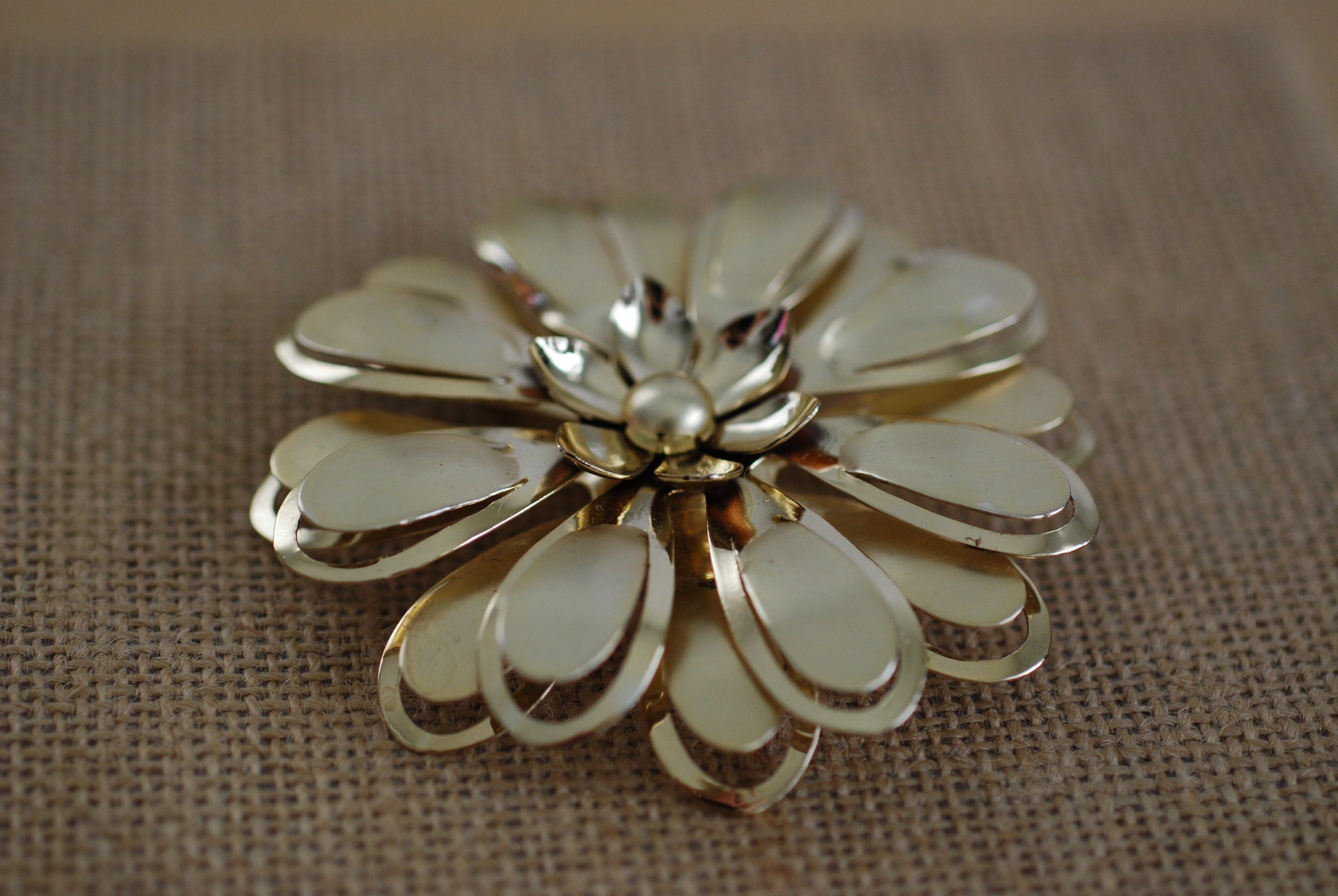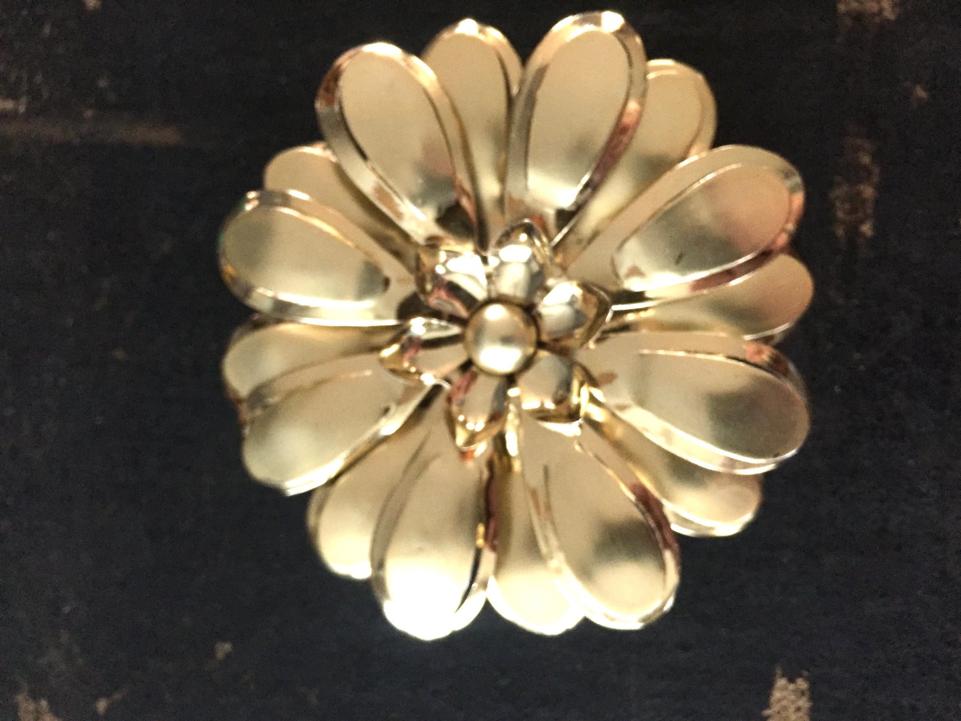 Vintage 1970s oversize gold tone metal flower brooch. This huge daisy shaped multi-dimensional flower pin features double cut petals in both a shiny and matte finish. Has a secure c clasp closure on the back and is very lightweight. Shows very minor signs of wear appropriate for its age. The perfect accessory for a coat or hat.