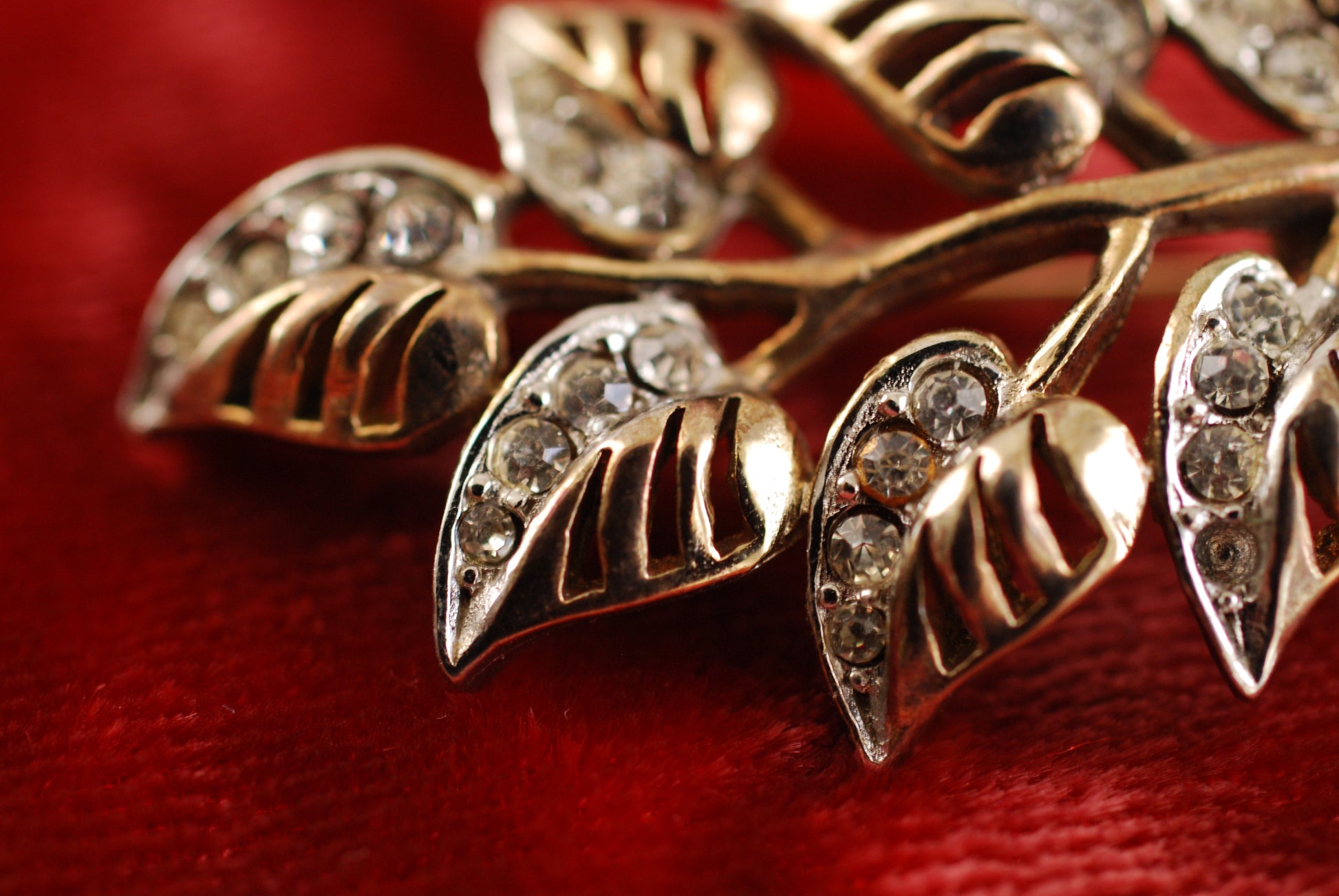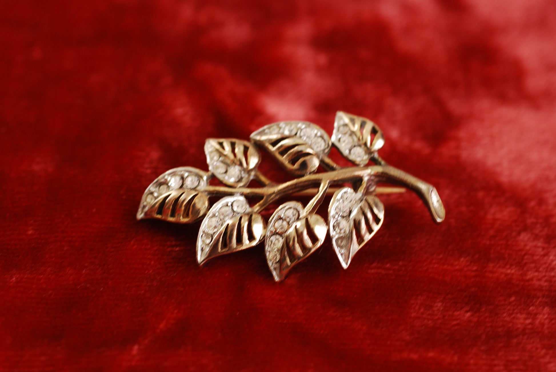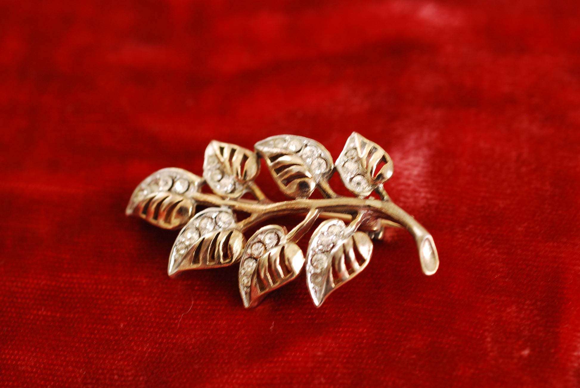 This lovely brooch features several leaves on a stem with openwork leaves studded with rhinestones on one side of each leaf. Beautiful detail on this vintage pin. No markings on this piece. It would make a great gift.