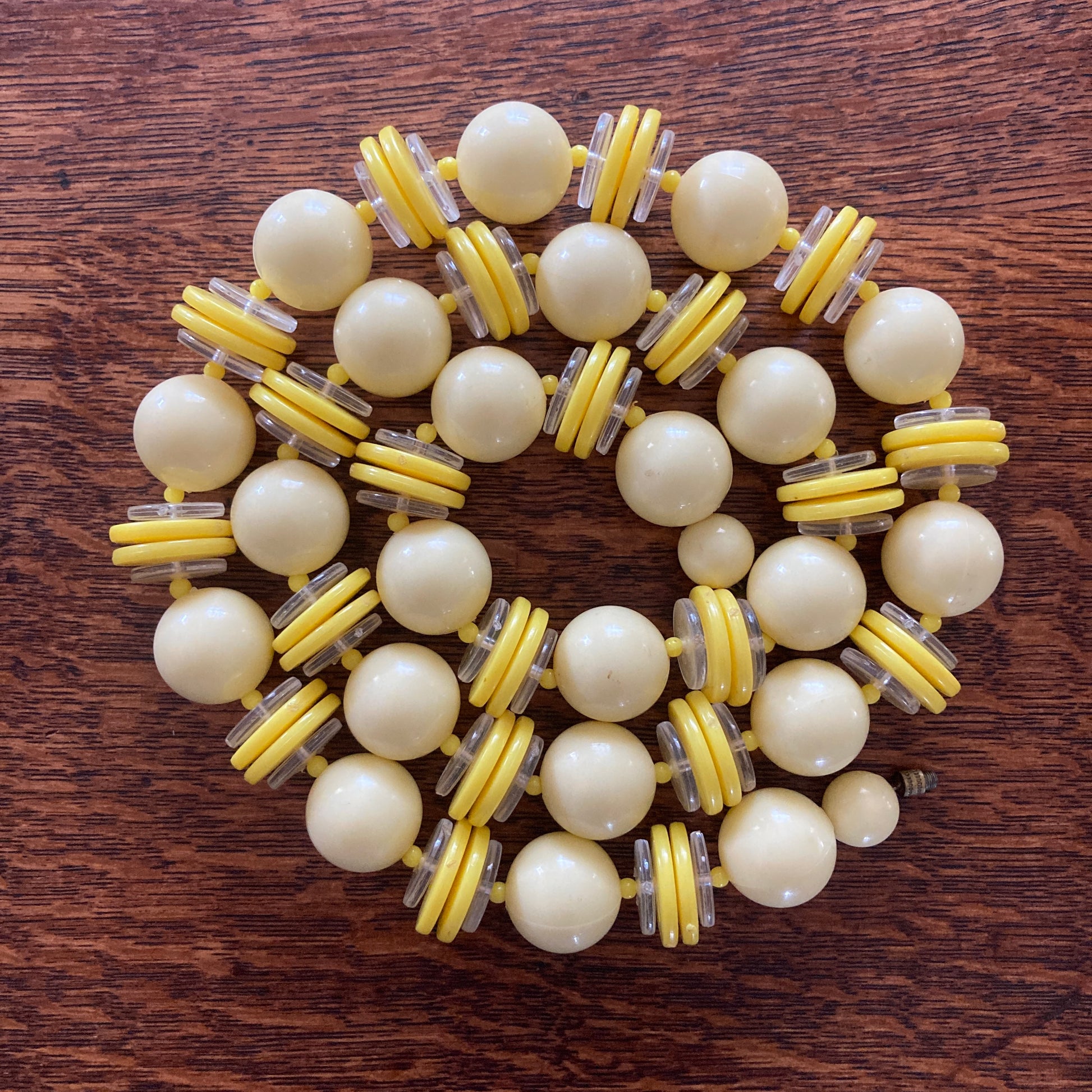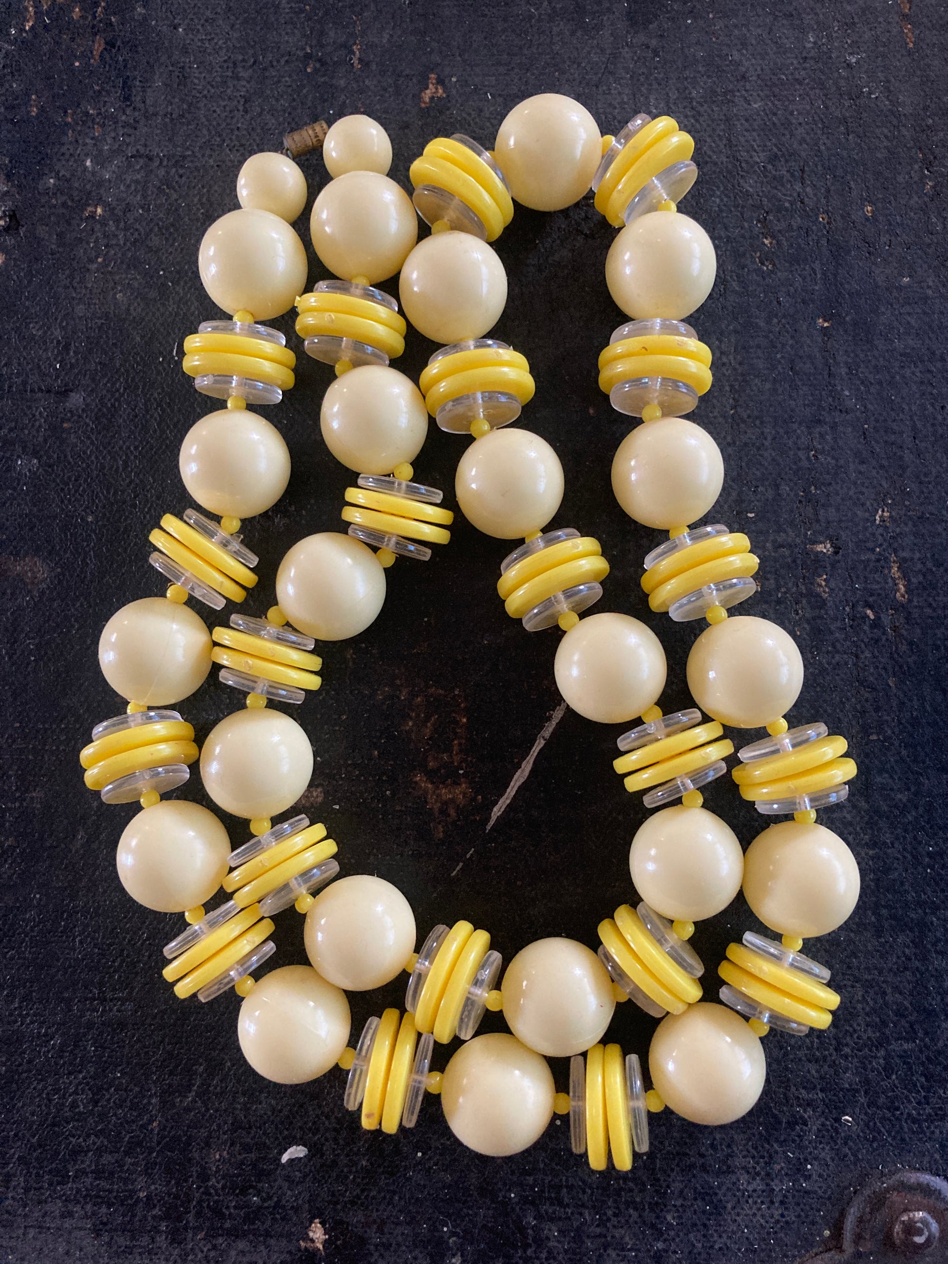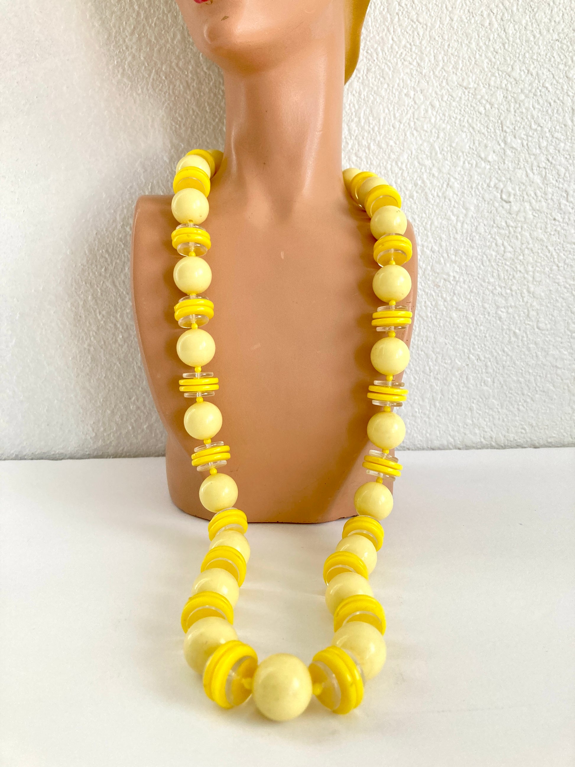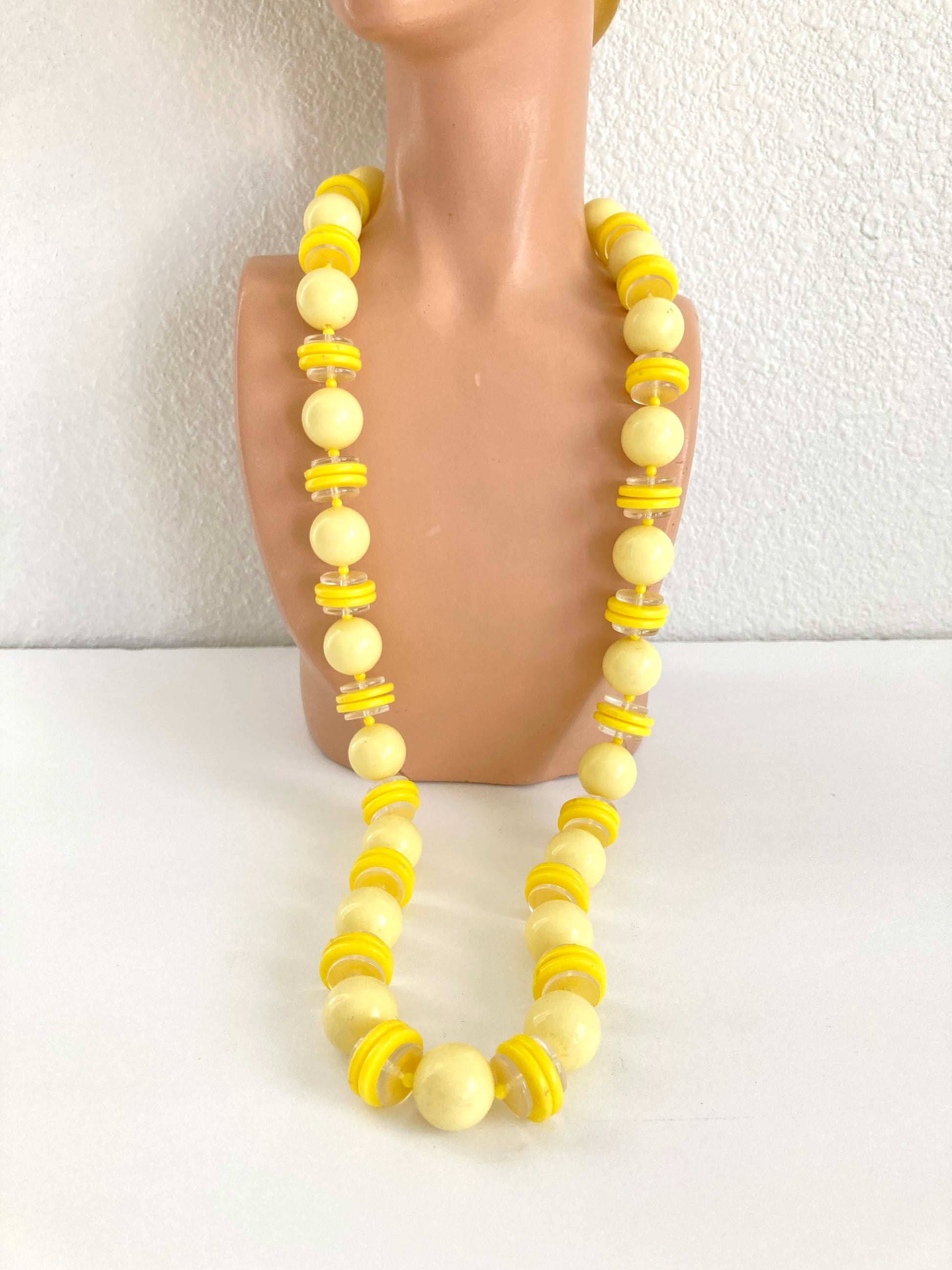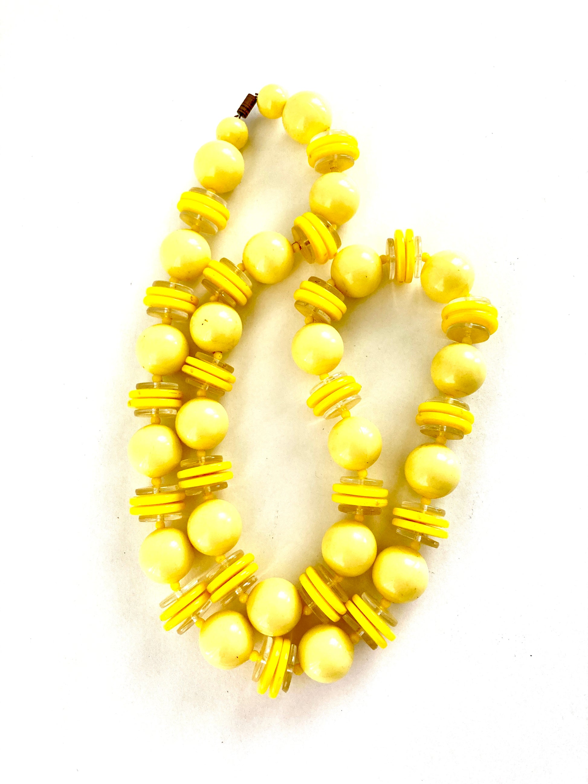 Here's a fun necklace to brighten your look. Created in shades of pale and lemon yellow with clear accents. This longer-length chunky beaded necklace hails from the Twiggy ear 1960s. It features a brass barrel clasp original to the necklace and has a combination of large pale yellow sphere beads along with lemon yellow and clear discs separated by tiny round yellow spacer beads. Worn with a T-shirt and jeans or a retro shift dress, this necklace will add just the right touch of color and fun to your casual look.