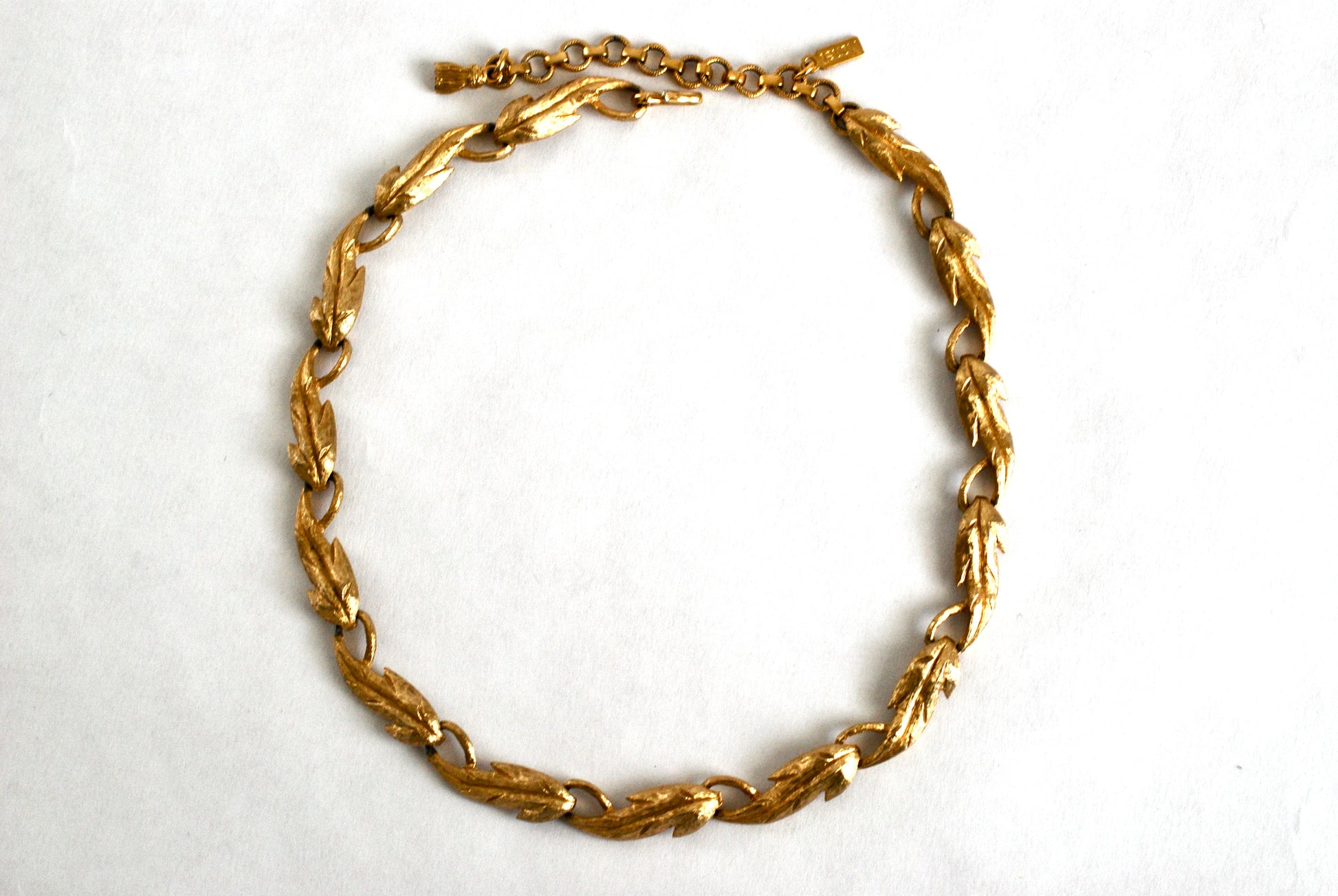 Beautiful and delicate vintage Monet leaf shaped link choker necklace in goldstone metal. This lovely necklace features elongated textured leaves with an adjustable chain closure ending in a sweet lettuce metal tassel. It includes its original metal hang tag stamped Monet with the copyright symbol on the back of the hang tag. Adjustable from 13 1/2" to 16" this is a timeless piece that can be worn for many years. In excellent condition.