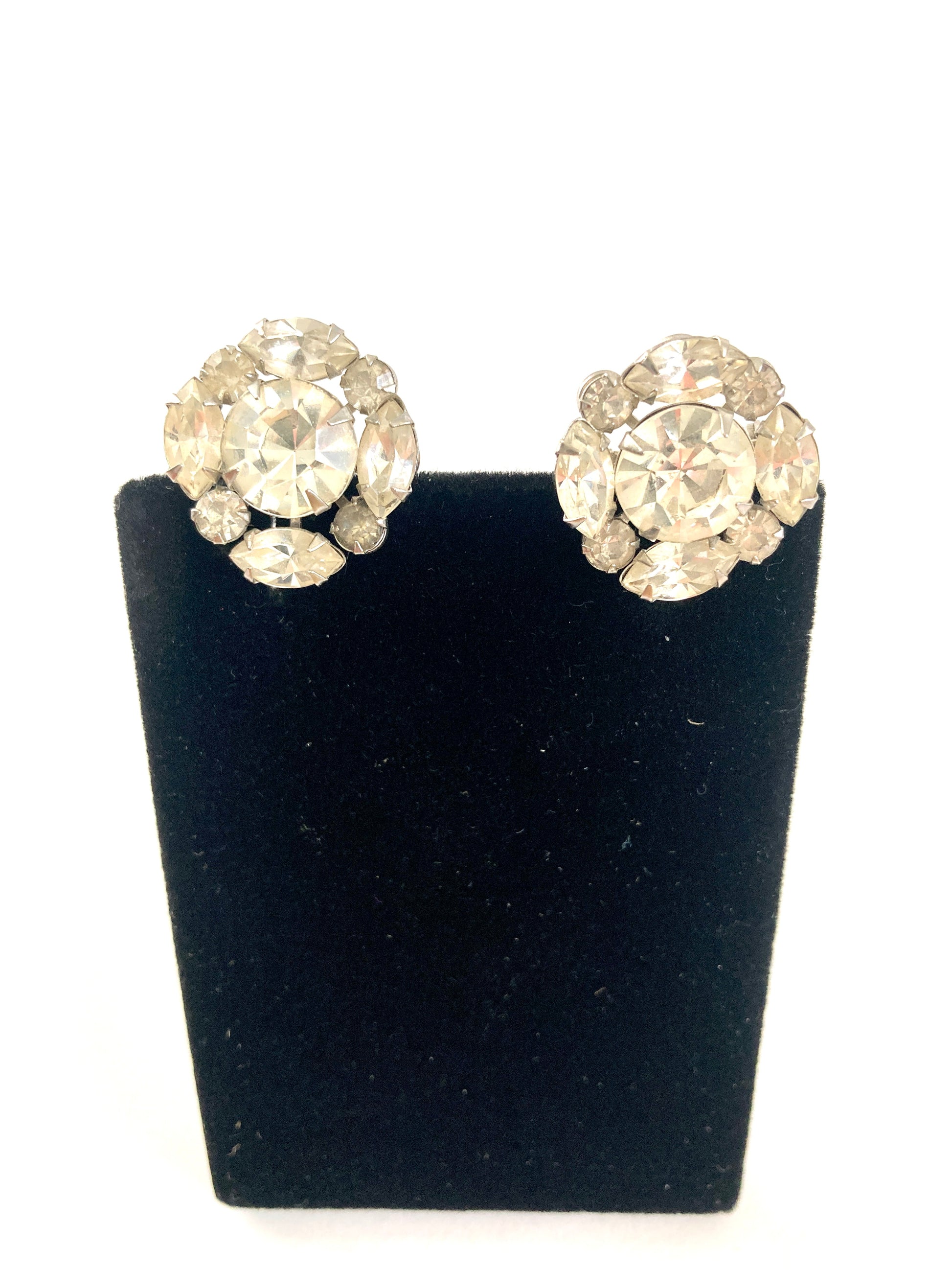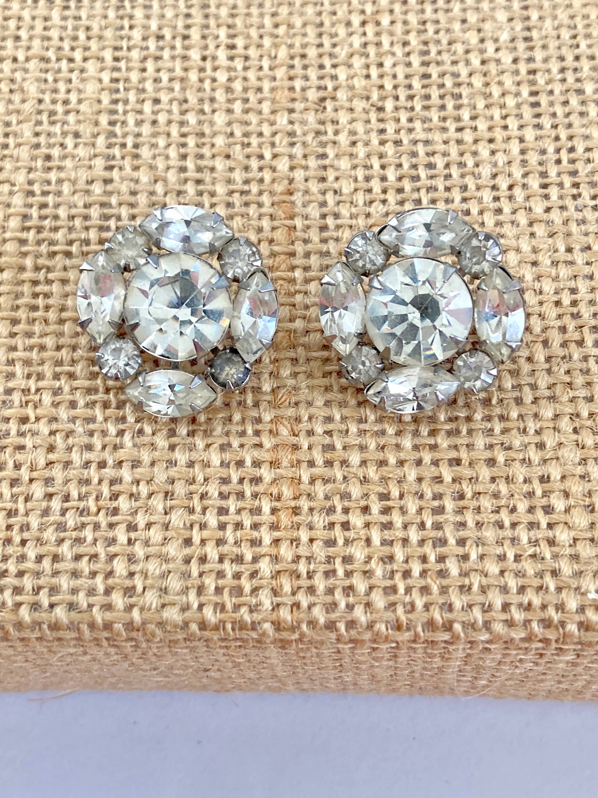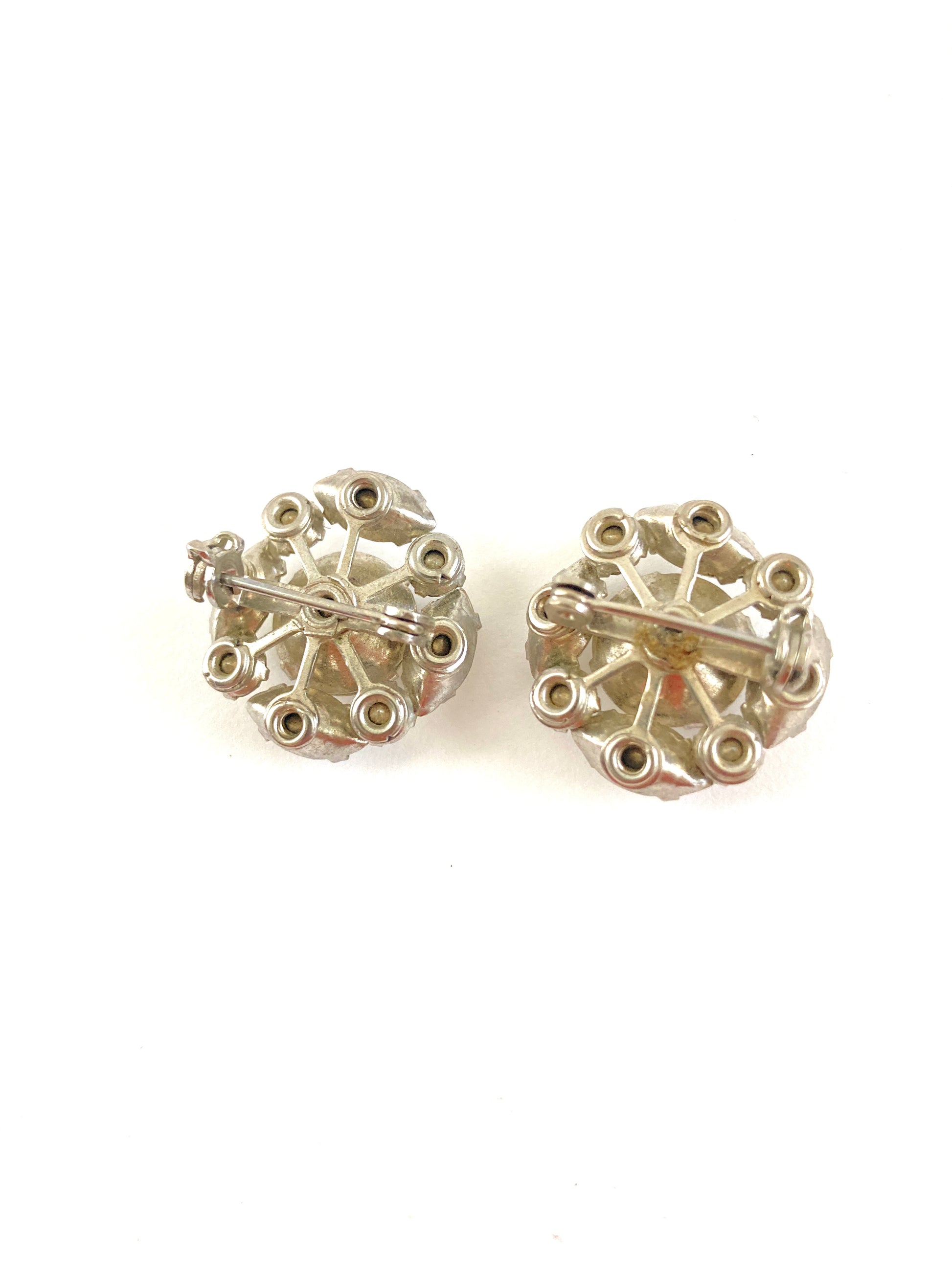 This pair of small scatter pins at first glance look like a pair of earrings. They feature a large center faceted stone surrounded by four smaller marquis stones and four small round stones. Set on a silver-tone metal backing with rivet set backs. The rhinestones are prong set with foil backings. There is one stone that has lost some of its color and is a bit dull. The pinbacks have rollover closures that work well. These would look fabulous on the collar of a blouse or jacket.