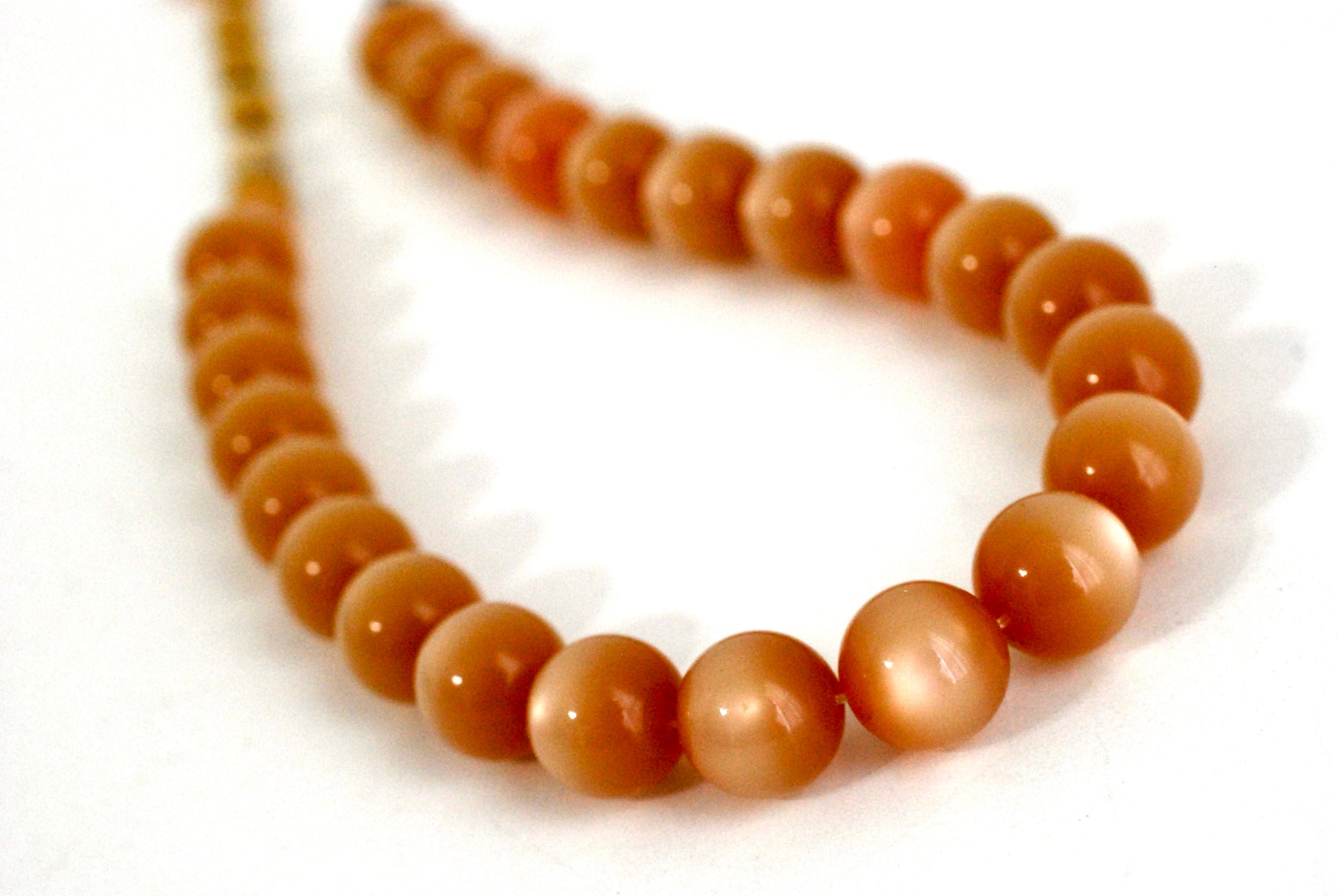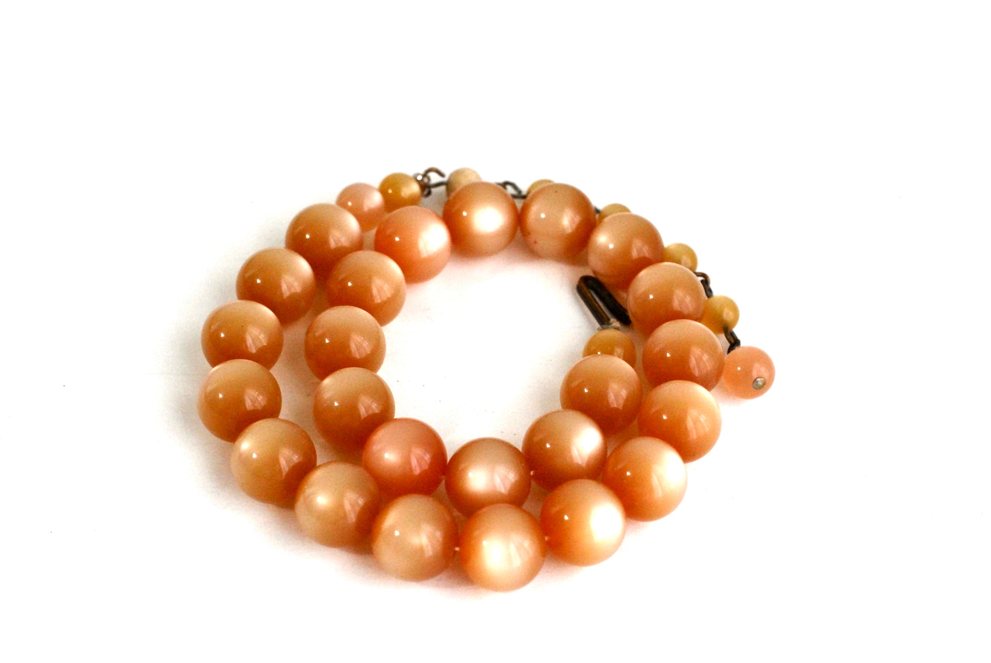 Gorgeous peach moonglow beaded choker necklace. This beauty hails from the late 1950's to early 1960's. Made of thermoset plastic beads ending in an adjustable link chain of smaller beads. Two of the smaller beads toward the back have a bit of damage. Closes with a brass hook closure. No markings.