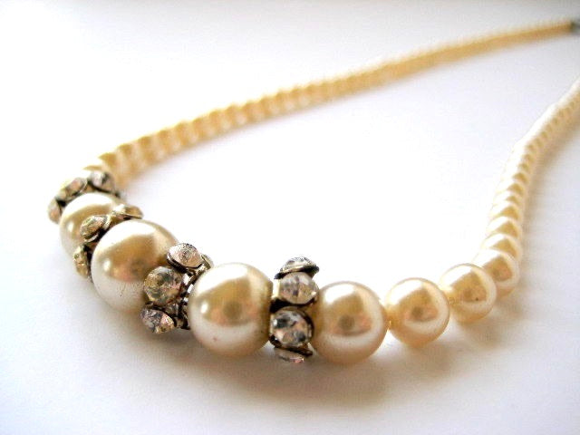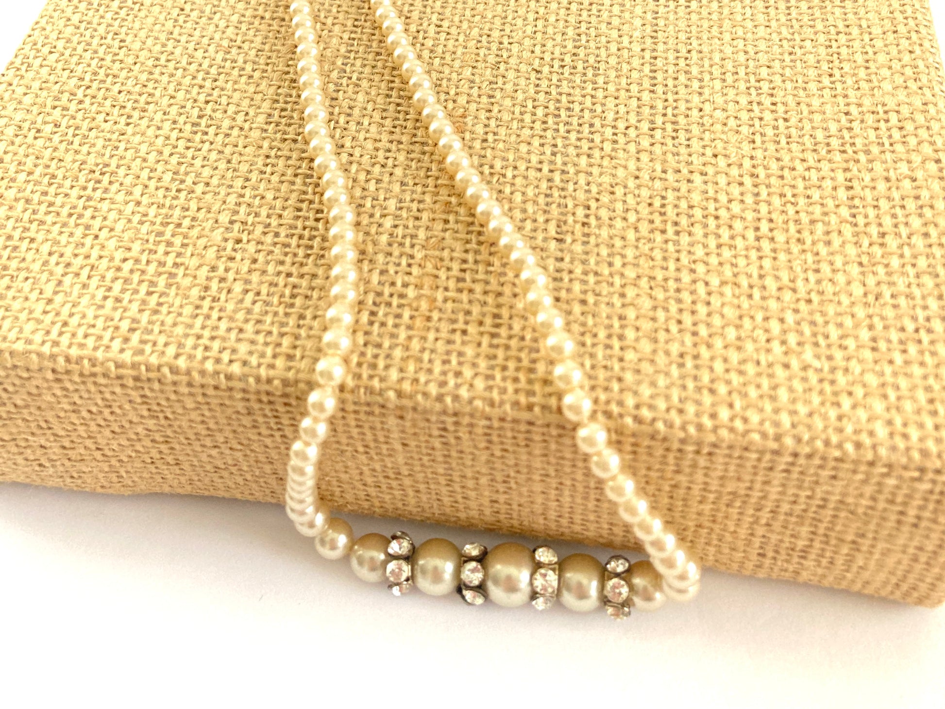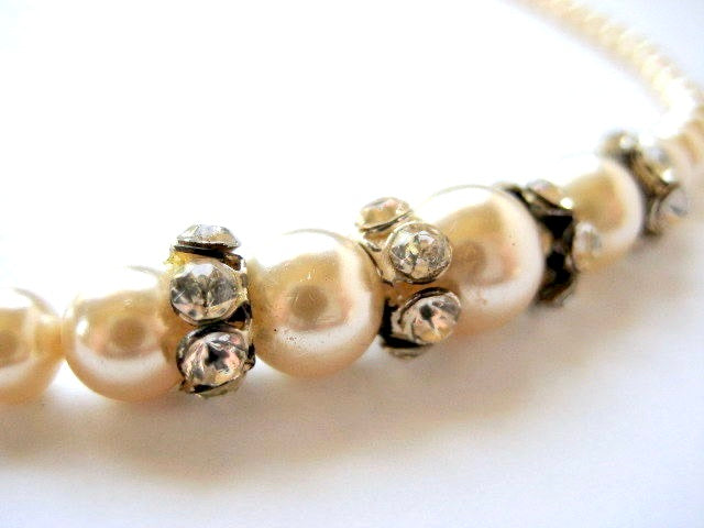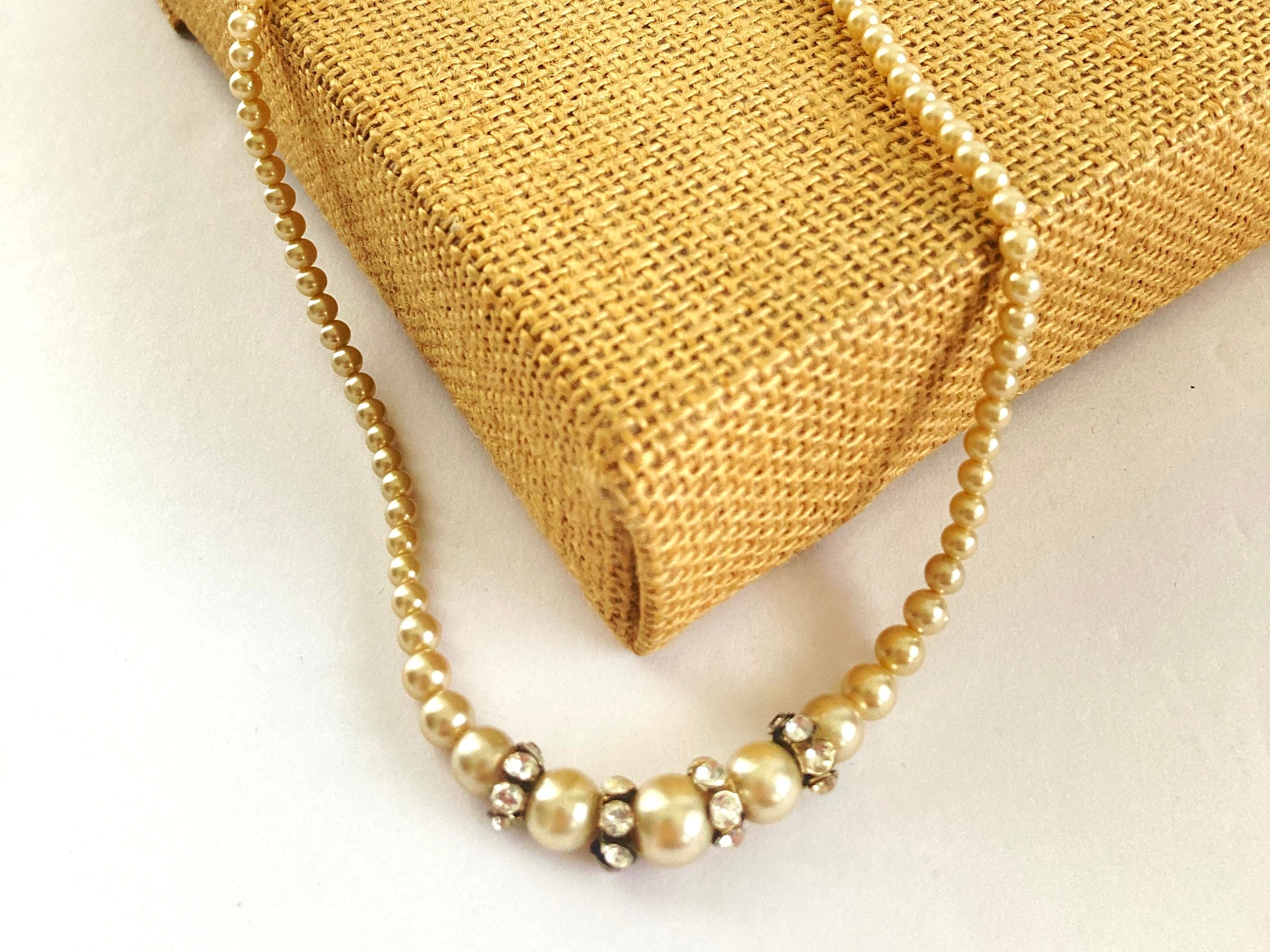 Vintage pearl and rhinestone necklace. Champagne-graduated faux pearls have beautiful rhinestone spacers that set off the color and sparkle of these delicate beads. This necklace is most likely from the 1950s or 1960s. It has not been restrung and is all original. the pearls retain their luster and color with no visible wear.