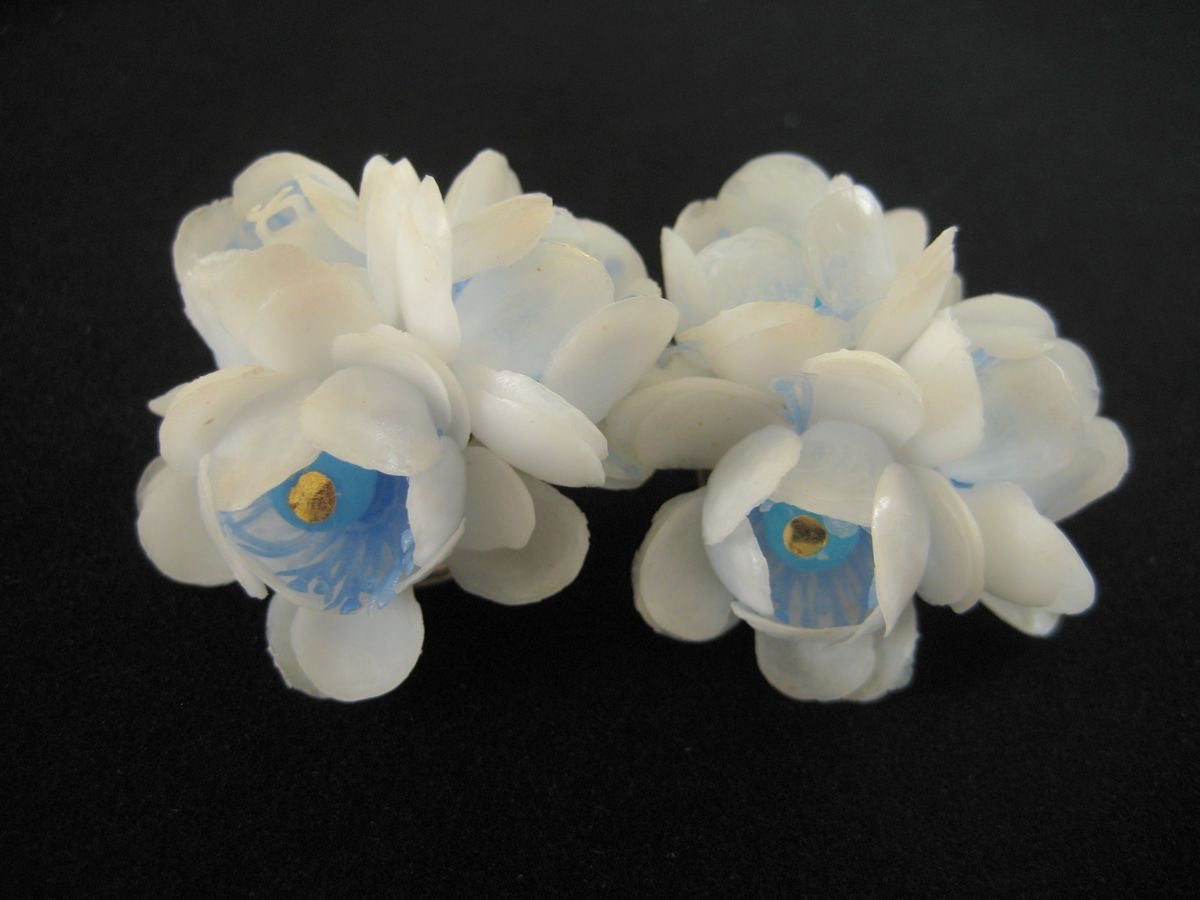 The cutest pair of vintage plastic flower earrings. These are made of soft molded plastic in white with blue stamen and blue bead centers. These resemble white anemone flowers. Each one is a cluster of three flowers with gold tone center pins. The sit on gold tone clip on style backs. One back has been replaced and does not match. This however does not affect how the earrings work or look. Priced accordingly.