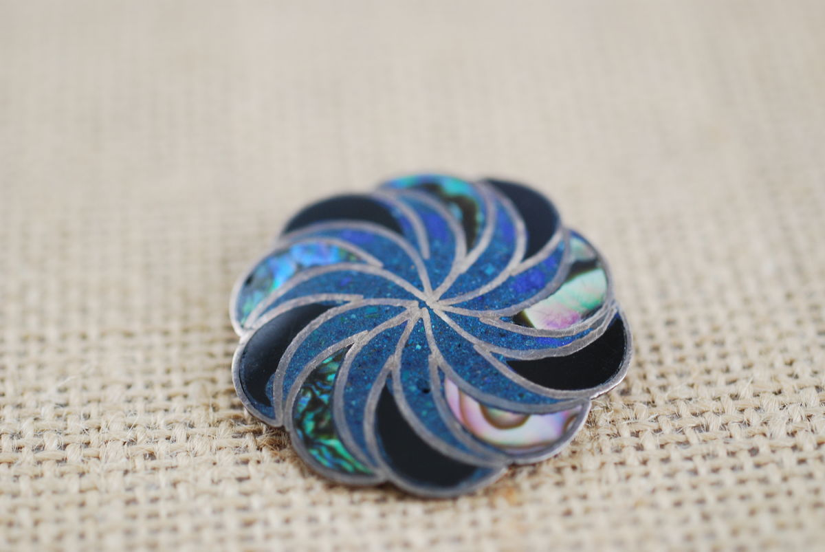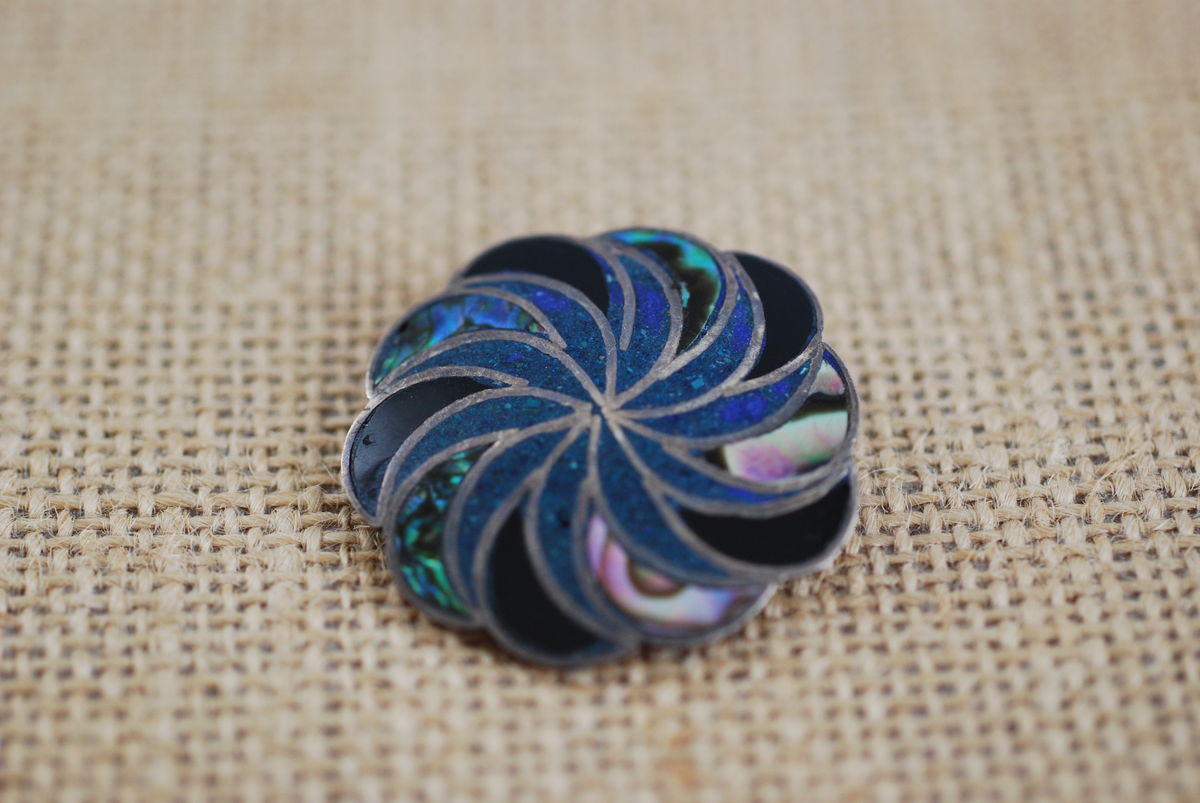 Vintage Taxco Sunburst Brooch/Pendant in Crushed Turquoise, Abalone, Onyx