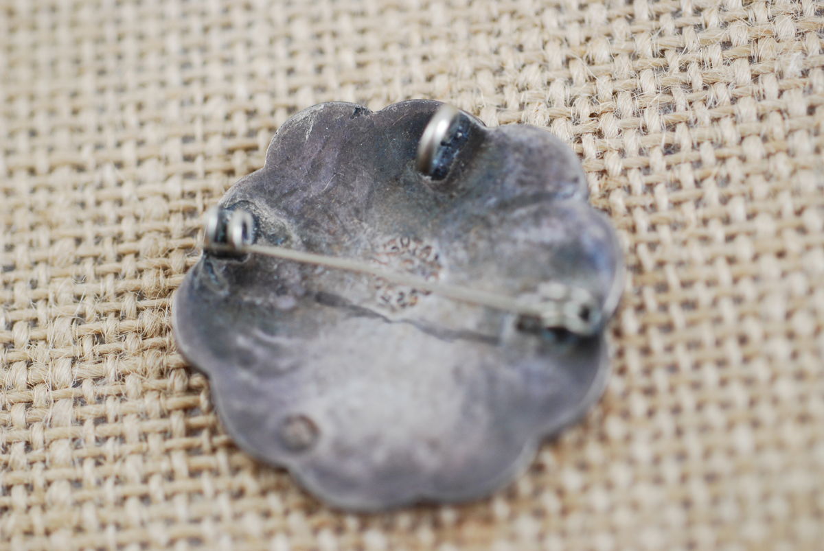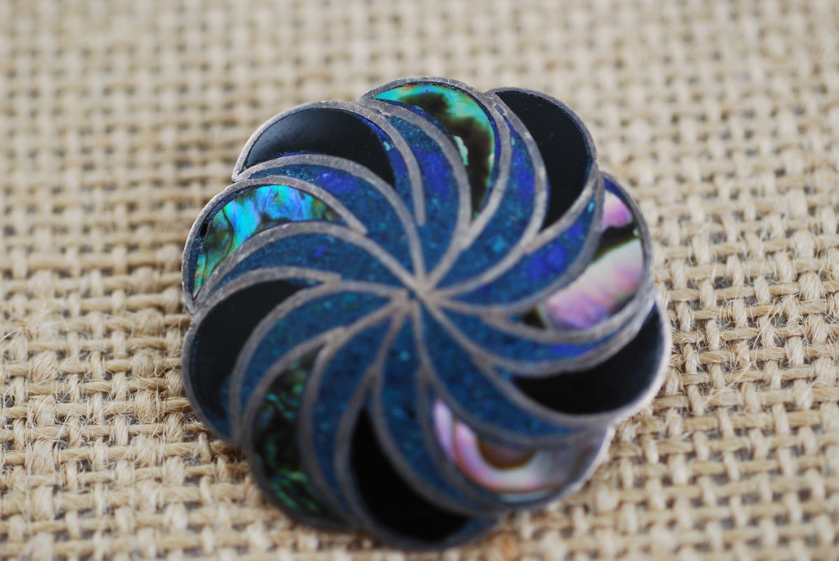 Signed sterling silver brooch/pendant combo. This beautiful sunburst piece features crushed turquoise, abalone shell, and black onyx inlaid into 925 sterling silver. Signed and stamped on the back with Mexico, Taxco, 925, the makers initials and the Mexican eagle mark. This is a beautifully made vintage piece with fabulous patina. It can be worn as a brooch or pendant. Made with a fixed ring for threading a chain and a pinback with a c clasp.