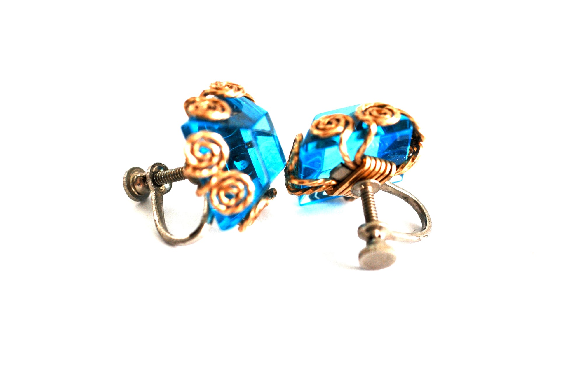 A gorgeous shade of clear blue stones surrounded by gold tone wire wrapped metal. These are lightweight to wear and reflect the sunlight beautifully. The pattern of the wire wrap shows through and adds interest to shape of the earrings. They sit on a silvertone screwback base. The center stones are high quality plastic. No markings.