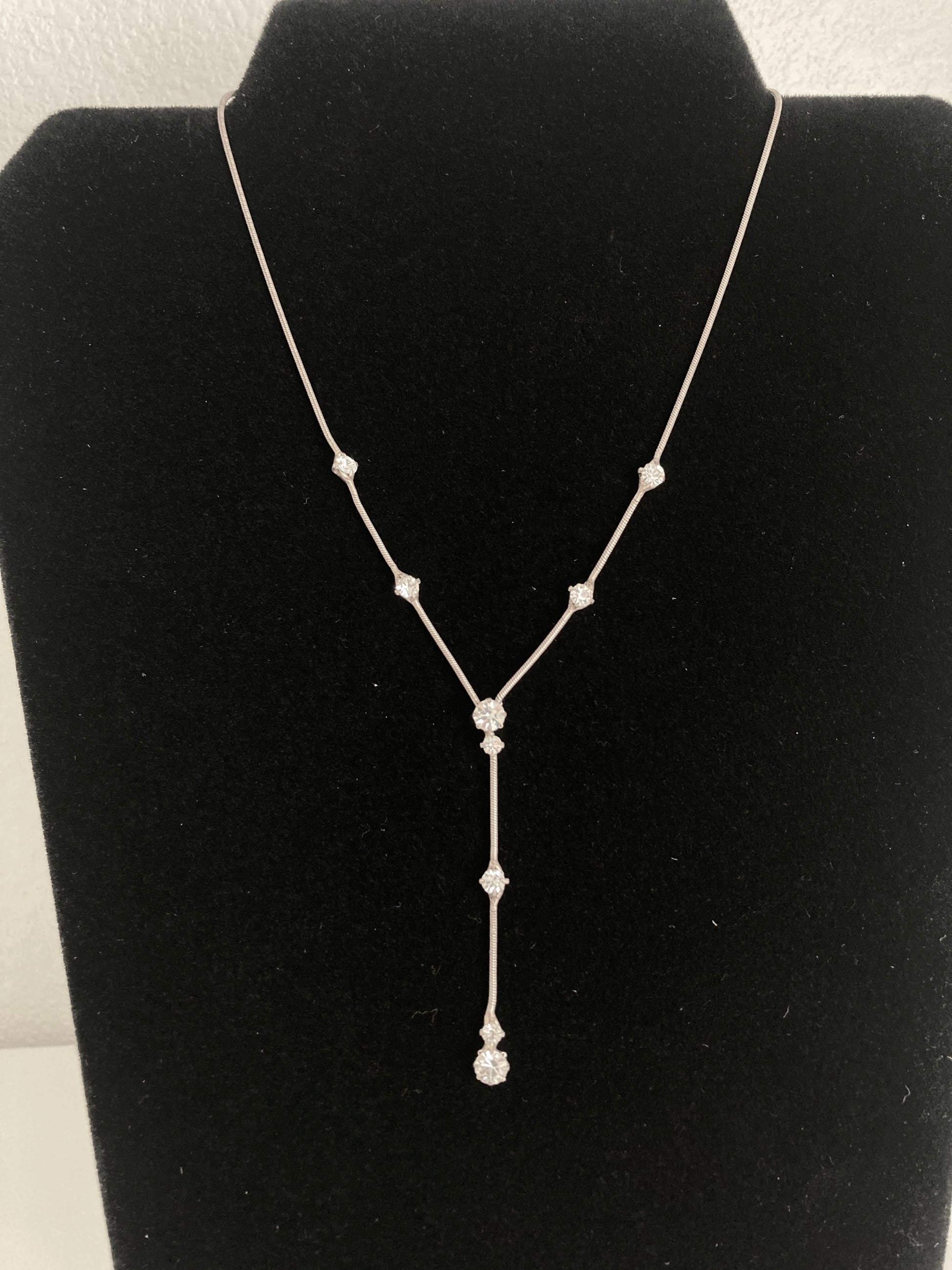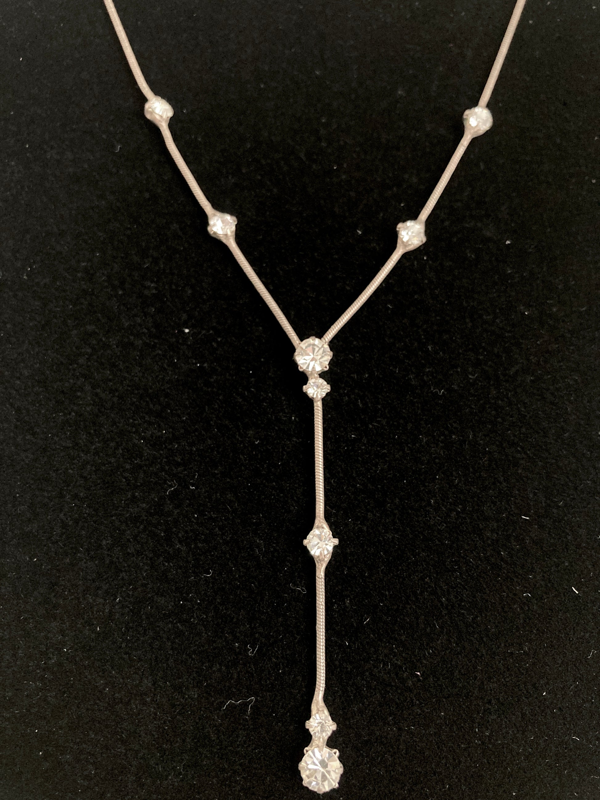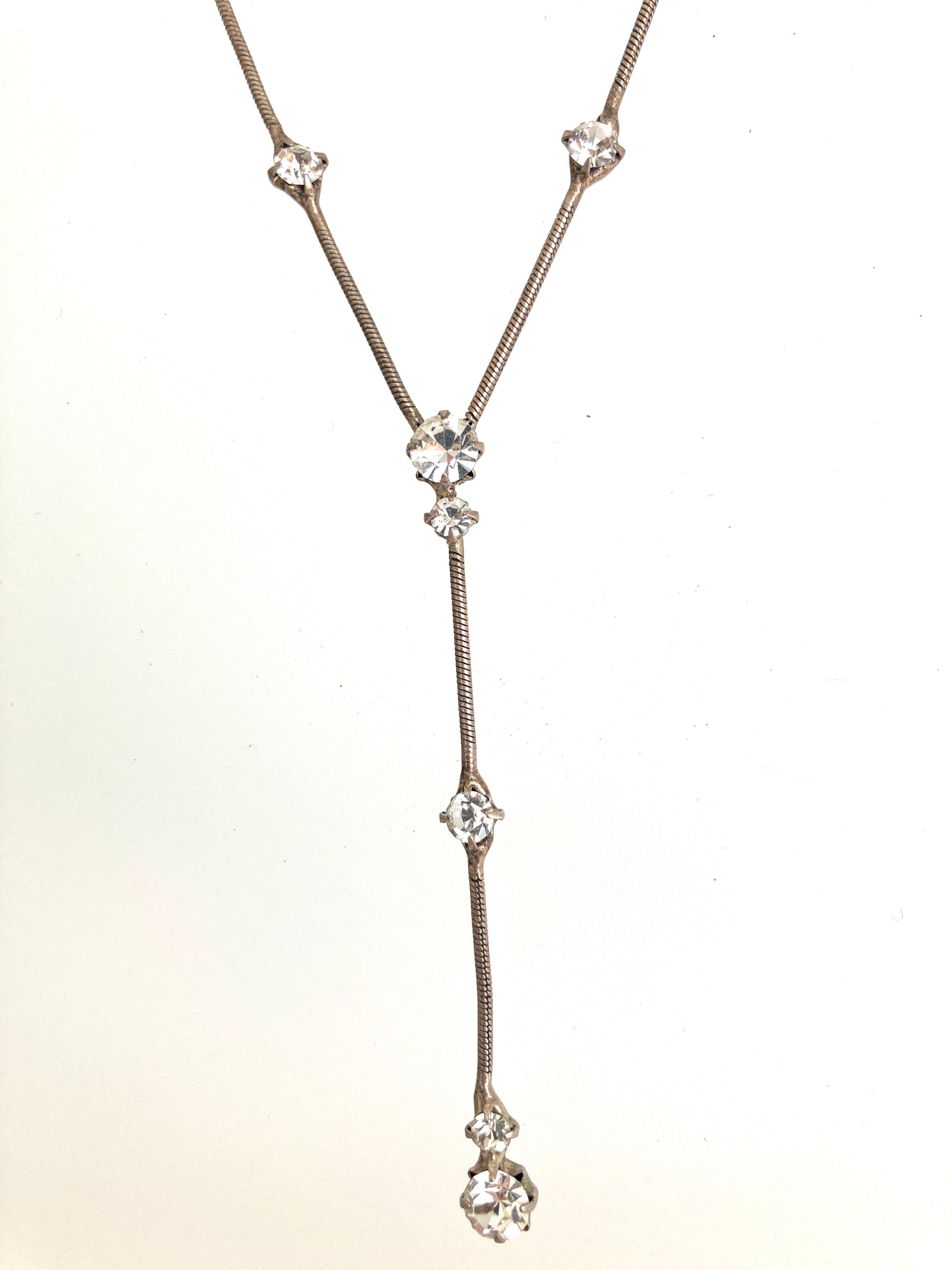 Simple and sophisticated, this vintage Y necklace is set on a narrow snake chain and is dotted with clear rhinestones set in closed backs. The clear stones vary in size and the necklace ends with a double stone at the end of the Y. The necklace is adjustable with a chain and lobster clasp. Hangs beautifully at the throat.