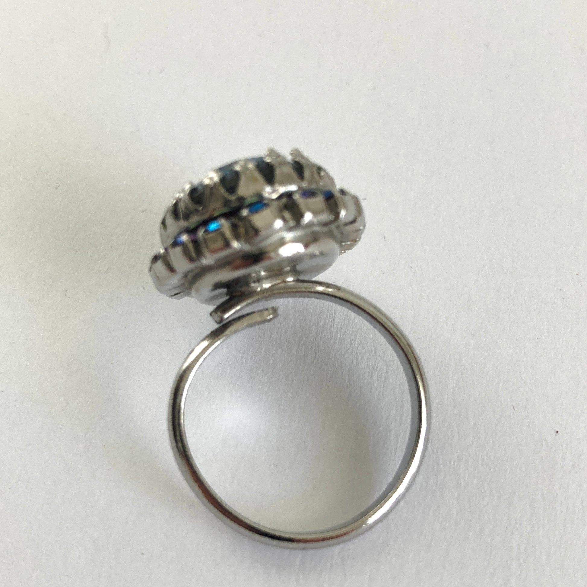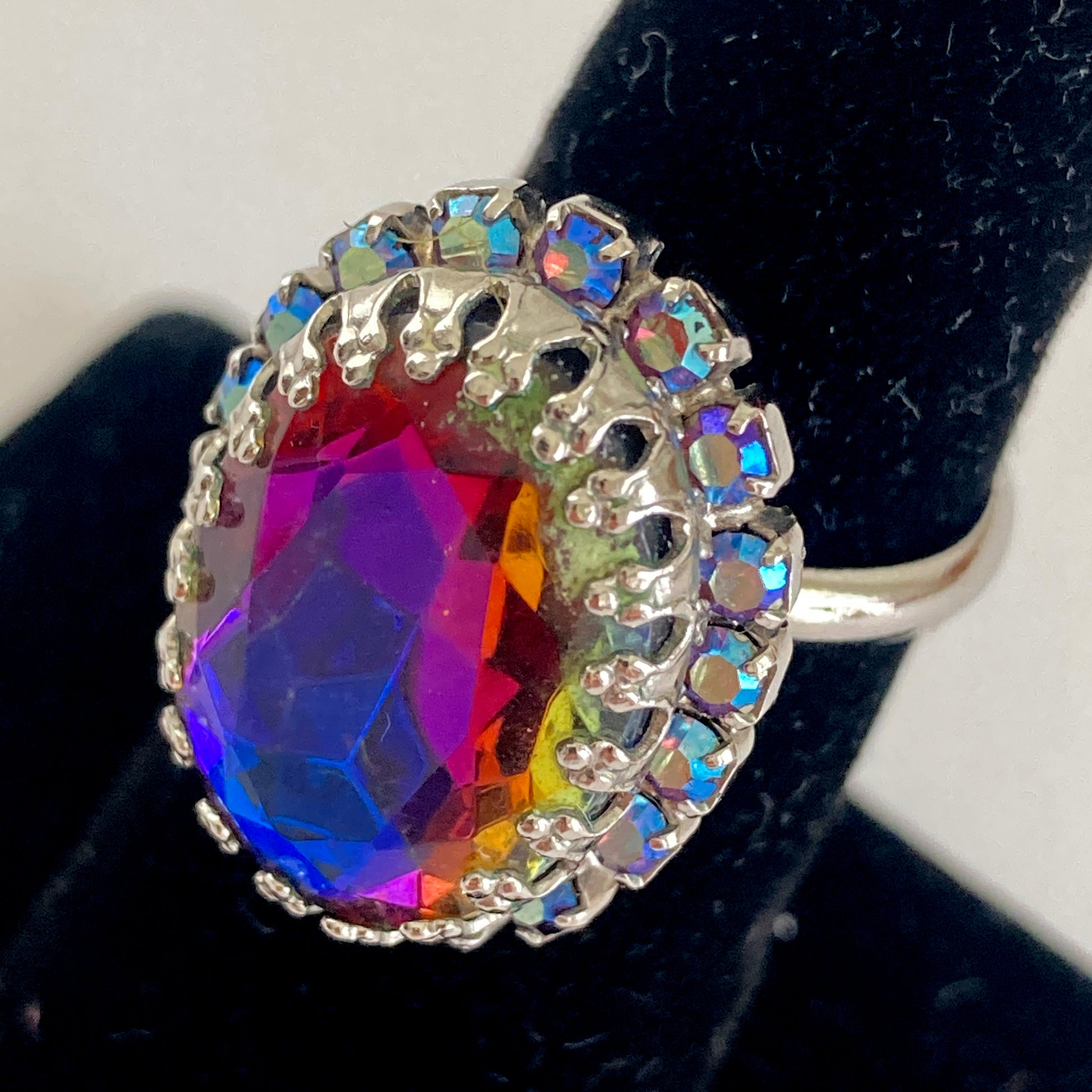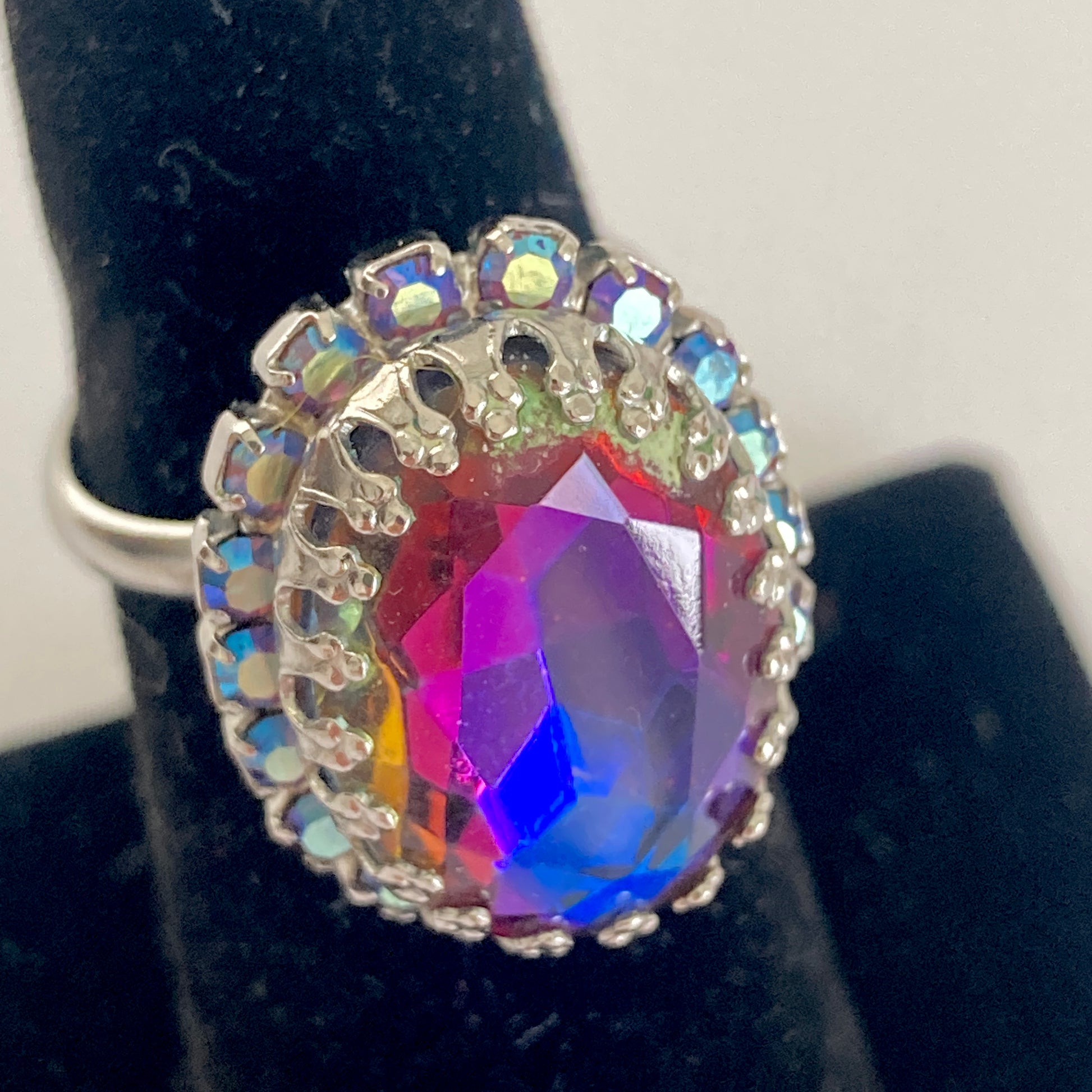 A fabulous eye-catching ring featuring a large oval faceted vitrail center glass stone set with fleur de lis prongs and edged with matching aurora borealis stones. All set in silver-tone metal on an adjustable band. The center stone's colors change in a rainbow of colors dependent upon the light and angle looked at. The ring is currently a size 7 1/2. Unmarked.