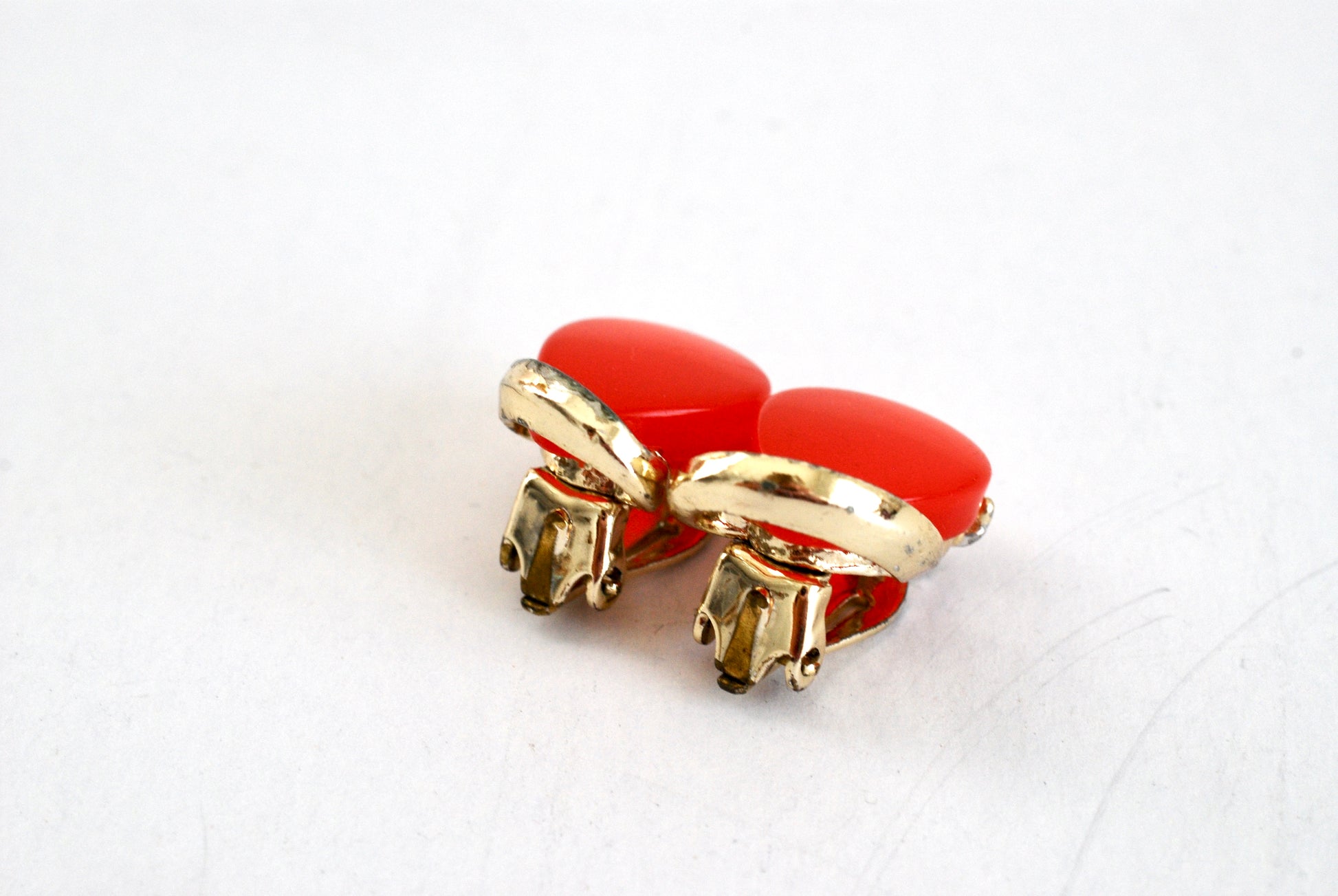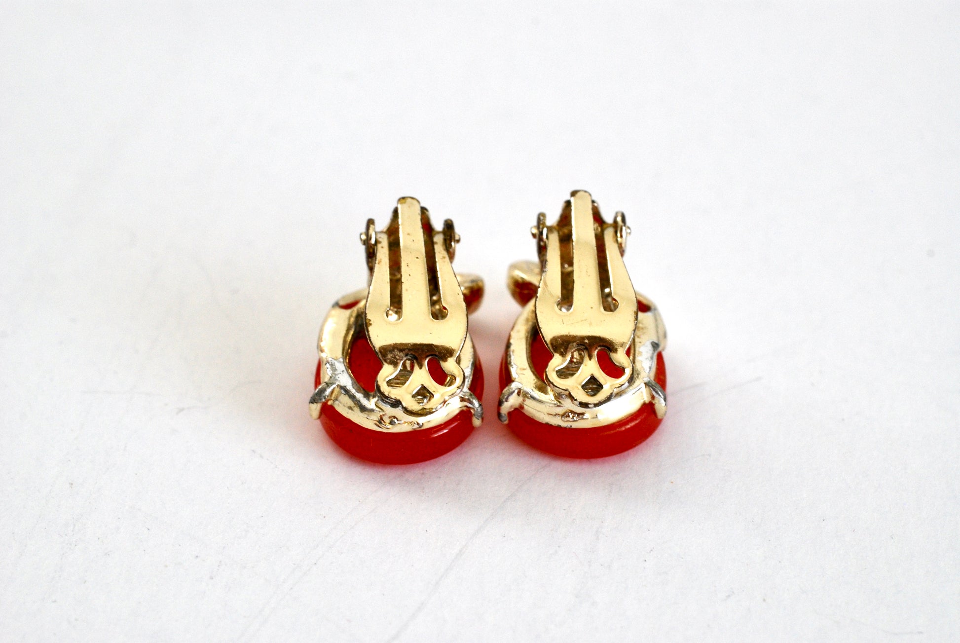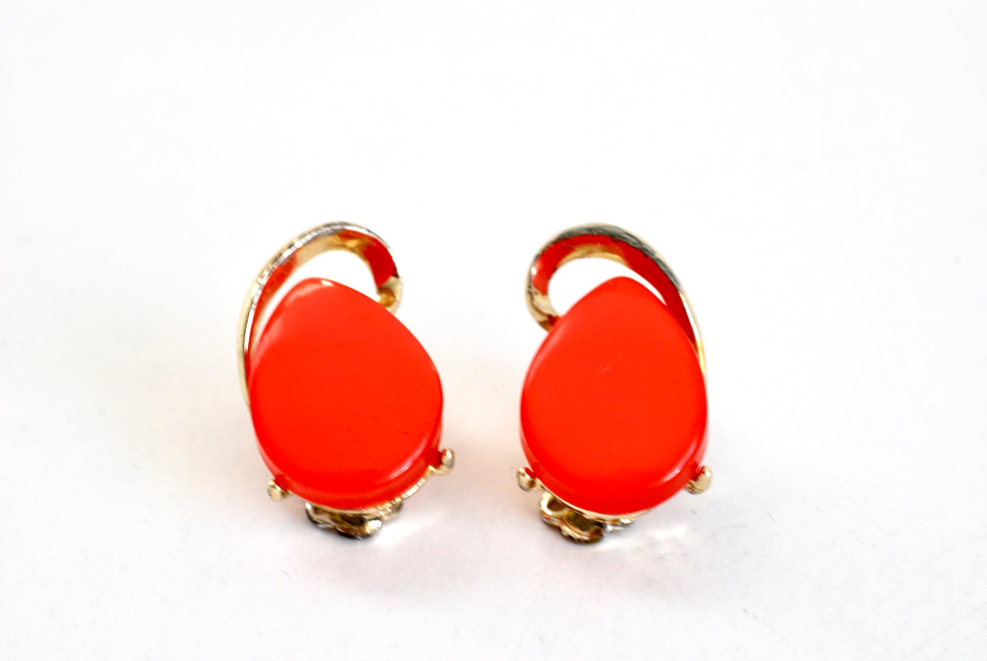 Luscious watermelon red thermoset plastic teardrop shaped earrings with gold tone swirl flourish. These vintage pot metal earrings are foiled in gold tone and feature clip on style backs. The simple large teardrop shape centerpiece is bright and bold. These have a slight iridescence which give them some depth and an extra bit of shine. From the 1960s, so they show a tiny bit of wear to the plating at the back. In overall excellent condition.