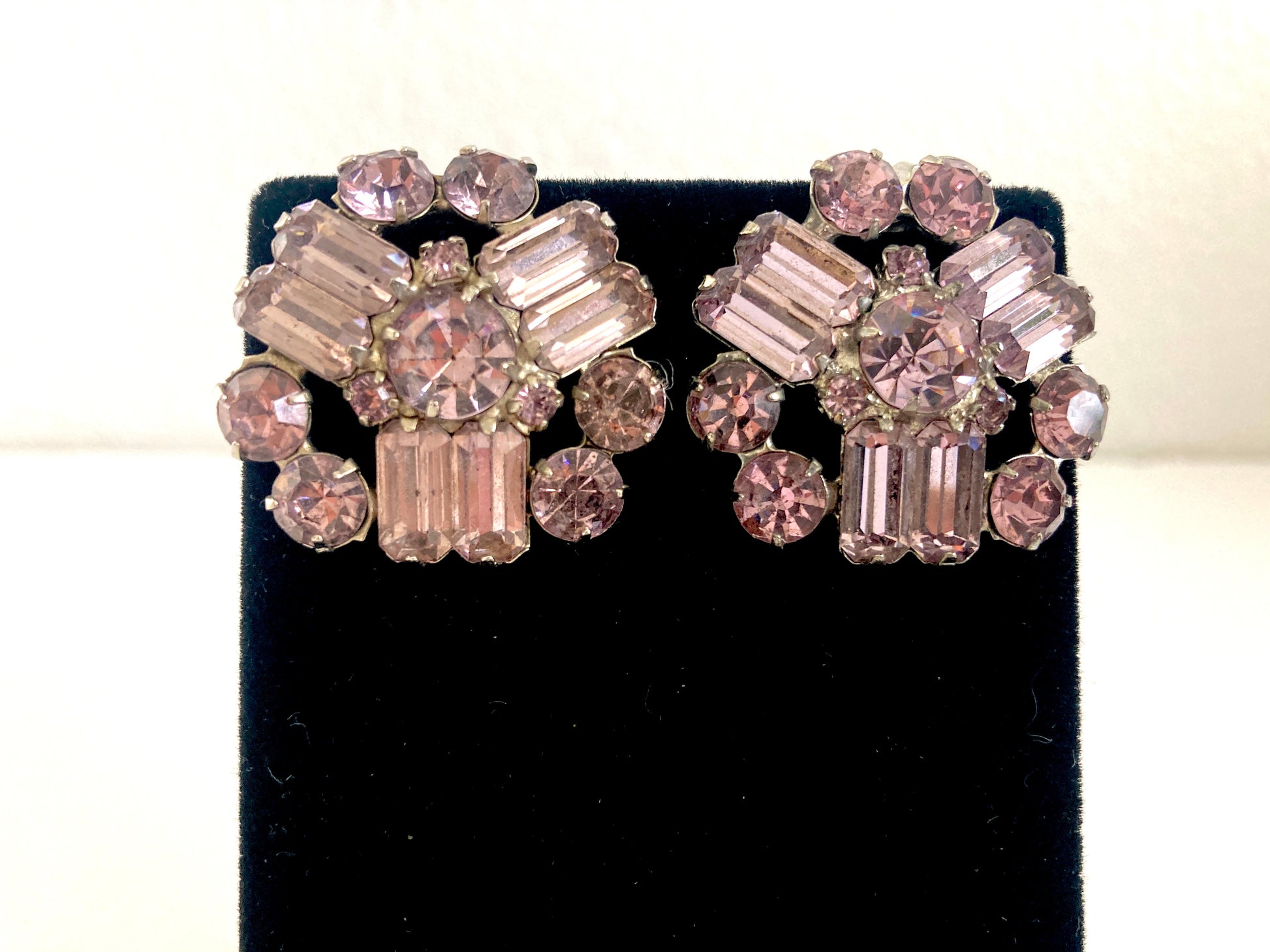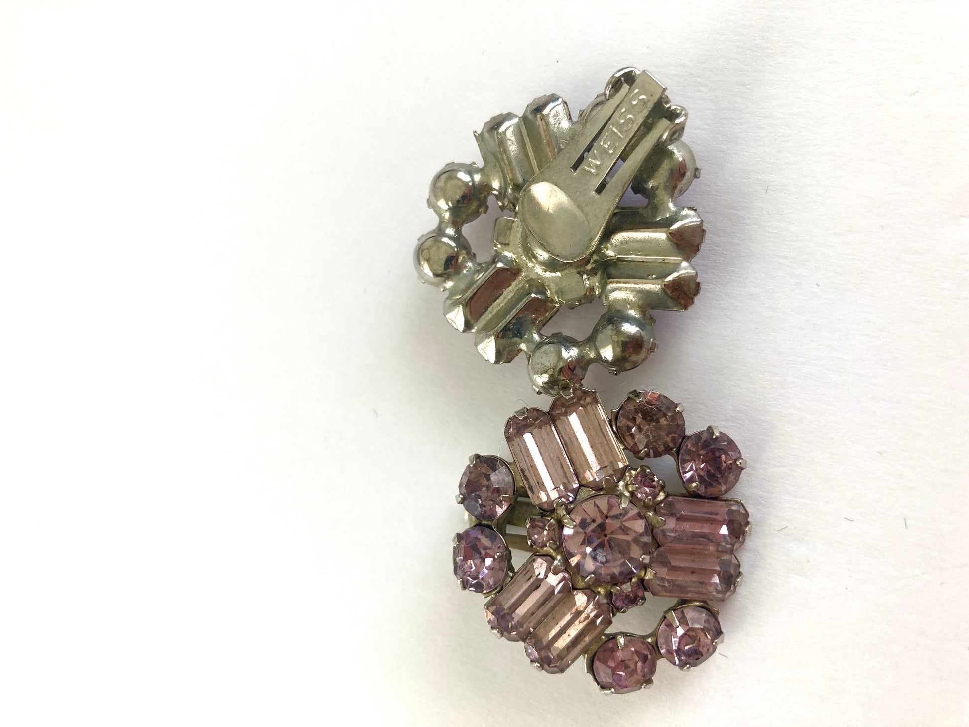 A stunning pair of soft lavender or lilac rhinestone earrings by Weiss. The clip-on earrings feature a large center stone dotted with three tiny stones and surrounded by three pairs of elongated emerald cut stones punctuated by double sets of round stones. All set on closed rhodium plated backs with clips-on closures stamped Weiss. The stones are all prong set and the earrings are in beautiful condition.