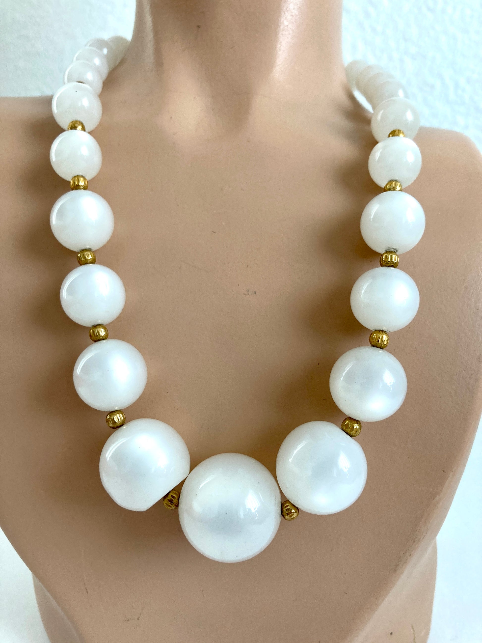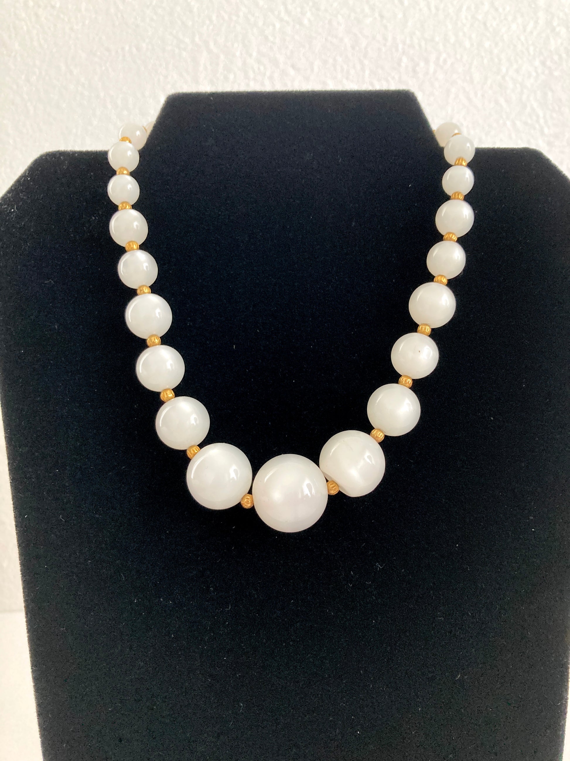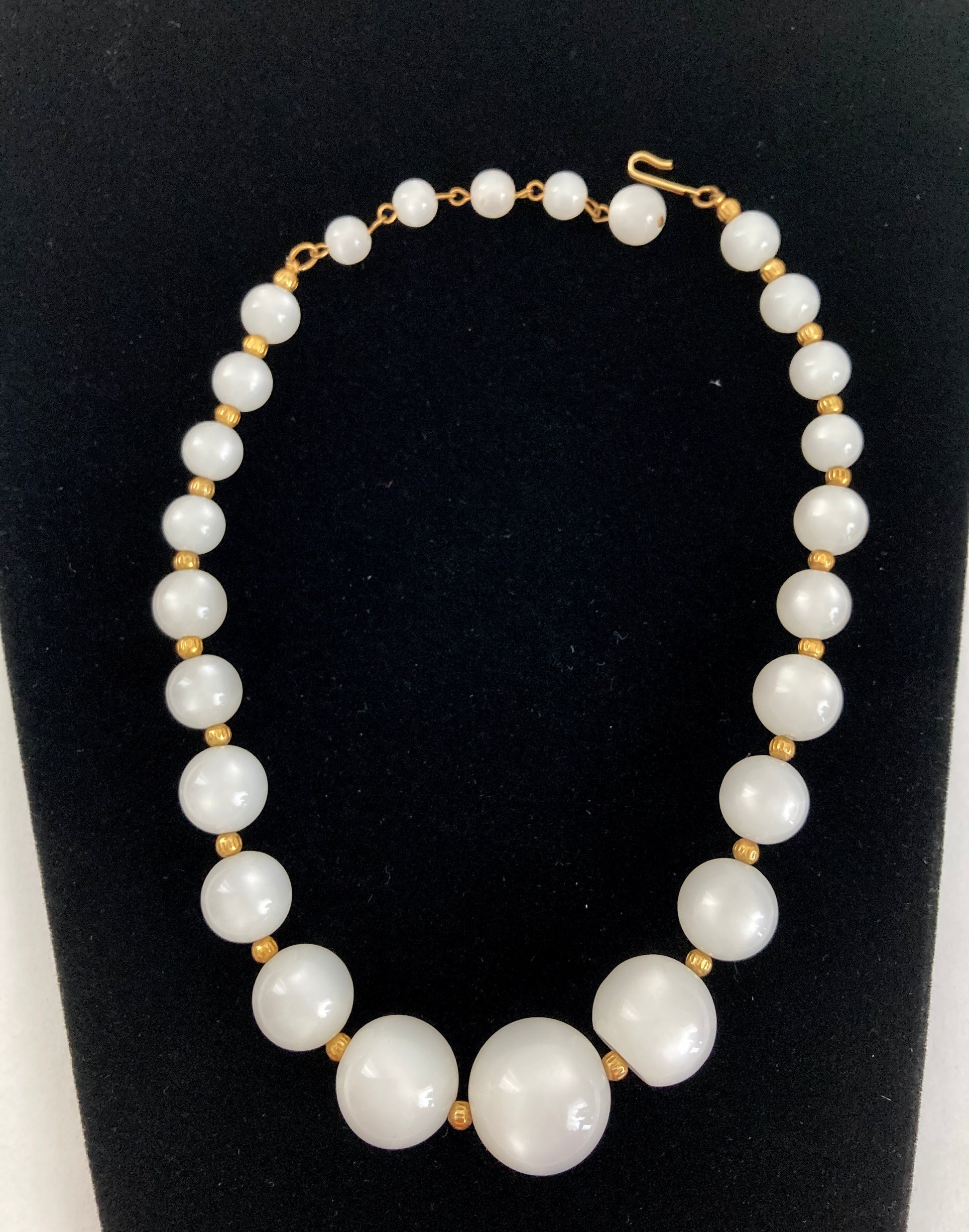 White Moonglow Graduated Bead Necklace Gold Spacers