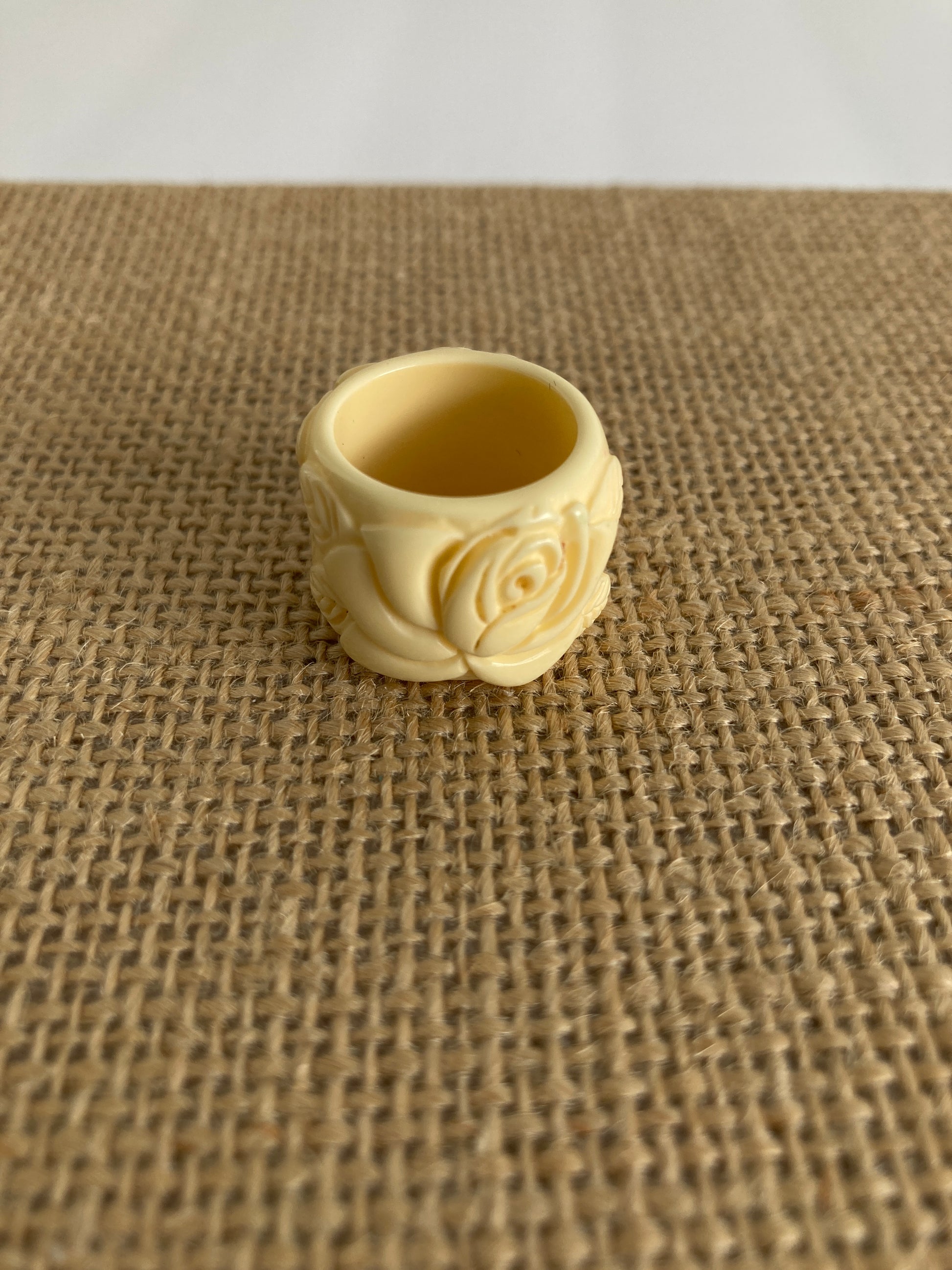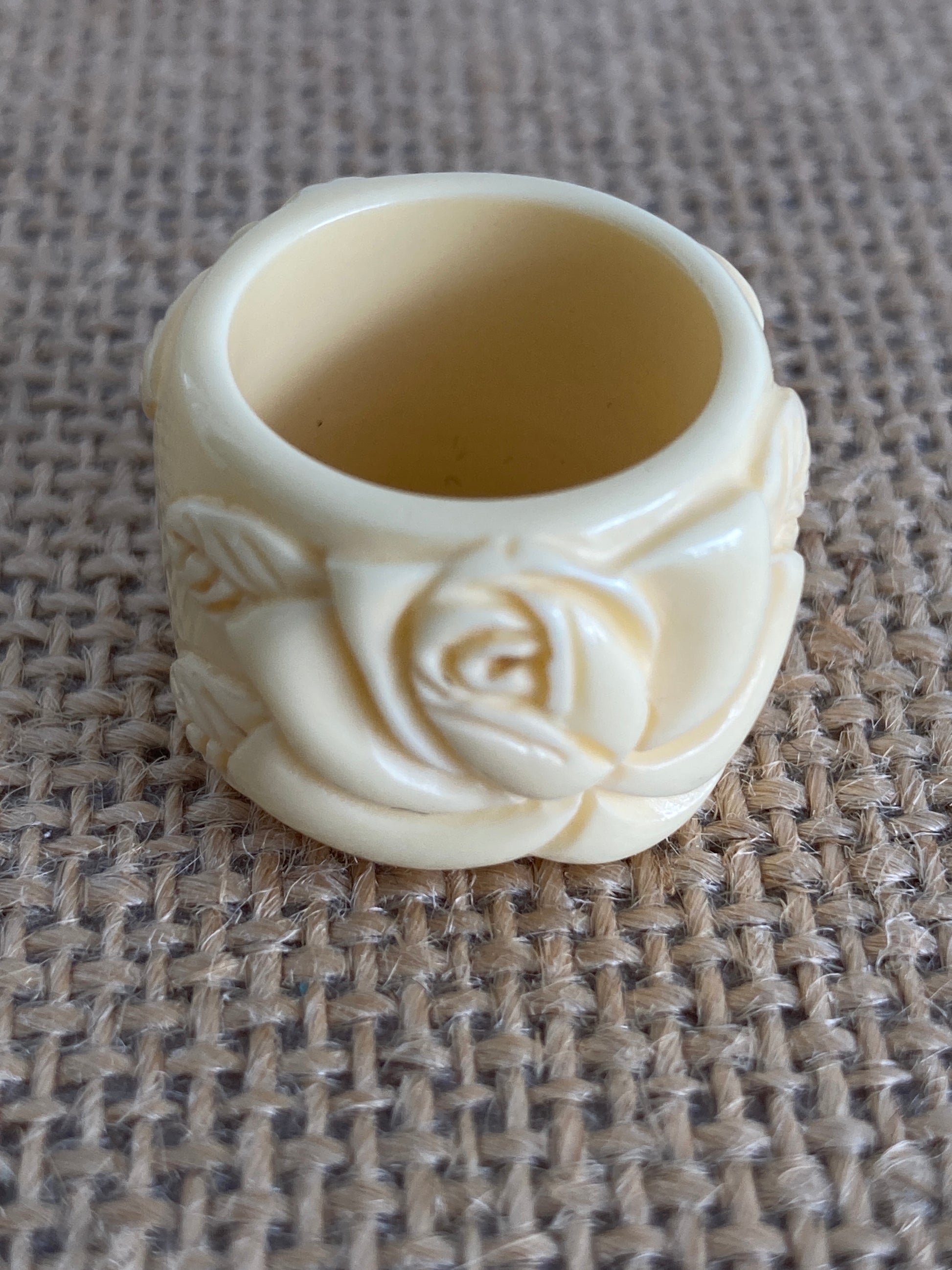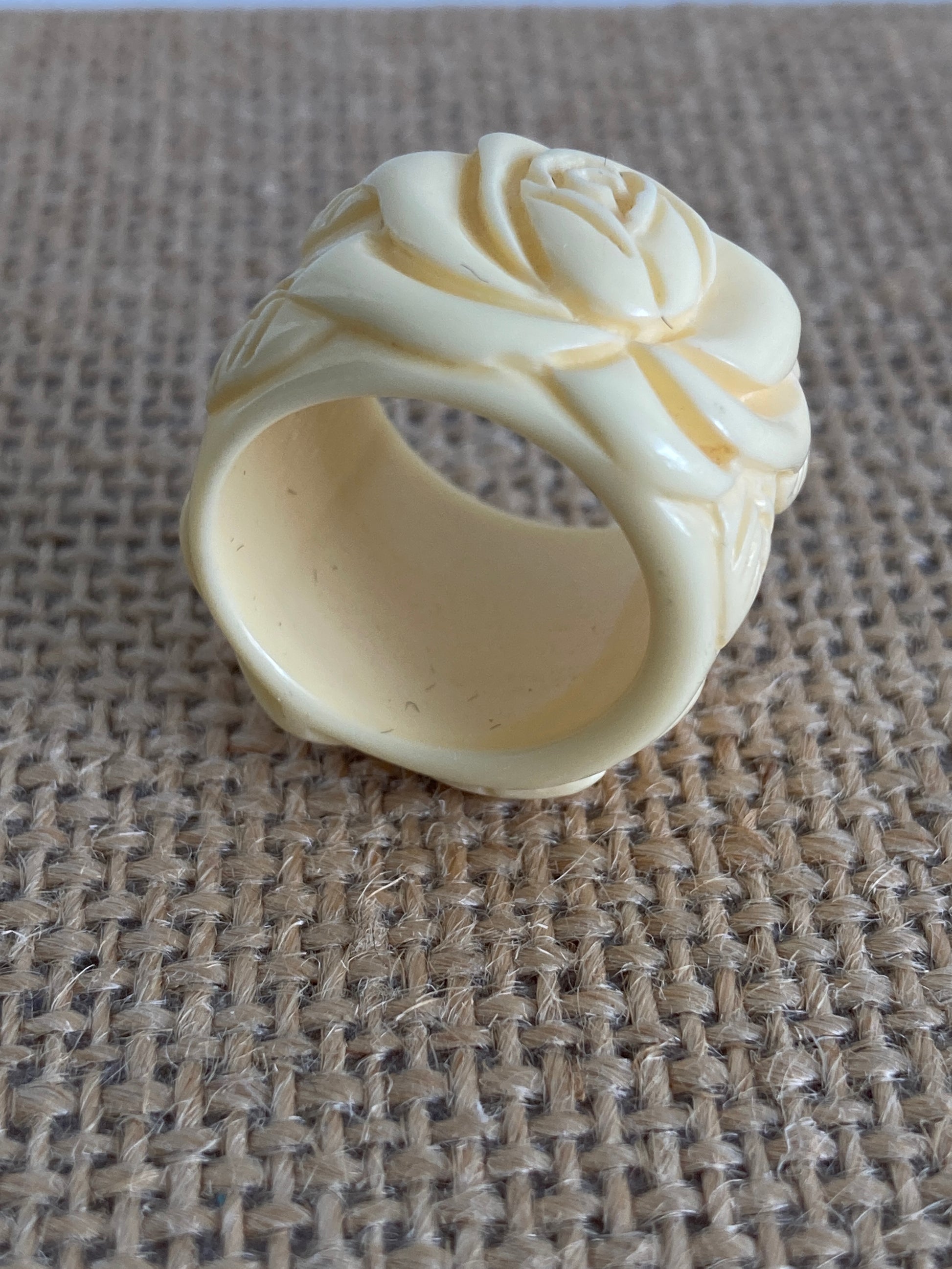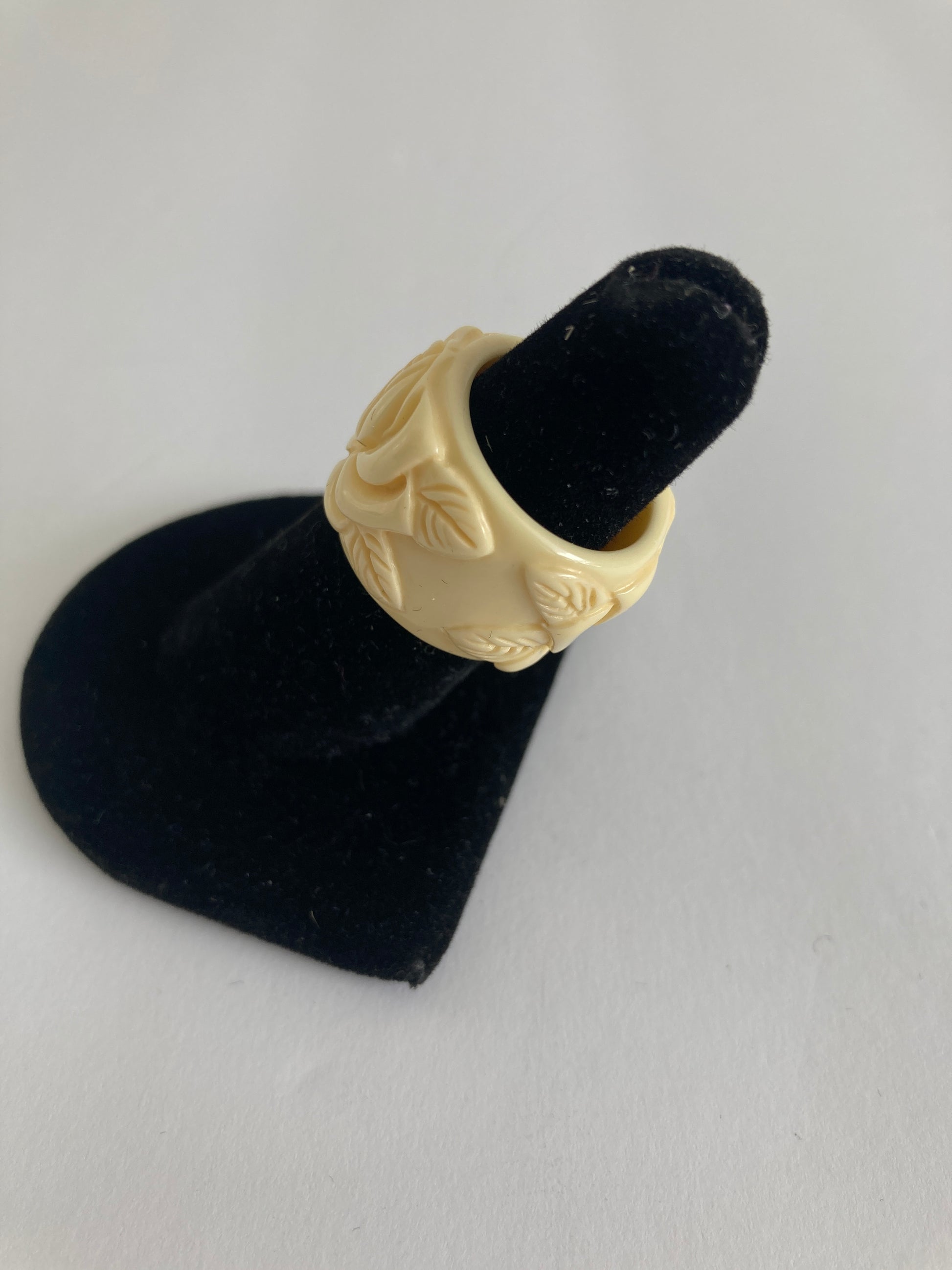 This wide cigar band style ring is made of molded lucite in a cream color. It features molded roses with leaves, one on either side of the ring. It fits approximately a U.S. size 6. There are no markings on the ring. It would work equally well as a scarf slide.